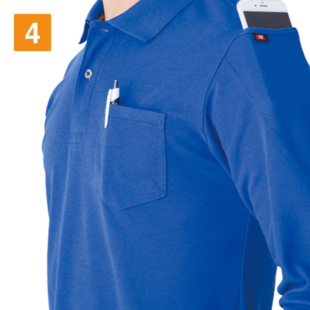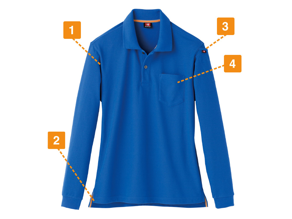 こちらの長袖ポロシャツは、脇の下のところに、消臭テープが設けられています。長時間作業すると、汗をかいて、汗臭さが気になるという人もいるでしょう。しかし、消臭テープが気になるニオイを取り除いてくれるので、作業を快適にサポートします。頑丈な素材で作られているため、繰り返し洗濯しても、破れが発生することも少ない点も特徴です。袖のところにはスリットが入っており、この部分の裏側には補強のためにオレンジテープが取り付けられています。そのため、破れにくく、長期間使用できる作業着に仕上がっています。