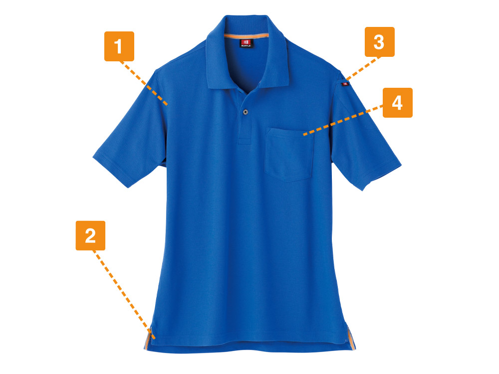 こちらの半袖ポロシャツは鹿の子編み素材で作られています。生地の表面に凹凸がこの編み方の特徴で、肌に触れる面積が少ないので、通気性を確保できます。このため、夏場の厳しい暑さの作業の中でも涼しく過ごすことが可能です。また横方向の伸縮に強く、何度洗濯しても型崩れが起こりにくくなっています。長期的に使用できるので、作業服としても最適です。制電ケア加工されており、静電気の発生を嫌うような工場で作業する際にもご使用いただけます。