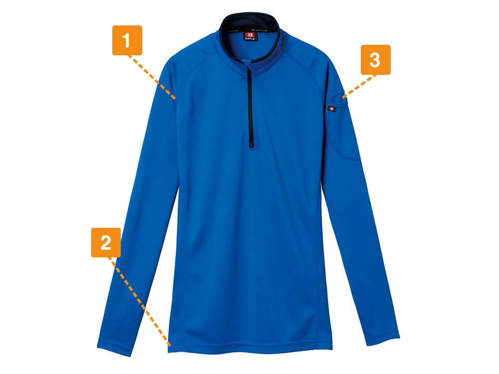 こちらの長袖ジップシャツは、基本秋冬用のモデルとして販売されています。しかし通気性も高いことから幅広いシーズンでご使用いただくことが可能です。吸汗速乾性に優れているので、春夏に多少汗をかいても不快な感じがありません。わきの下にはDEONANO-Vという消臭テープが設けられています。不快な汗の臭いをしっかり吸収してくれるので、体臭を気にする必要もないでしょう。さらにストレッチ性にも優れているので、激しい動きをしても服が窮屈に感じることなく快適に動けます。