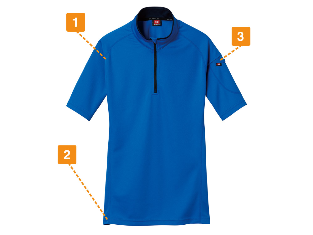 こちらの半袖ジップシャツには、マイクロドライメッシュが採用されています。通気性に優れているので、蒸し暑い厳しい現場で作業しても、汗でべたつきにくく快適性をキープします。また鹿の子編み加工によって表面に凹凸を出すことで、肌との接触面積を少ないことが特徴です。汗をかいたときに服が体につきにくく、吸汗速乾作用もあります。そのため多少汗をかいてもすぐに乾いてくれます。作業服としての機能性も十分で、あらゆる動きに対応した素材が特徴です。現場になじみやすいカラーリングなので、あらゆる方におススメの一着となります。