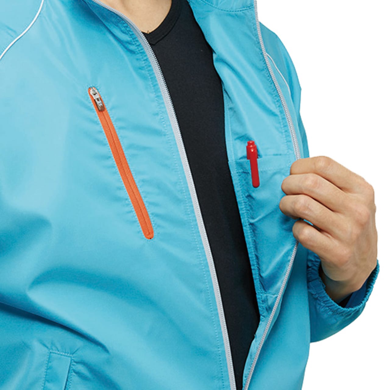 この「ブルゾン」の特徴は、ポケットに特殊な加工を施すことにより、ポケットから物を落としにくくしているという点です。作業に必要なアイテムをポケットによく収めるという方にもおすすめです。また、生地の表面には撥水加工が施されているので、降雨時の作業も気になりません。サイズはSSから4Lまで展開していますが、SSとSサイズはユニセックス対応シルエットを採用しているため、幅広い方に着用していただけます。