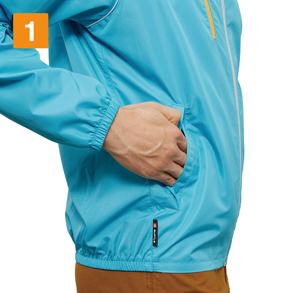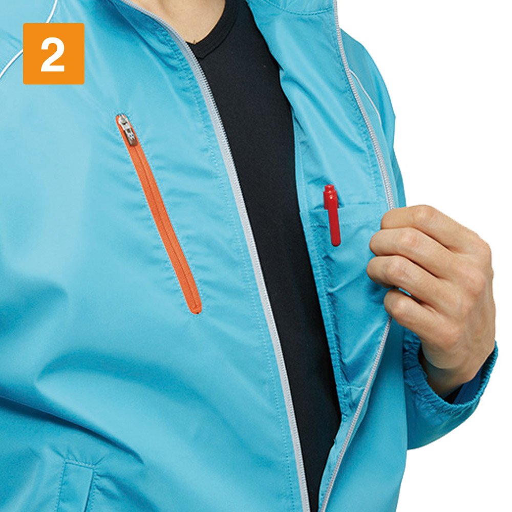 ポケットに収納しておいたアイテムを落としてしまうのには、ポケットの「つくり」に問題があるかもしれません。一般的なポケットは落下防止の加工がされていないため、ポケットから物が落ちやすくなっています。しかしこの「ブルゾン」のポケットは「逆玉ポケット」になっていて、物が落ちにくく仕上げられているので、作業中に物を落としやすいという方におすすめしたいブルゾンです。また、生地には撥水加工が施されているのもポイントです。屋外作業の途中で小雨が降ってきたとしてもしっかり撥水するので安心です。
