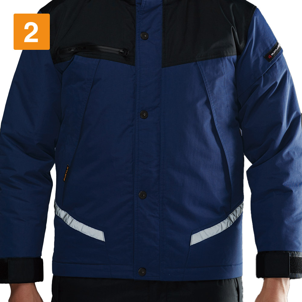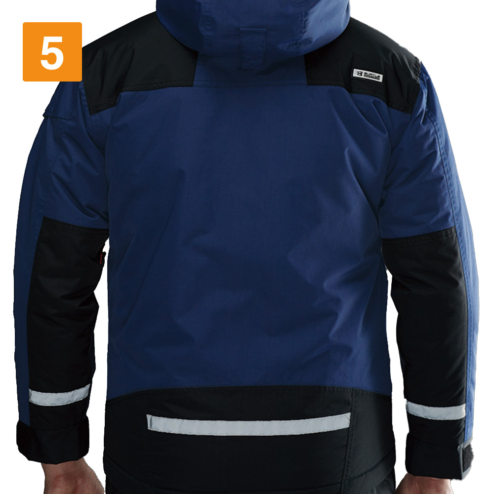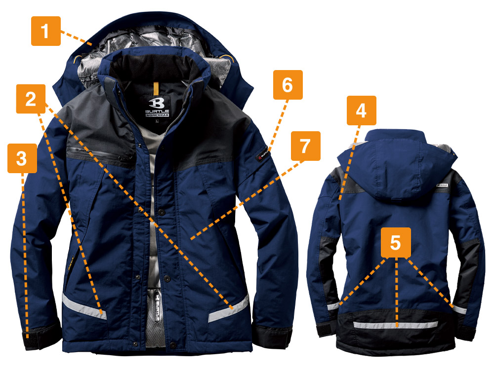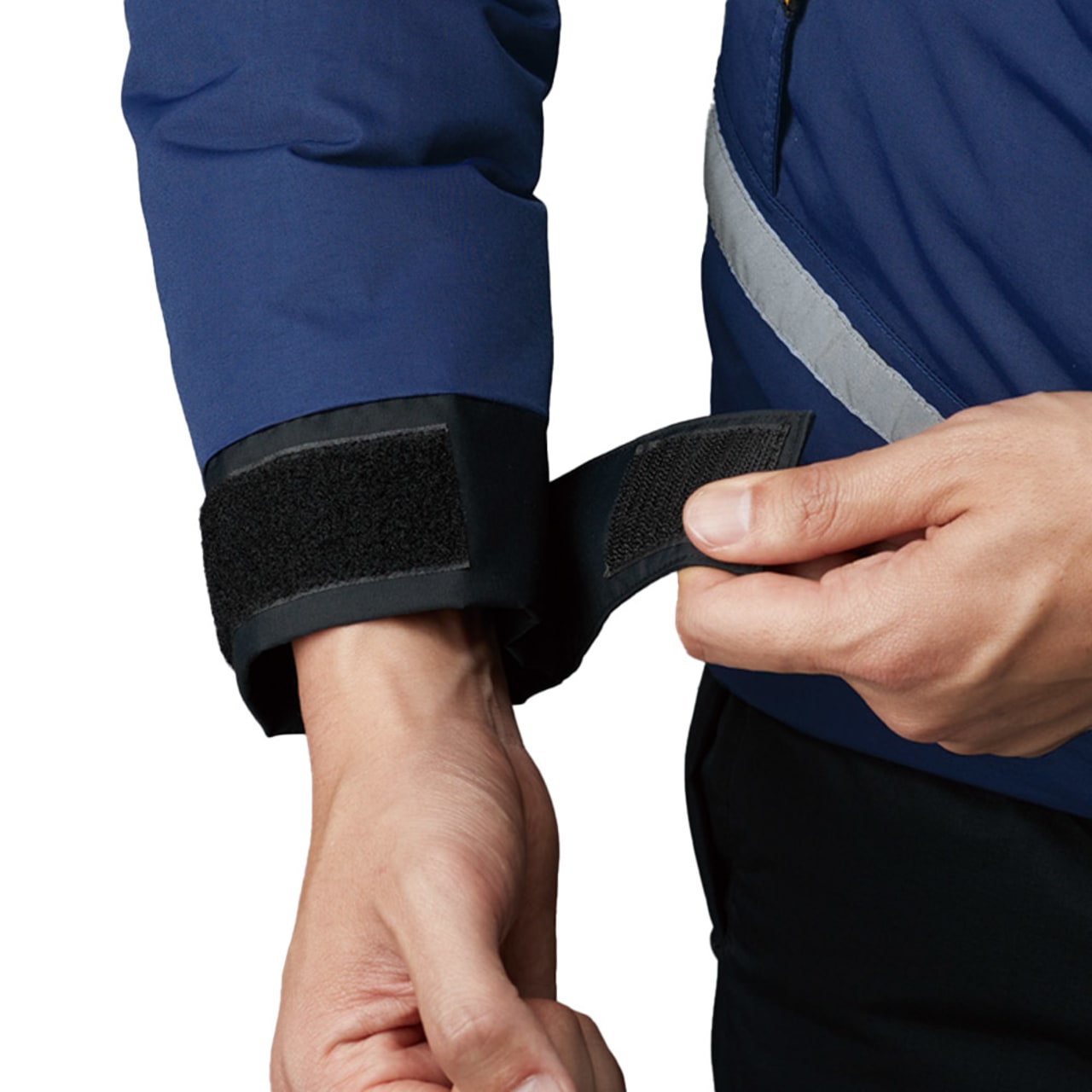 この防水防寒ジャケットの特徴として耐水圧の高さがあげられます。10,000mmの耐水圧は一般的な雨であれば十分に耐えられることを示しています。また、透湿性にも優れていて、作業中に発生する不快なムレの原因となる水分をジャケット外に放出してくれます。さらに、ジャケット下部、袖先端部にはリフレクター(反射材)が取り付けられていて、夜間でも安全に作業できます。