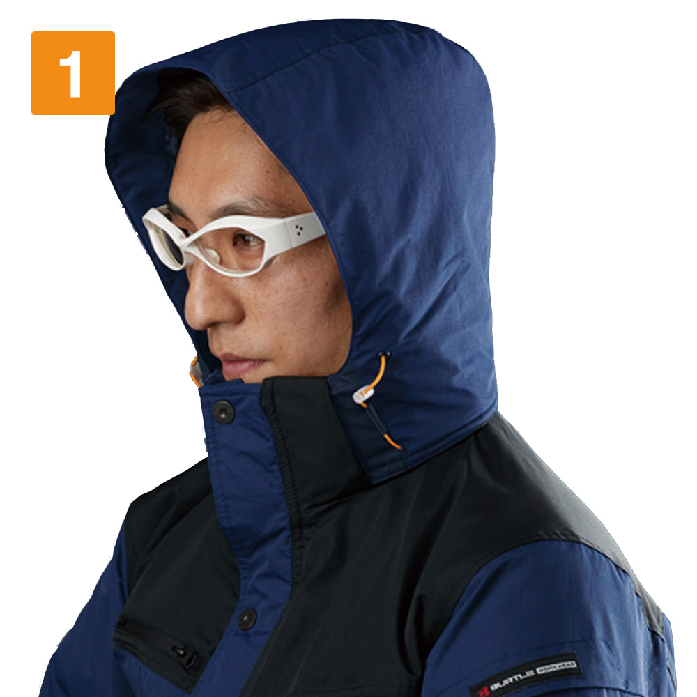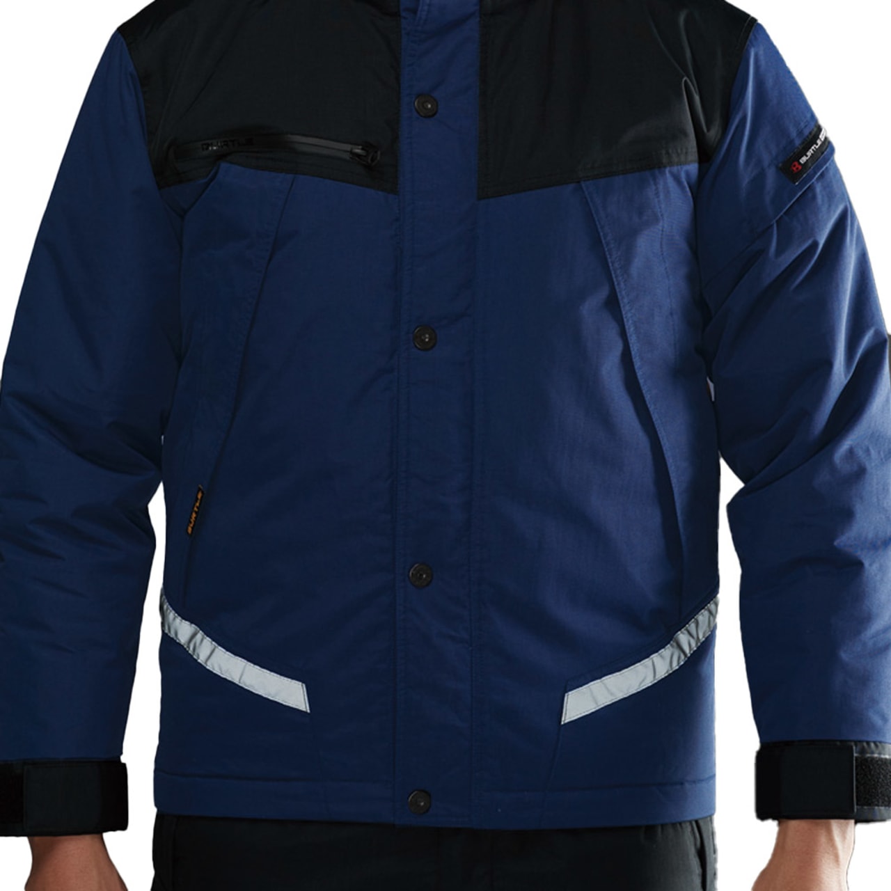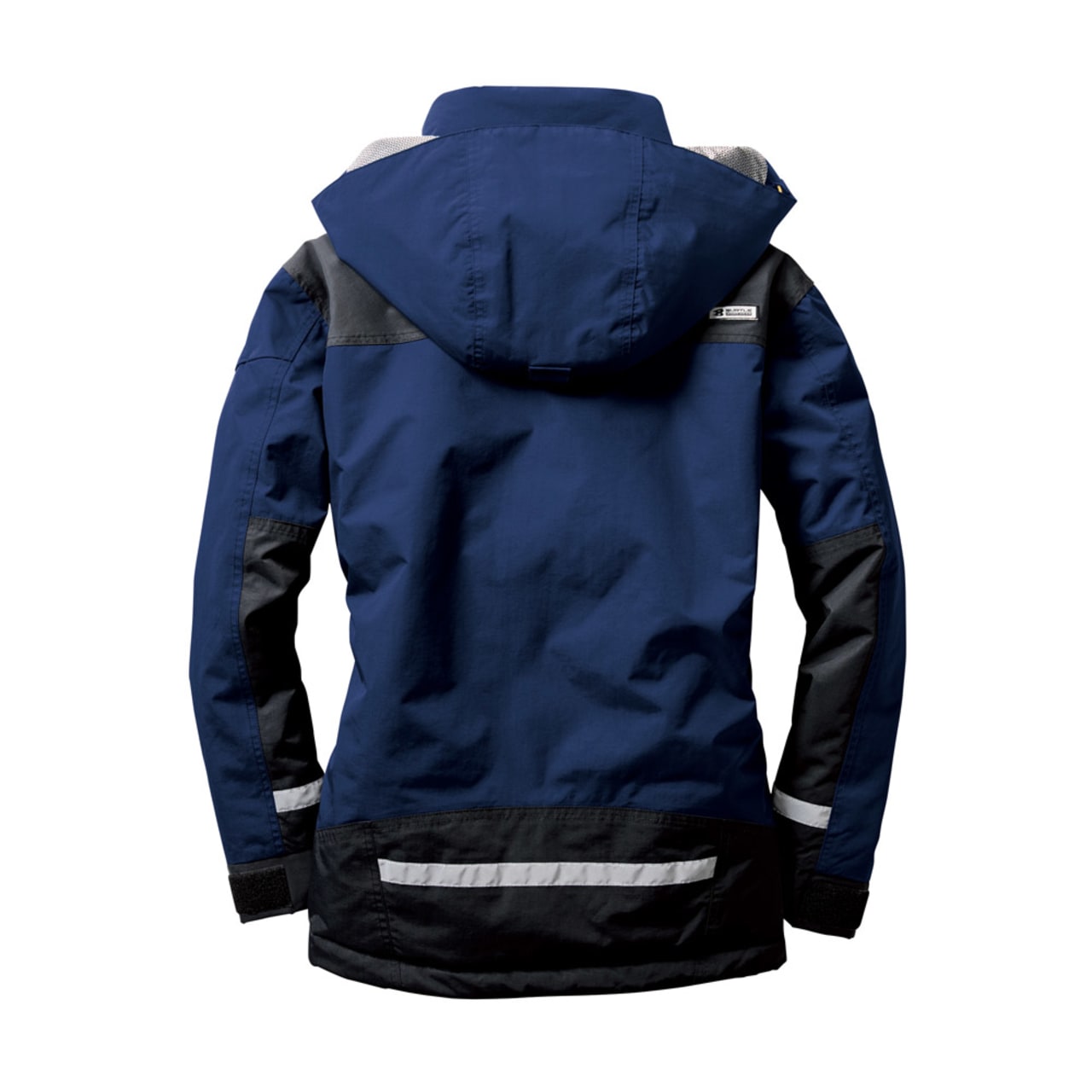 この防水防寒ジャケットの特徴として耐水圧の高さがあげられます。10,000mmの耐水圧は一般的な雨であれば十分に耐えられることを示しています。また、透湿性にも優れていて、作業中に発生する不快なムレの原因となる水分をジャケット外に放出してくれます。さらに、ジャケット下部、袖先端部にはリフレクター(反射材)が取り付けられていて、夜間でも安全に作業できます。