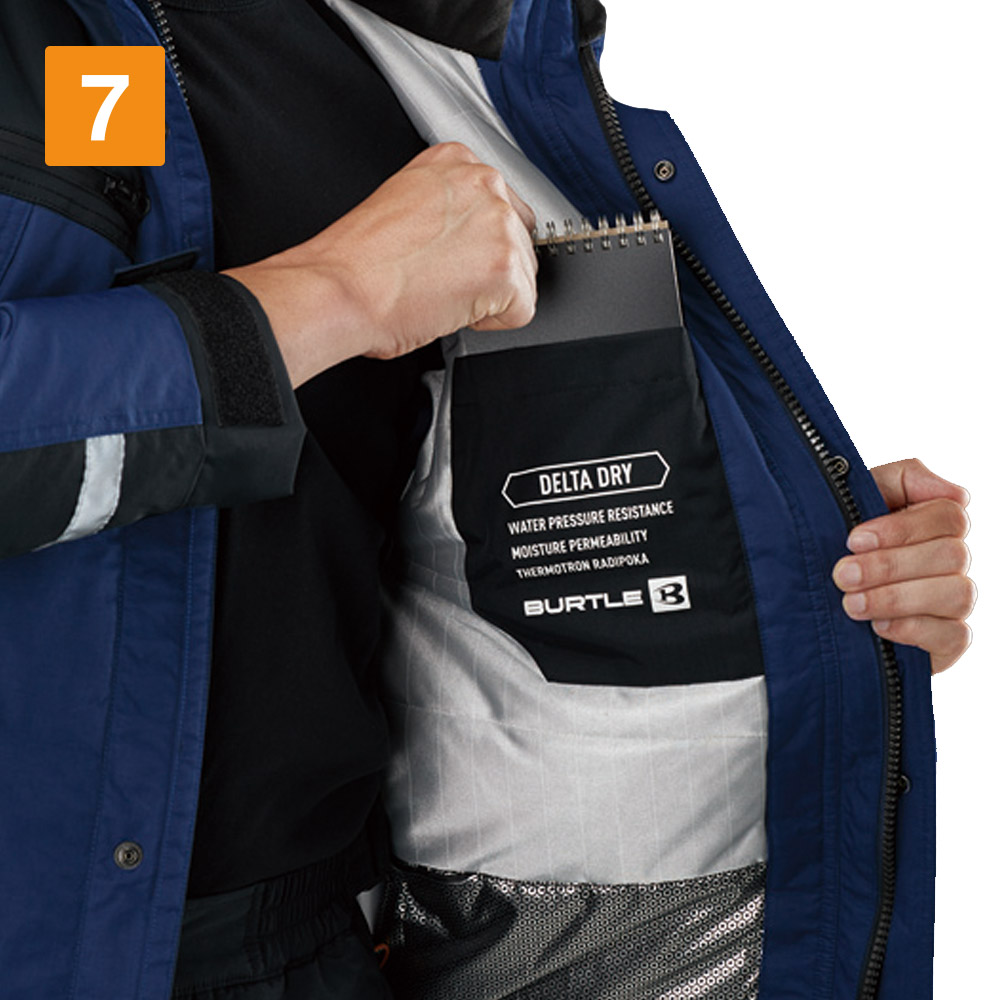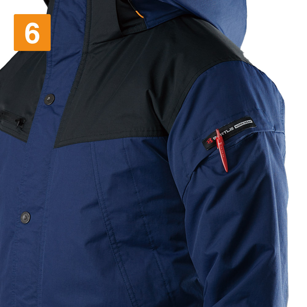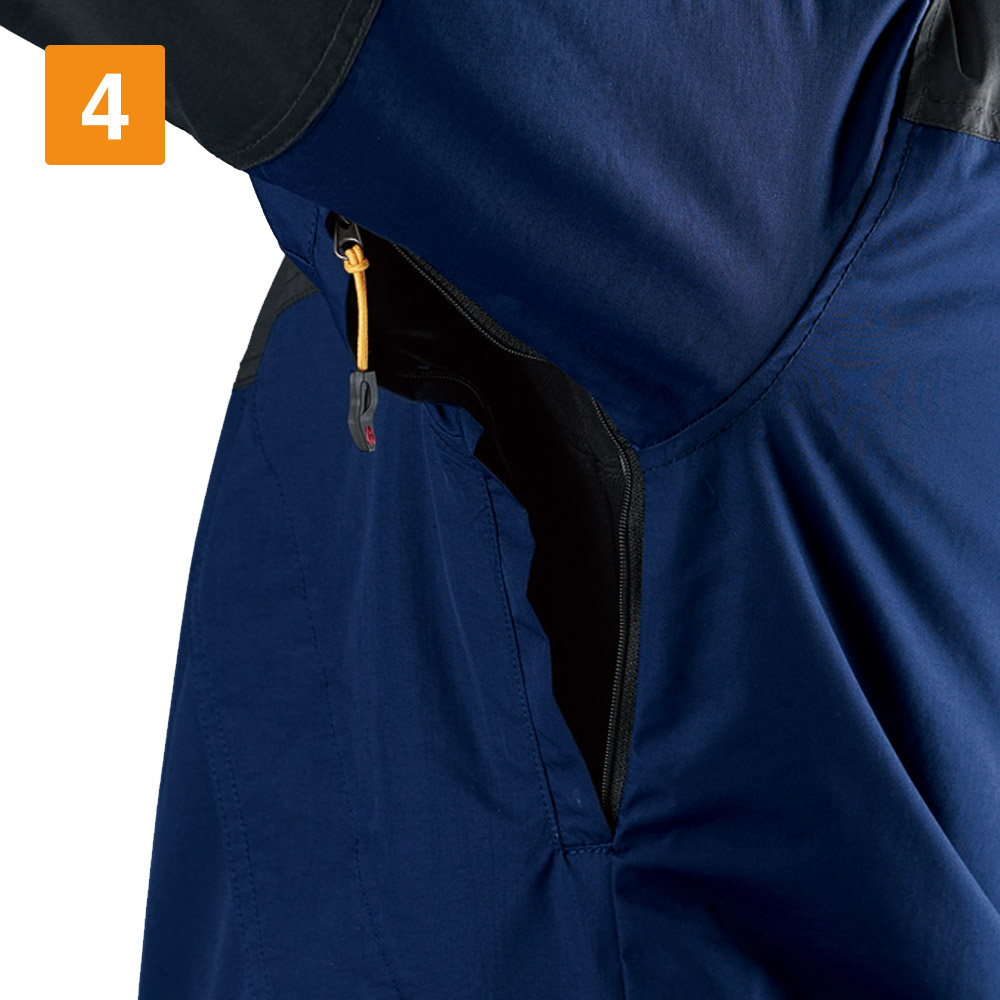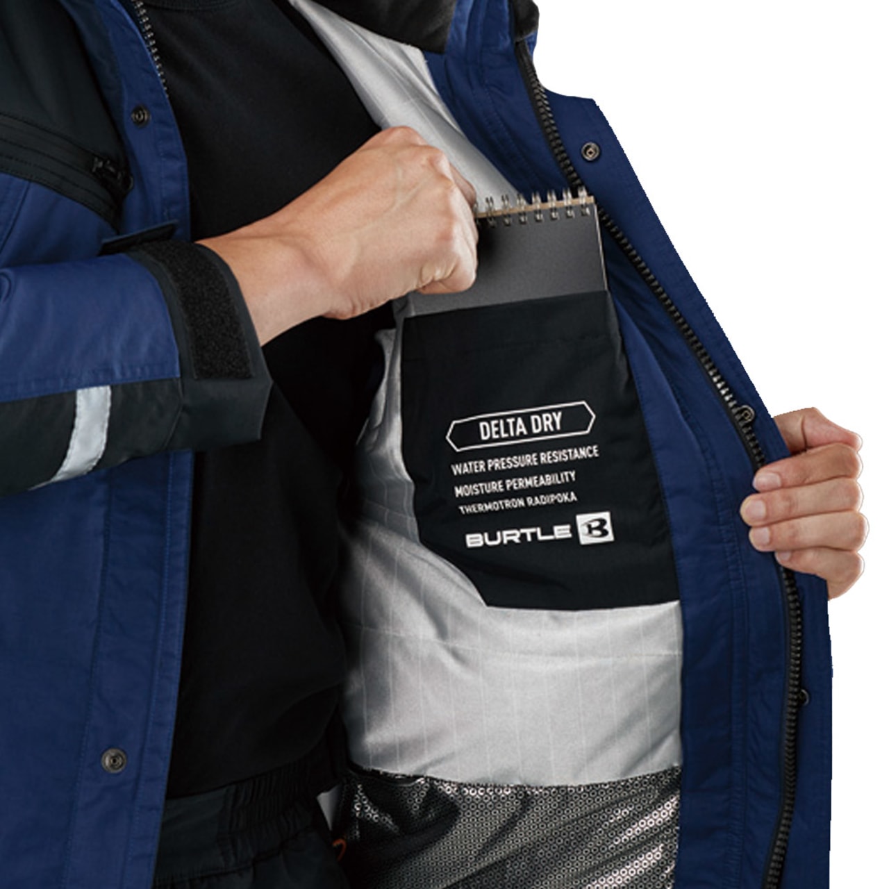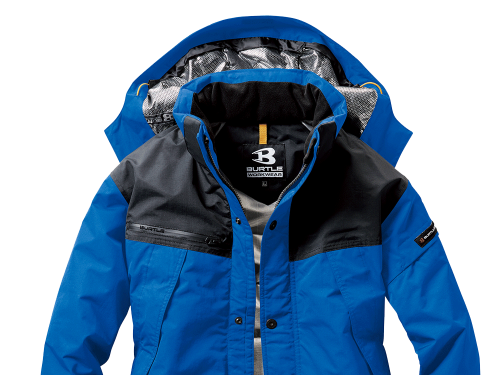 屋外作業中に急に雨が降ってきてウェアの内部までずぶ濡れになってしまった、そんな経験をした方もいるのではないでしょうか。耐水圧の低いウェアは雨に弱いため、ある程度の強い雨が降ってくるとウェア内部まで雨水が染み込んでしまいます。しかしこの防水防寒ジャケットであれば、耐水圧が10,000mmとなっているため、一般的な大雨が降ったとしても浸水しにくくなっています。加えて生地の縫い目にシームテープを取り付けることにより、より防水性を高めています。また、防水性だけでなく透湿性に優れているのもこのジャケットの魅力です。ジャケット内の水蒸気を放出しやすくすることにより、ムレを防ぎます。