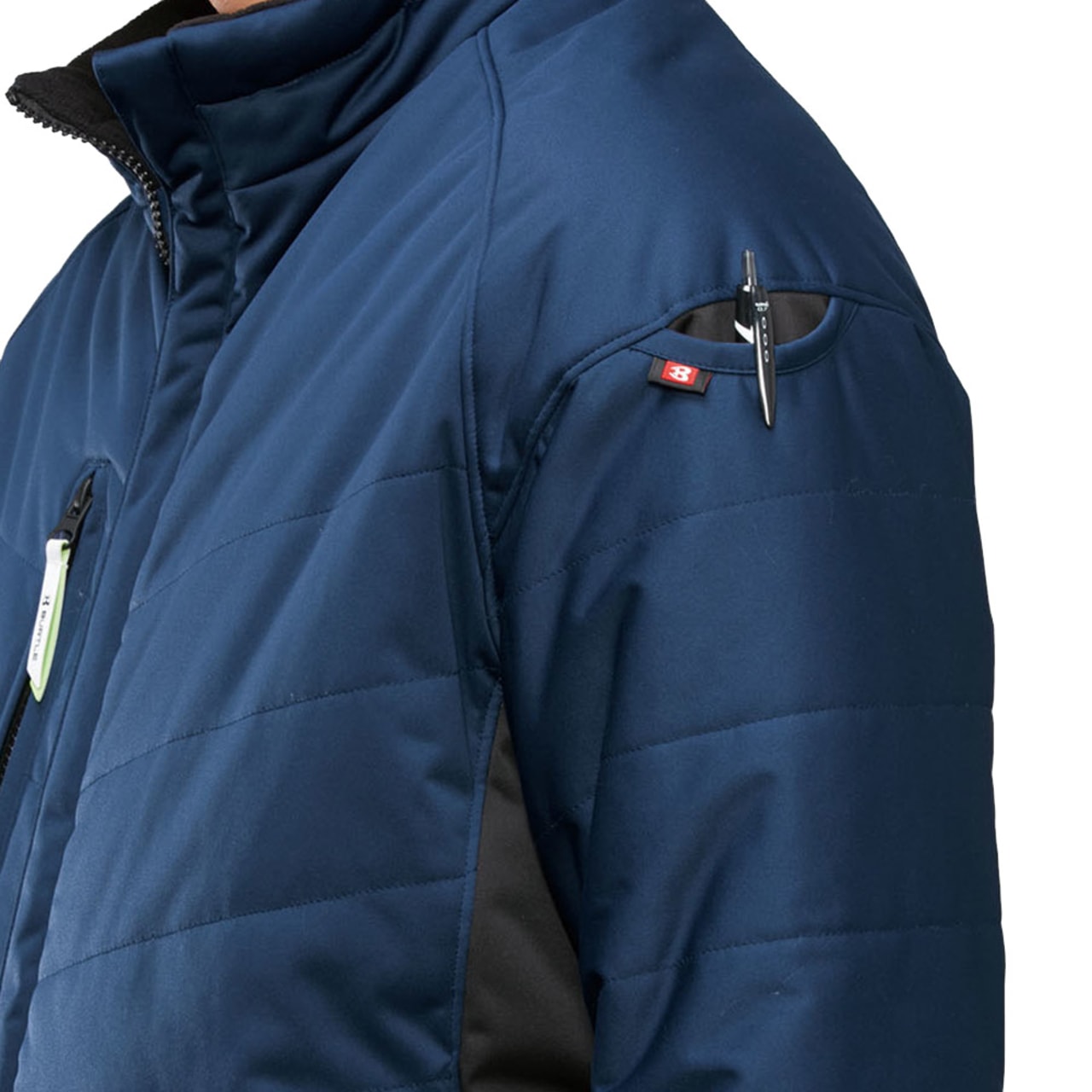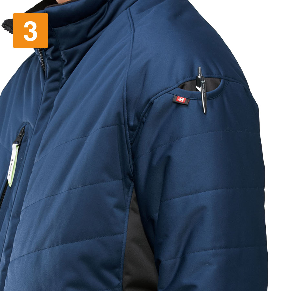 軽量素材で体への負担が軽く、ストレッチ素材で作業の動きがスムーズです。表生地はニットストレッチとラミネートコーティングにより、作業時の動作を快適にしながら、保温性を高めています。撥水加工もあるので、多少の雨にも対応可能です。やや細身のデザインで、丈はウエストより少し下のラインのため、上半身にフィットしやすいでしょう。コンパクトなブルゾンは、作業中に邪魔になりにくい特徴があります。キルティング仕様ですが中綿は入っておらず、着膨れせずスッキリしたデザインです。ポケットは、両脇、胸、内側、袖に付いており、作業中に必要な小物を持ち歩けます。