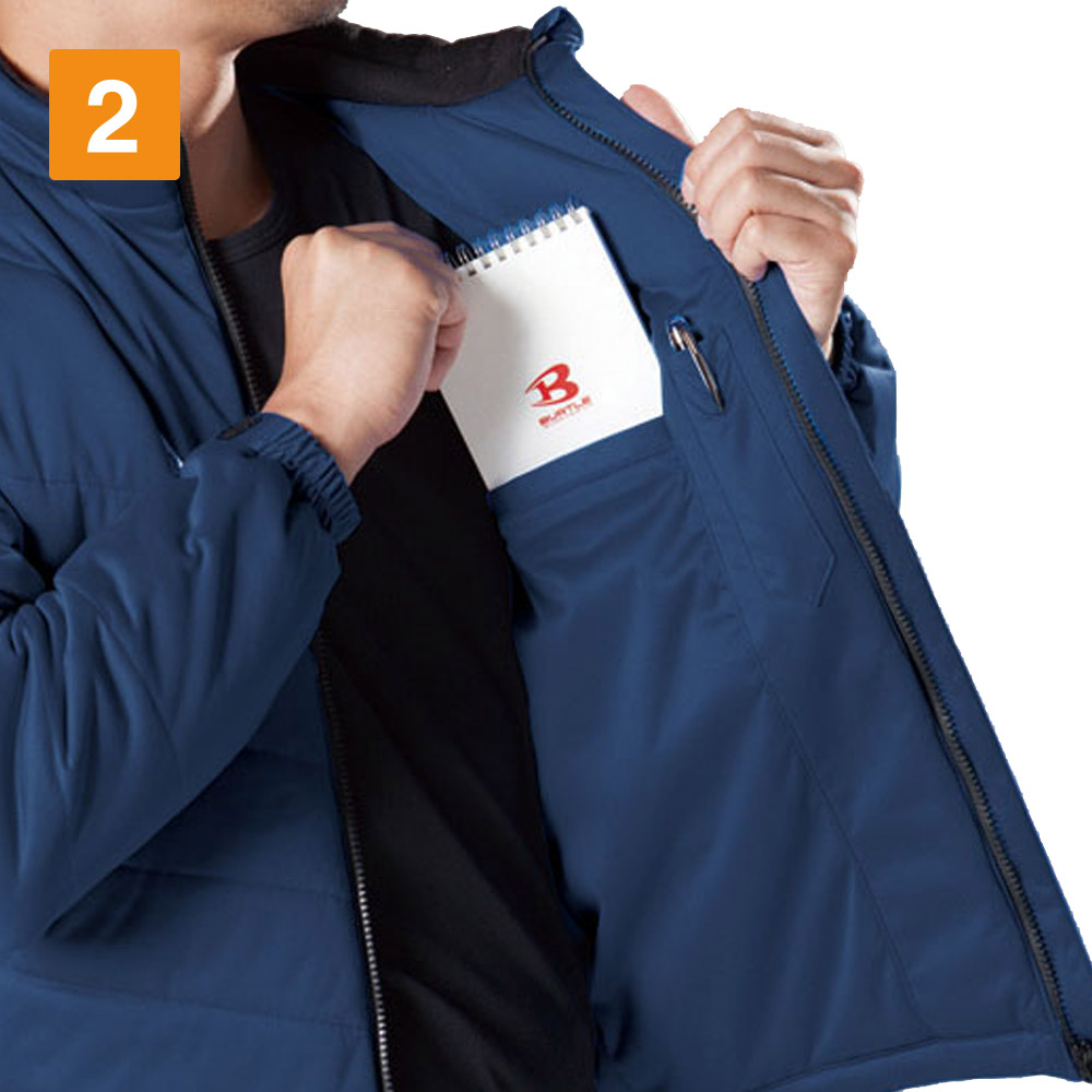 屋外の作業で氷点下まで気温が下がる環境なら中綿入りが必要ですが、そこまで下がらないなら風を防ぐ機能で十分な場合があります。防風ストレッチ軽ブルゾンのように中綿なしで防風素材なら、作業中の動きがスムーズです。さらに外生地にニットを使用しているので、動きの快適性を高めたいシーンにおすすめです。表生地は撥水加工入りで、雨に濡れてもブルゾン内部への水の染み込みを防止します。体が濡れると体温を奪う原因となるので、屋外での作業用にブルゾンを選ぶなら、防水タイプがおすすめ。ブルゾンの衿と背裏はマイクロフリース素材を使っており、肌に当たってもひんやりしにくい仕上がりです。