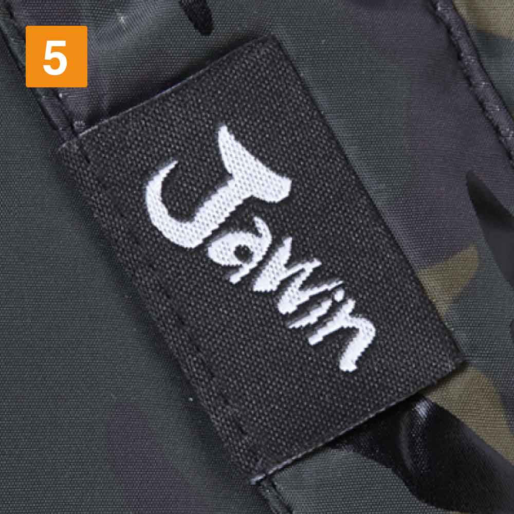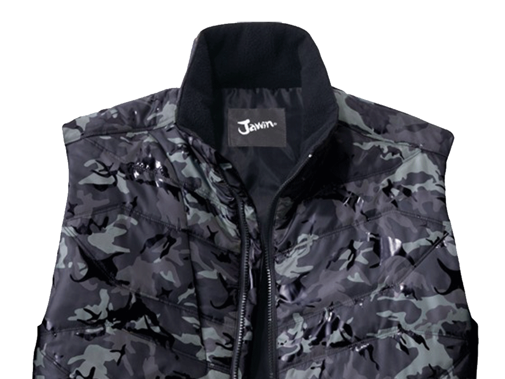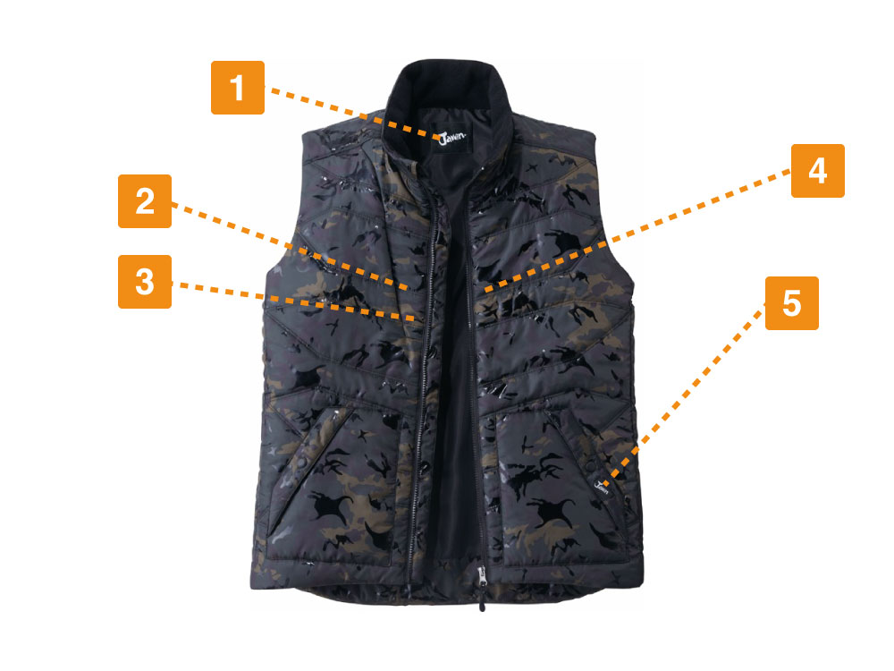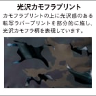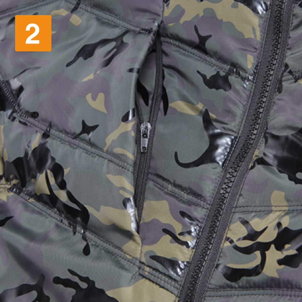 この防寒ベストの特徴は、収納面が充実していることにあります。右身頃内ポケット、左身頃内ペン差し、胸ファスナーポケット、そして全面両サイドにもポケットがついているので、野帳などの作業に必要なツールを幅広く収納することができます。また、カモフラプリントの上にラバープリントを転写することにより、オリジナリティある光沢カモフラプリントに仕上げているのも、このベストの他の製品には無い特徴と言えます。