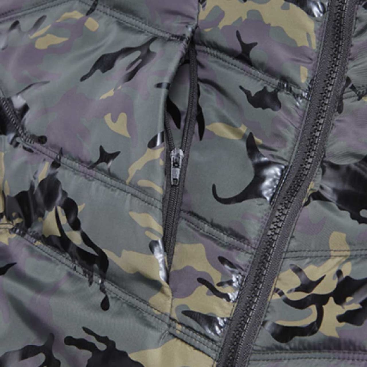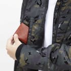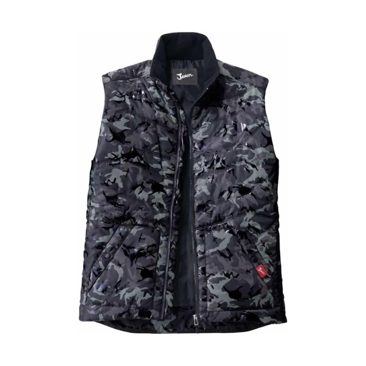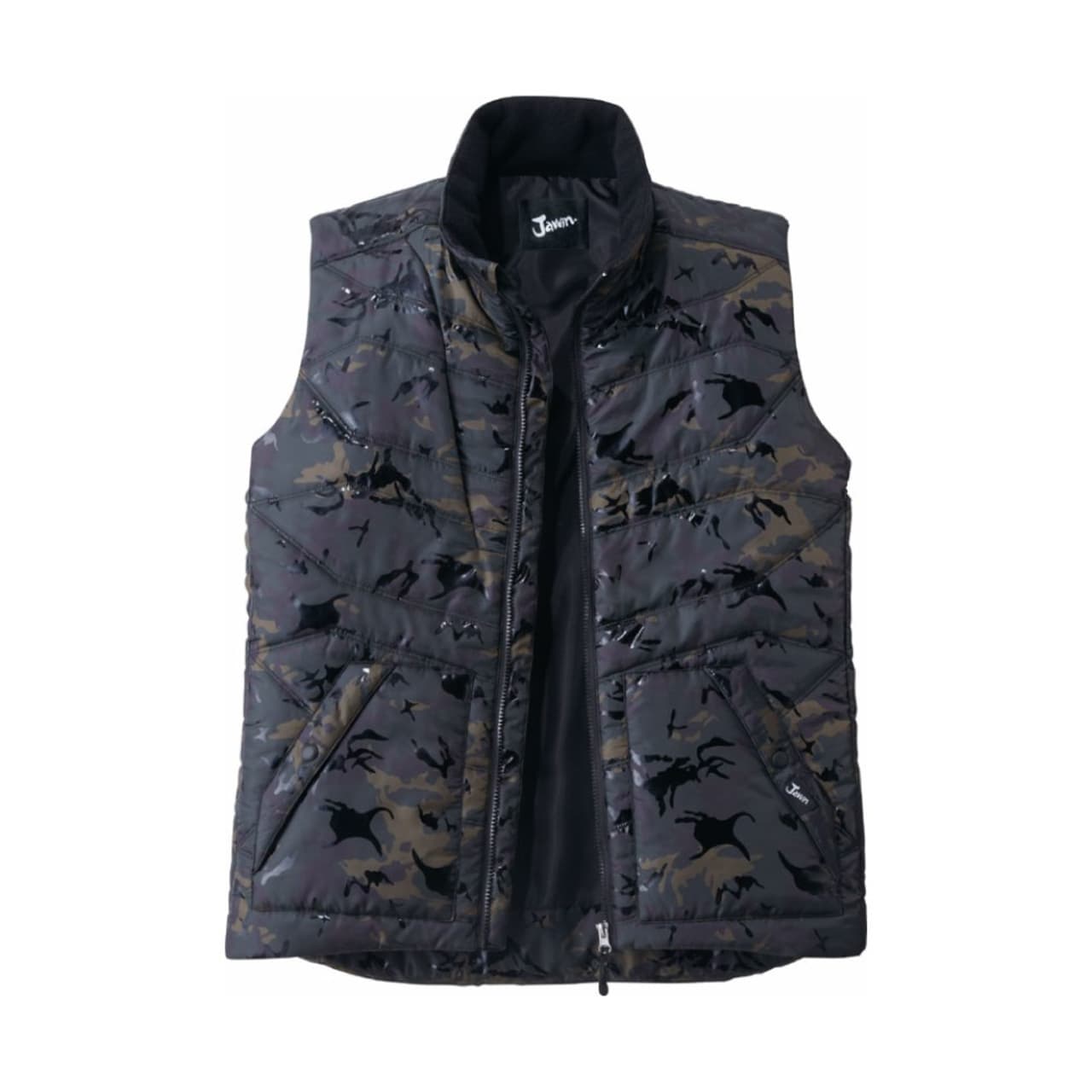 この防寒ベストの特徴は、収納面が充実していることにあります。右身頃内ポケット、左身頃内ペン差し、胸ファスナーポケット、そして全面両サイドにもポケットがついているので、野帳などの作業に必要なツールを幅広く収納することができます。また、カモフラプリントの上にラバープリントを転写することにより、オリジナリティある光沢カモフラプリントに仕上げているのも、このベストの他の製品には無い特徴と言えます。