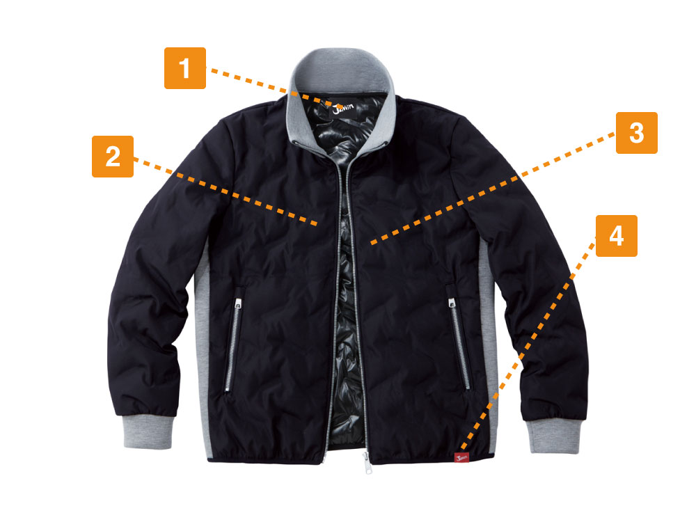 防寒ジャンパーの特徴はやはり、シームレス加工にあります。シームレス加工とは、生地の表面に縫い目(ステッチ)を出さない加工のことであり、縫い目のほつれを防ぎます。中綿が入っているアイテムの場合、縫い目がほつれてしまうと、そこから中綿がはみ出してしまう可能性があります。一度はみ出した中綿は、戻すのが困難な上、ほつれた部分は縫直しが必要になります。しかしこの防寒ジャンパーなら、中綿がはみ出す心配がありません。