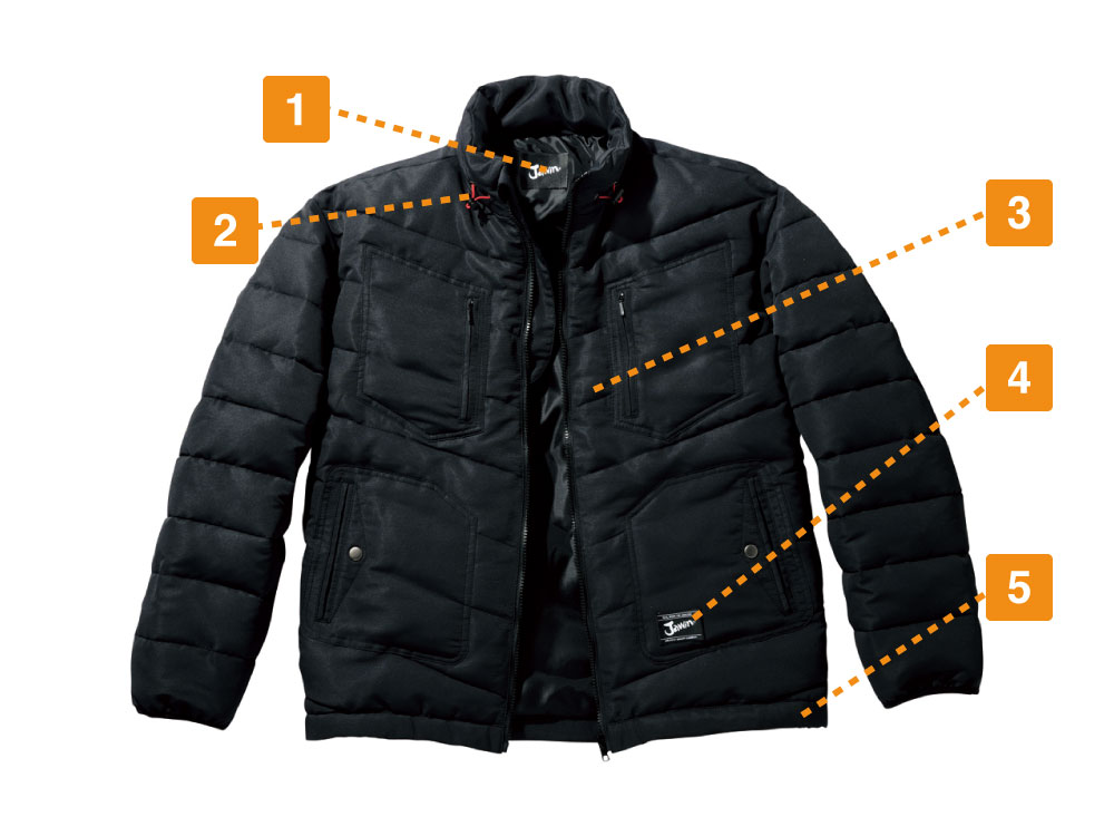 この防寒ジャンパーの特徴はやはり衿と裾部分に設けられたドローコードでしょう。このドローコードを使うことにより、ジャンパー内の温度を調整することができます。暑い日は緩め、寒い日は締めることにより、どんな天候でも快適に作業を進められます。また、ポケットがたくさんついているのも特徴の一つ。内ポケットはもちろん、両胸ポケット、両脇ポケットがあつらえてあるので、作業に必要な小物をジャンパー内に複数しまうことが可能です。