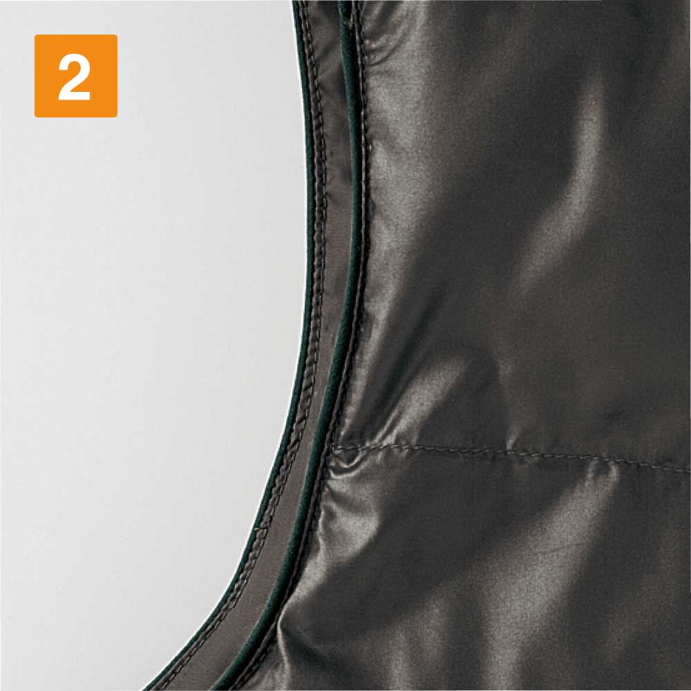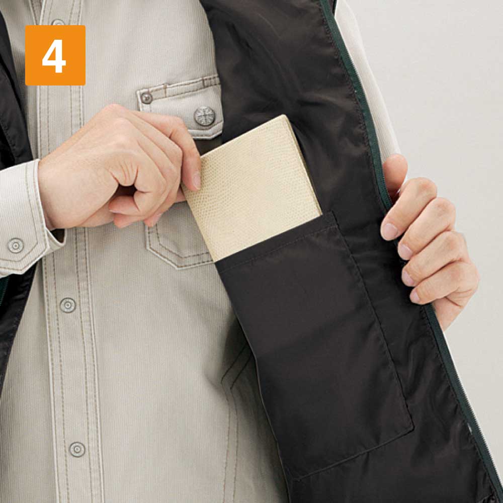 この商品の特徴は広く作られた袖口にあります。通常のベストはここまで袖口を広く設けていないため、重ね着するウェアの厚みによっては窮屈に感じてしまいます。窮屈なままでは作業効率が落ちてしまうので問題ですよね。しかしこの防寒ベストは袖口が広く作られているので、重ね着しても窮屈さを感じることはありません。また、袖口はパイピング加工が施されているので耐久性にも優れています。袖口以外には内ポケットや胸ポケット、両脇ポケットなどの収納が充実しているのも特徴です。
