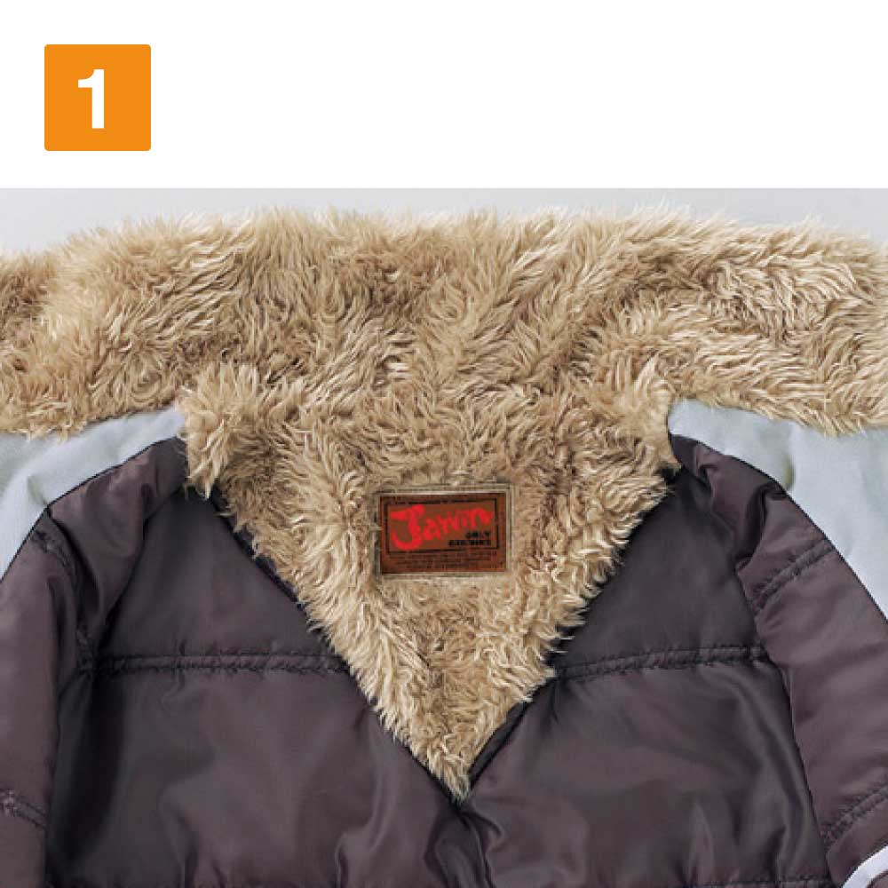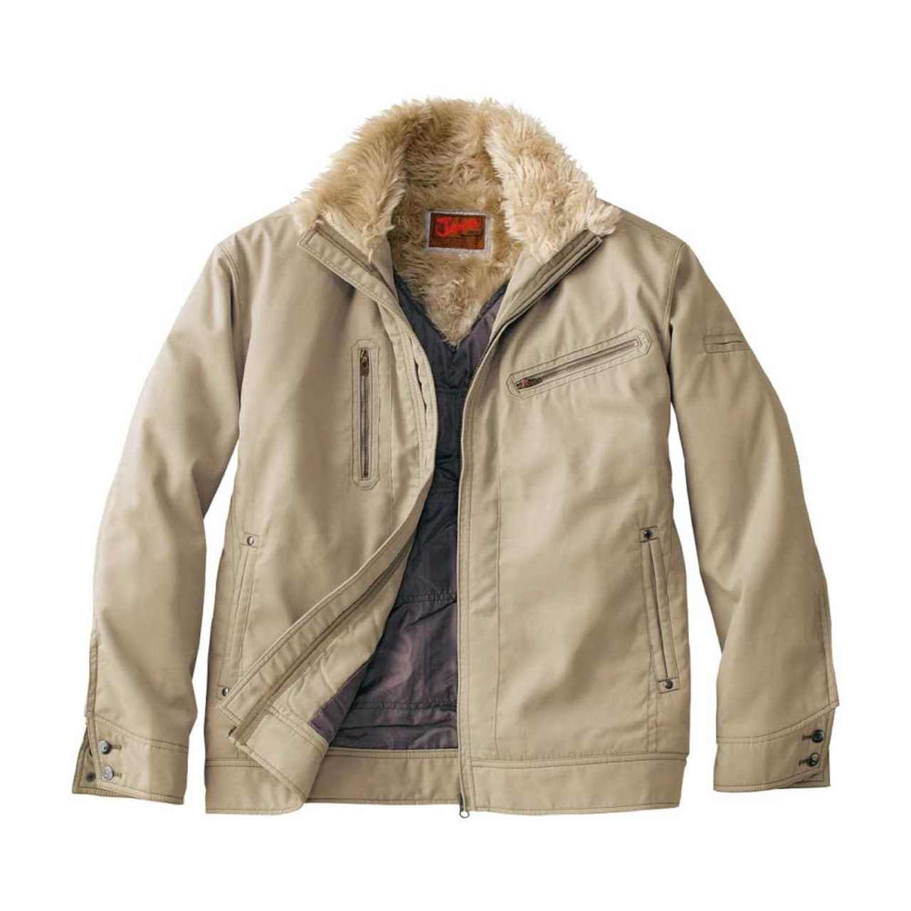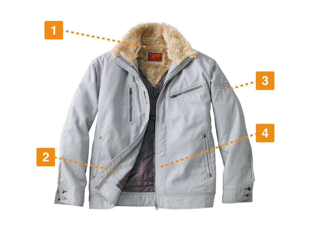 この防寒ジャンパーの特徴はやはり首周りにあしらわれたボアにあります。防寒着には首周りになんの加工もないものがありますが、そのような防寒着を長時間着用していると首が冷えてしまいます。だからと作業現場で事故の原因となるマフラーを巻くわけにはいきません。一方でボアが首周りに使用されたこのジャンパーならいつでも快適に作業をすることができます。内ポケットを始めとして収納面が充実し、帯電防止素材を使用しているので幅広い職場でご利用いただけます。