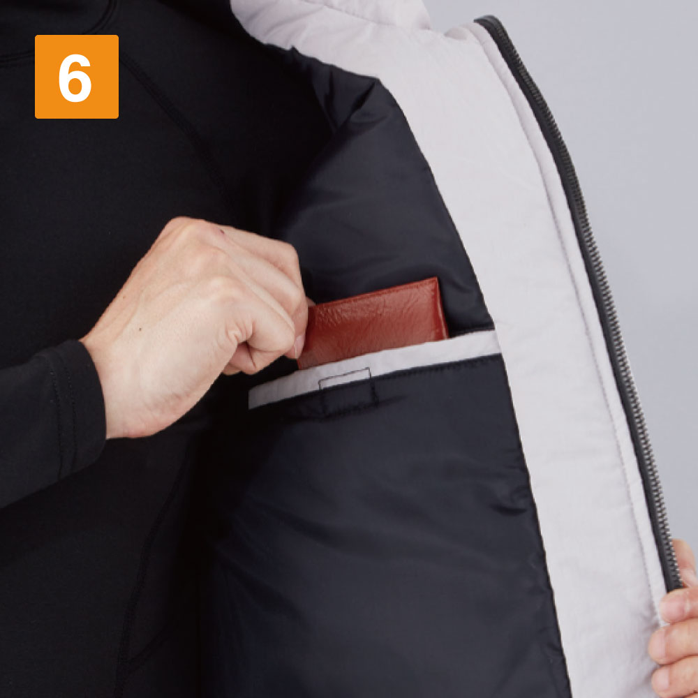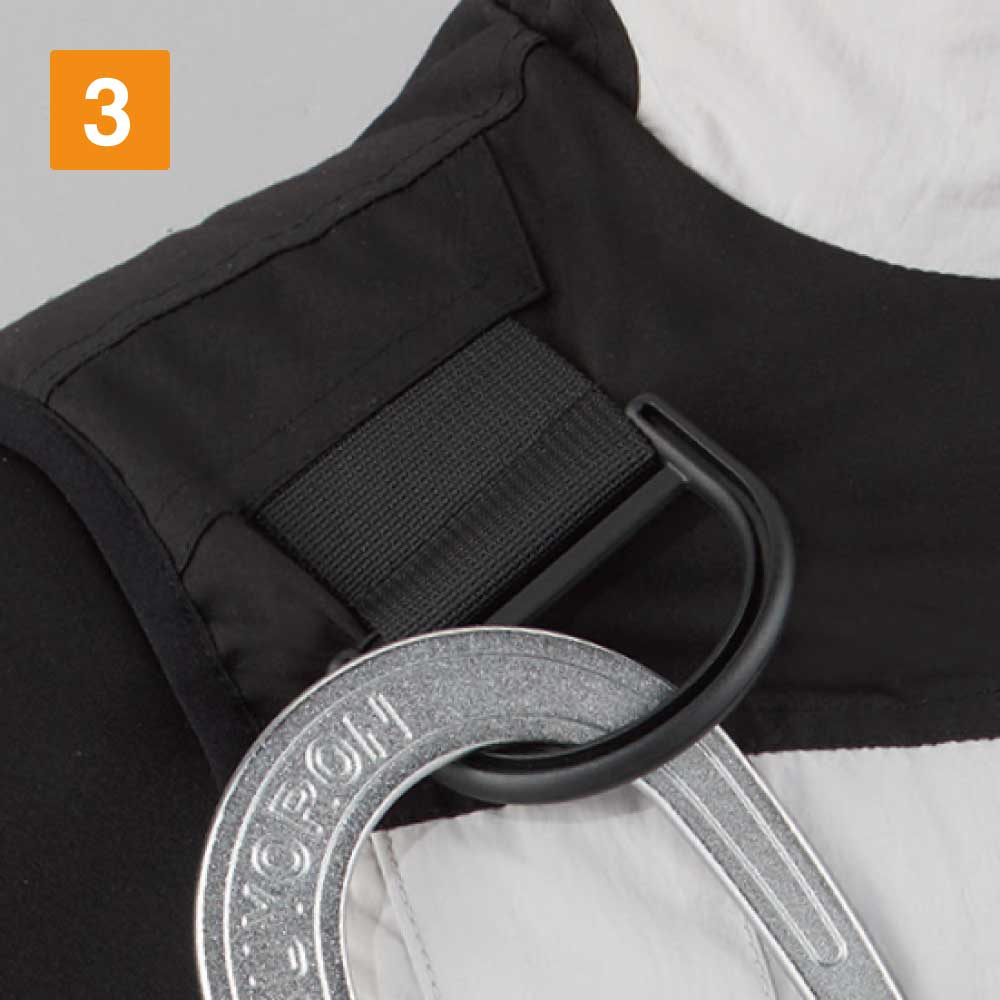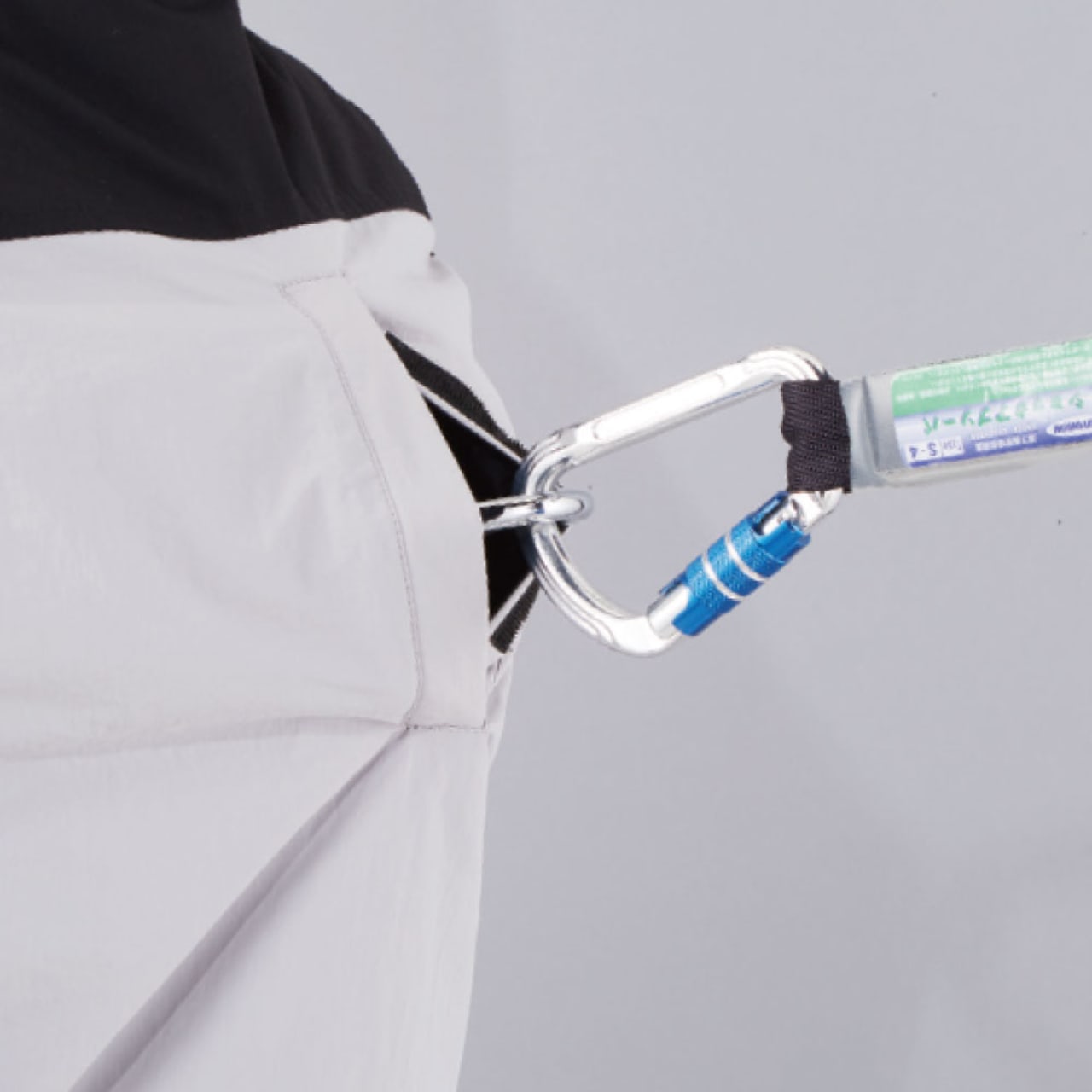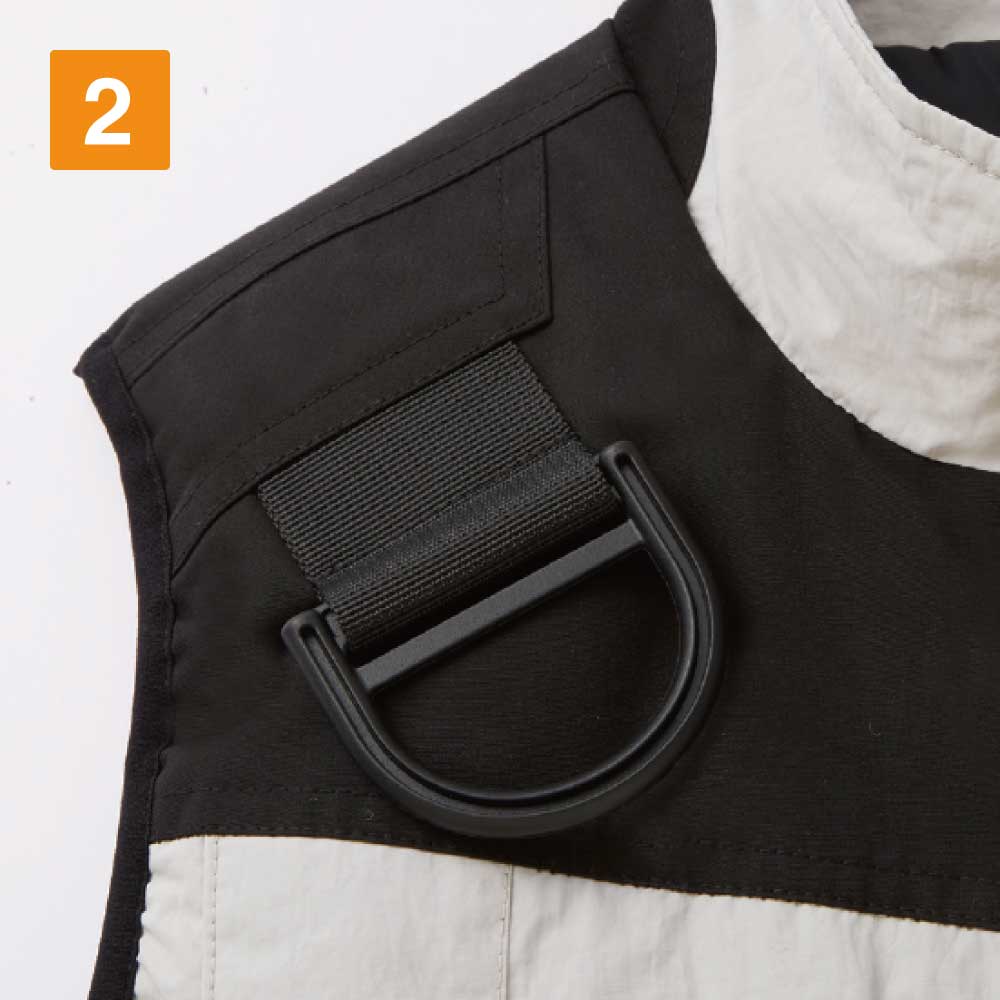 この商品の特徴はフルハーネスを使用することを前提とした作りになっていることです。ランヤードフックかけDカン、ランヤード取付口が設けられているので、高所作業も快適に行うことができます。また、Dカンが取り付けられている部位は高強度コーデュラファブリックを使用しているので、フルハーネスを使用することによる生地の劣化が気になりません。もちろん防寒性もあり、中綿は100gを使用しています。寒い季節でも快適に高所作業を行えるベストです。