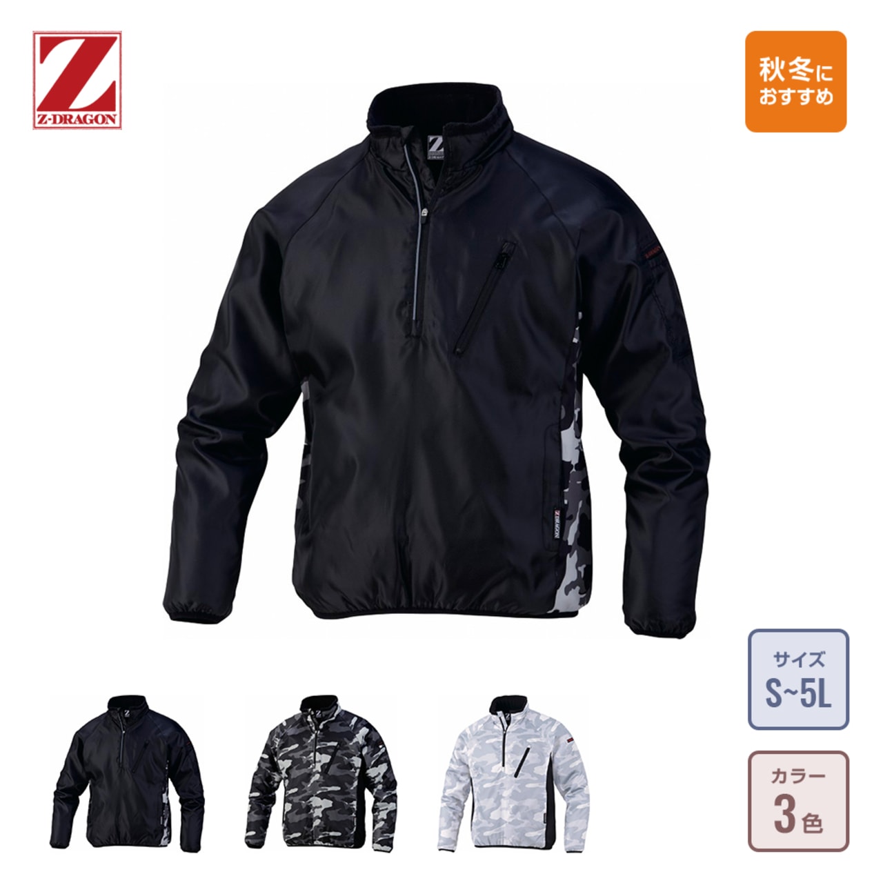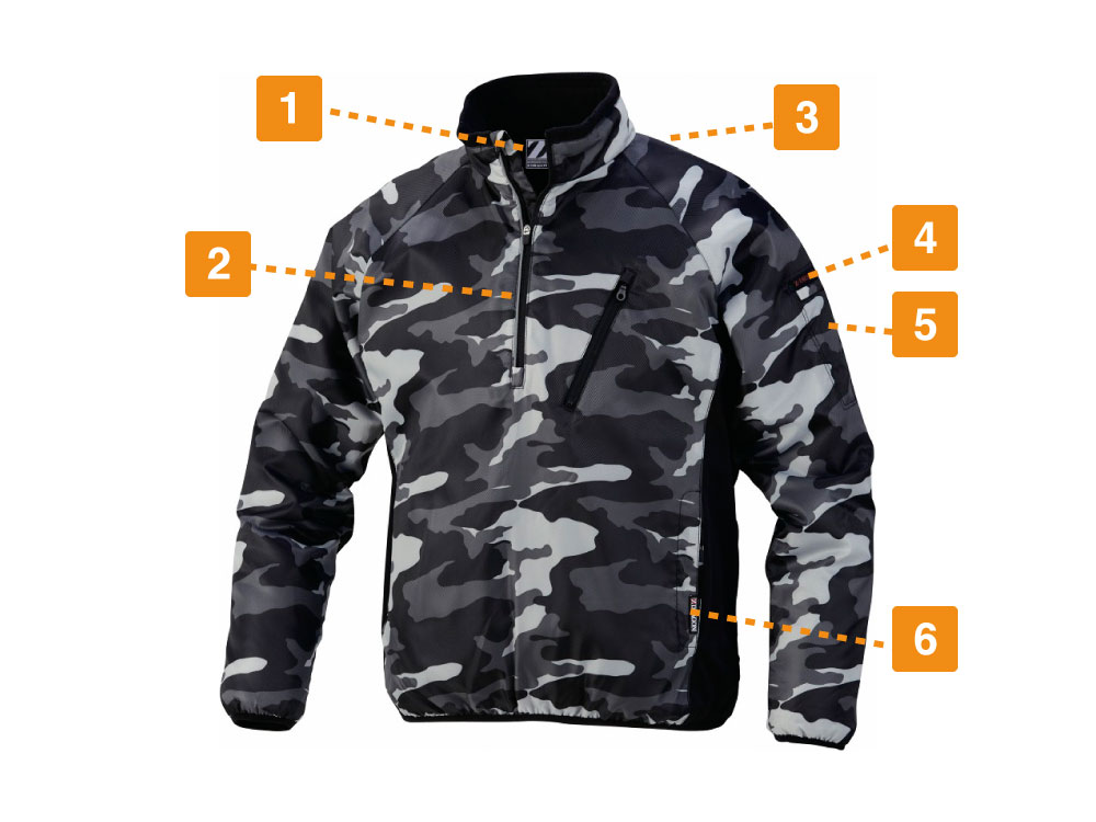 こちらのプルオーバーの特徴は、裏地にフリース素材を使用しているため、軽量でありながらもしっかりした保温性を実現しているという点にあります。また、薄型軽量であるため、アウターとしてはもちろん、中間着としても着用できるのが嬉しいポイントです。フリース素材を使用したプルオーバーを中間着として着用し、さらにその上から防寒性、耐水性の高いアウターを着用すればどんな環境下でも快適に作業を進めることが可能です。