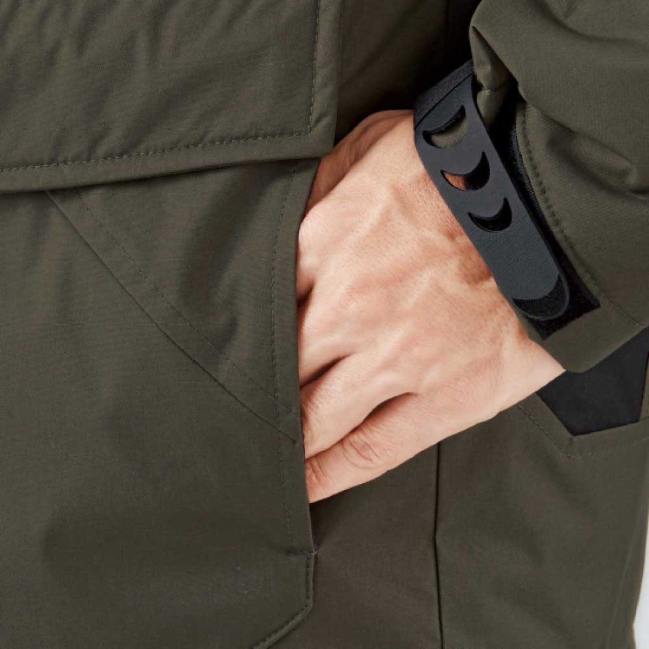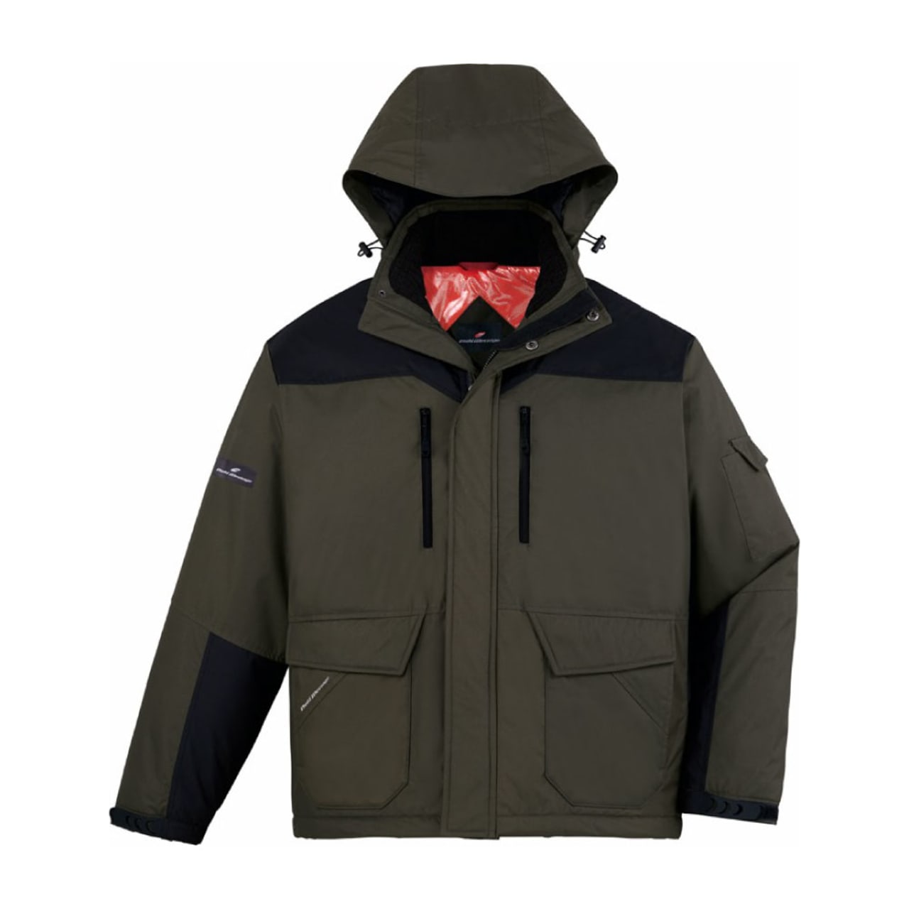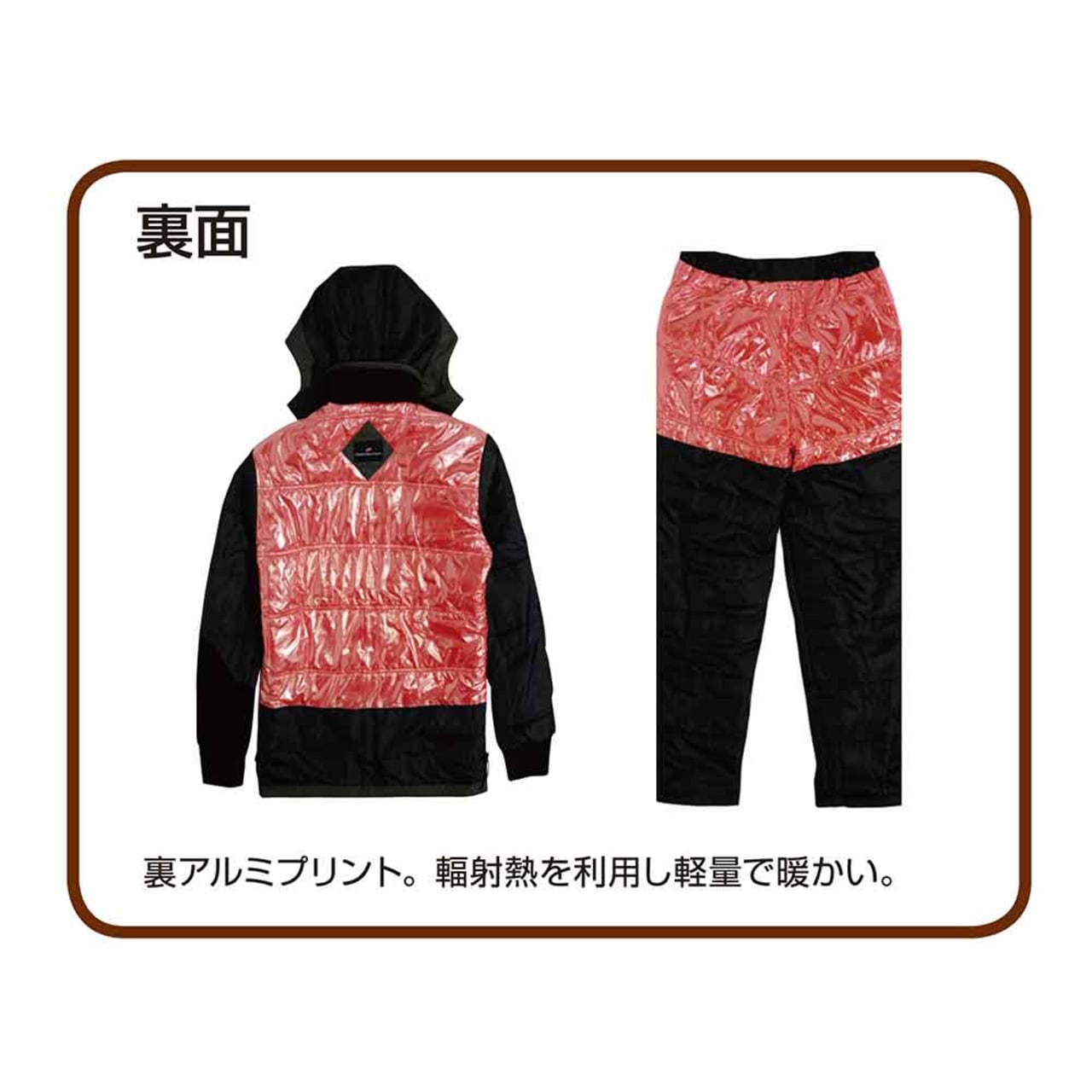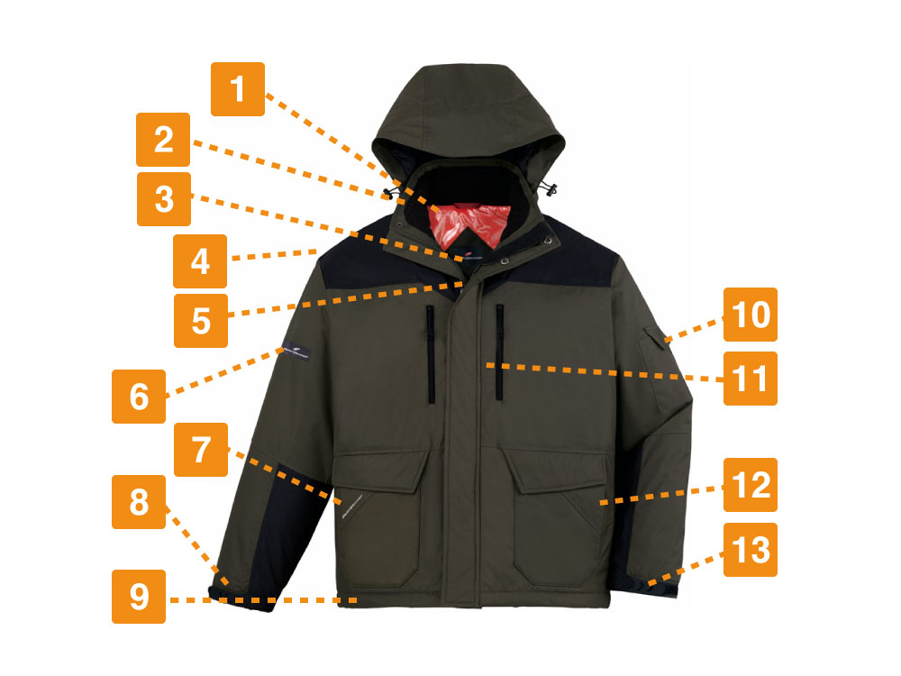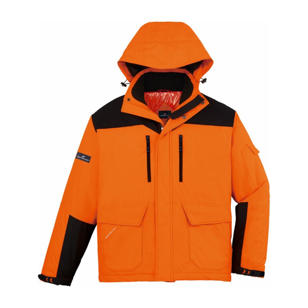 厳しい寒さの中での作業は防寒着が手放せませんが、作業の動きが落ち着いてくると少しずつ冷え込みを感じたことはありませんか?そんな方におすすめしたいのがこの防寒ジャンパー(フード付)です。このジャンパーの魅力は裏アルミプリントにあります。この裏アルミプリントにより魔法瓶のような保温効果が生まれ、一度発生した熱を長時間保ってくれます。また、袖口アジャスターとドローコード、衿フリース、ハンドウォーマーポケットを設け、さらに袖口内はジャージ仕様と寒さに大変強い仕上がりとなっています。また、両胸、両脇ポケットなど収納部分が充実し、作業に必要な小物をスッキリと収めることができます。