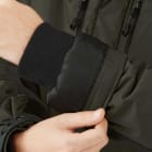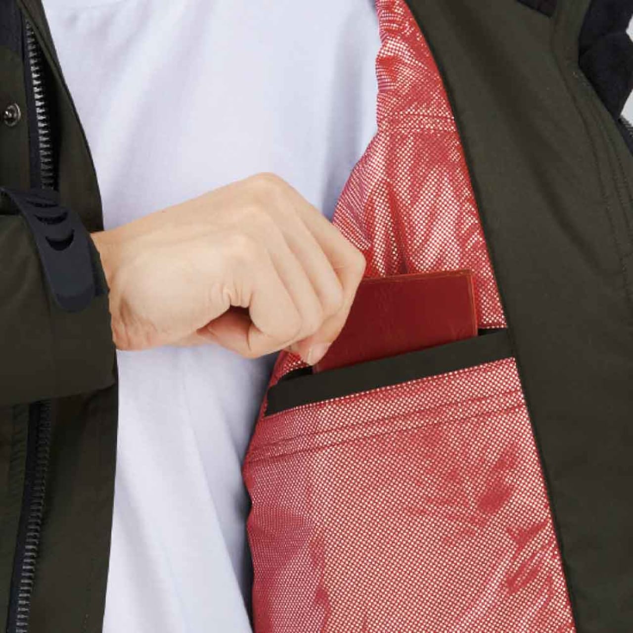 この防寒ジャンパー(フード付)の特徴は、さまざまな防寒機能を備えているという点です。まず裏地ですが、裏アルミプリントにより魔法瓶のような効果を生み出し、一度発生した熱を逃しにくくなっています。さらに冷えた指先を温めるハンドウォーマーポケットや、冷えやすい首元をカバーする衿フリース仕様など、寒さが厳しい季節に着用したくなる機能がたくさん備わっています。裏アルミプリントを用いることにより、軽量に仕上がっているのも魅力の一つです。