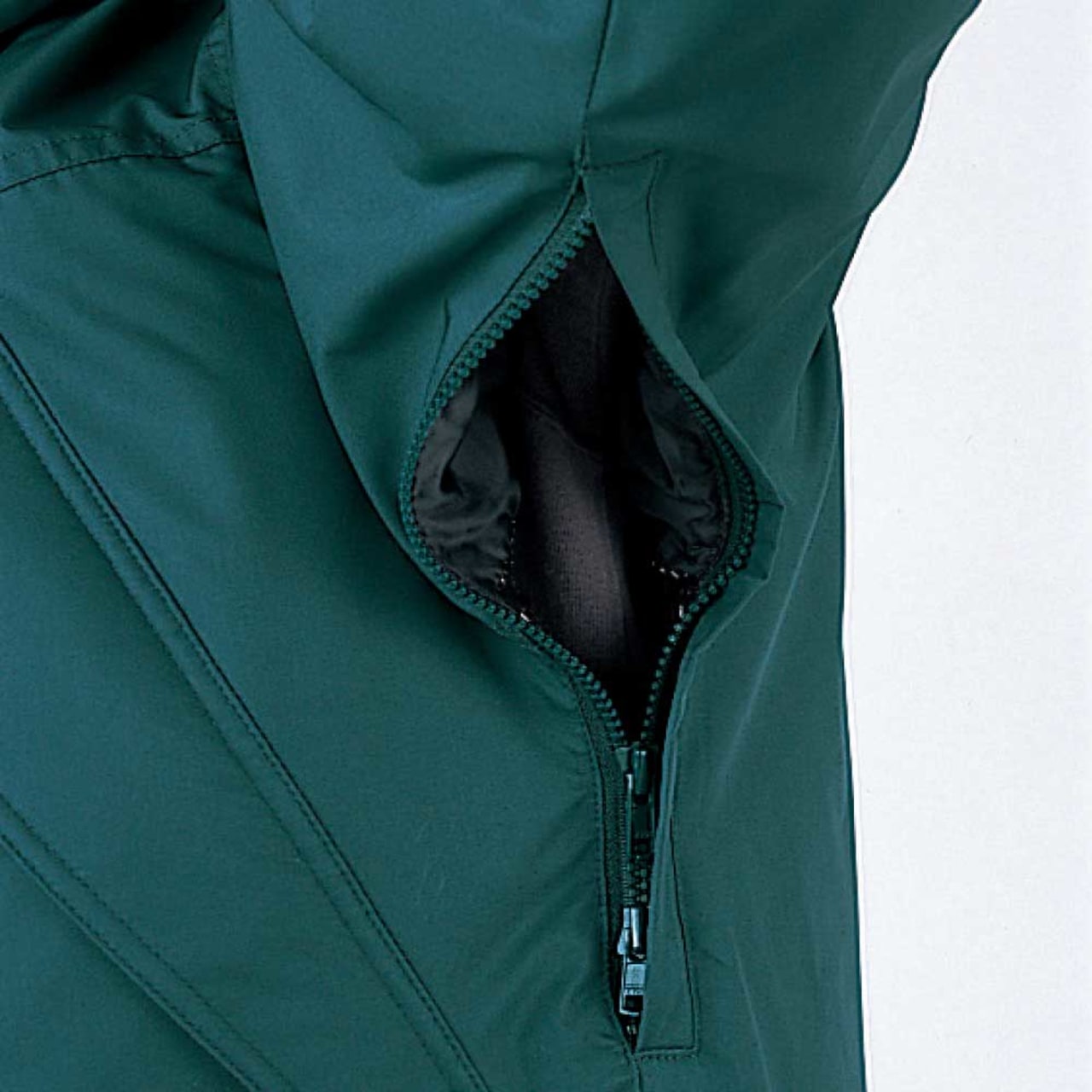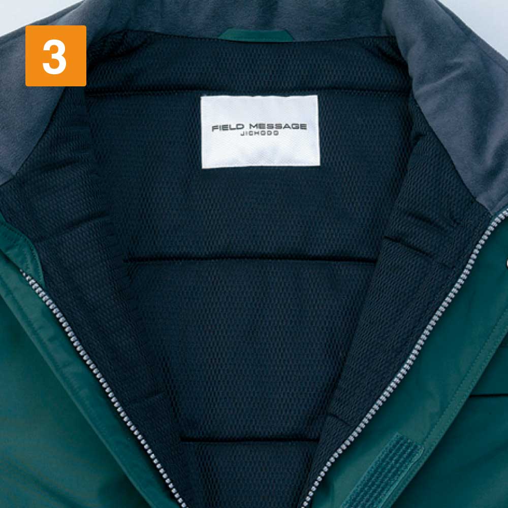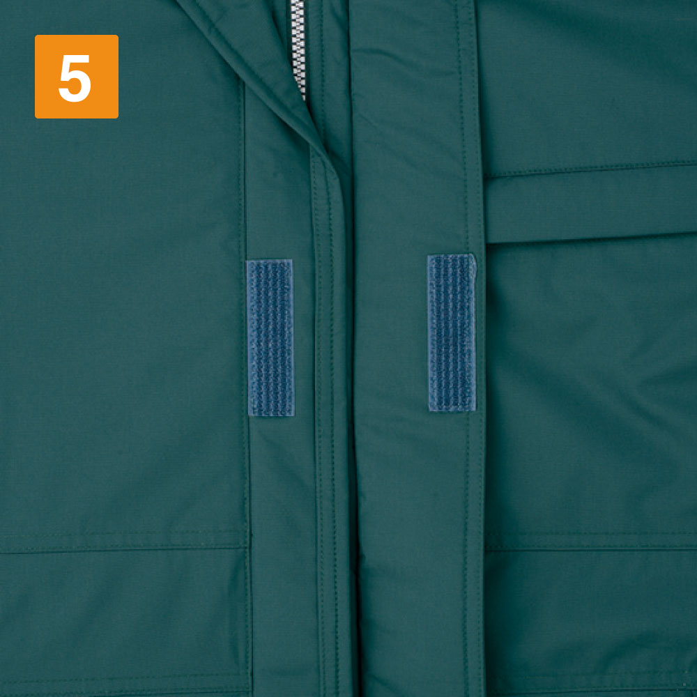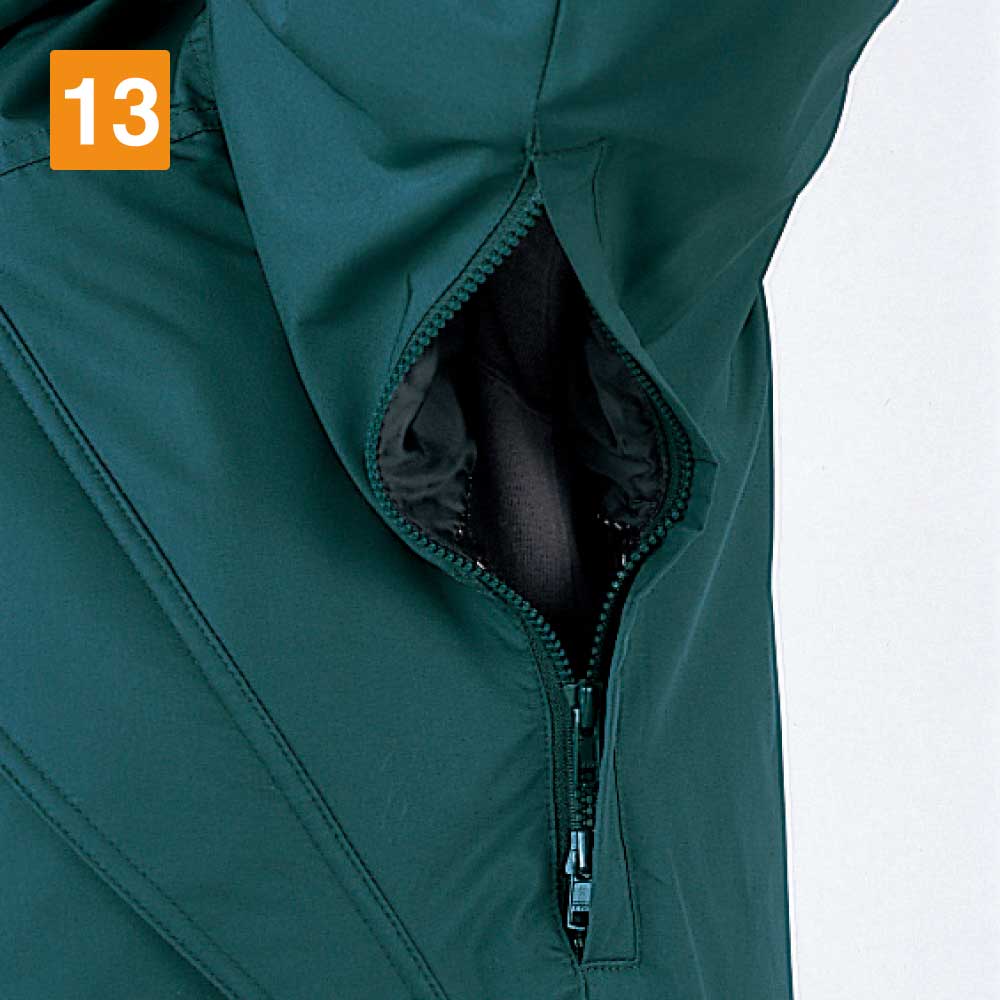 この防水防寒コートは、耐水圧10000mmの防水機能を持っています。プラスして、先ほど紹介したシンサレートウルトラによって、冷たい風や雨から作業員をしっかりガード。屋外で小雨くらいの環境であれば、問題なく作業できるでしょう。さらに両脇下にはベンチレーションが装備されており、このベンチレーションによって、蒸れ防止も期待できます。厳しい寒さの中で作業した場合でも、長時間になるとコートの中に熱がこもってしまうでしょう。ベンチレーションのおかげで、この熱を適度に放出できるので、汗で蒸れて不快な思いをすることもありません。
