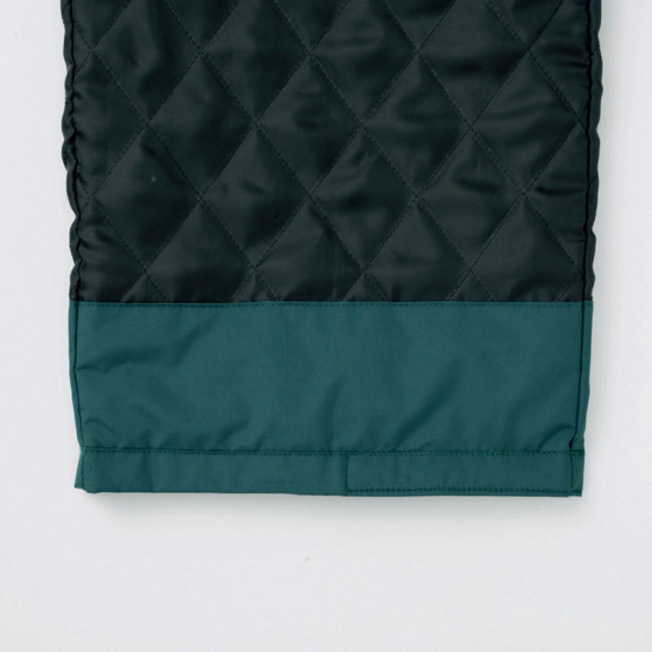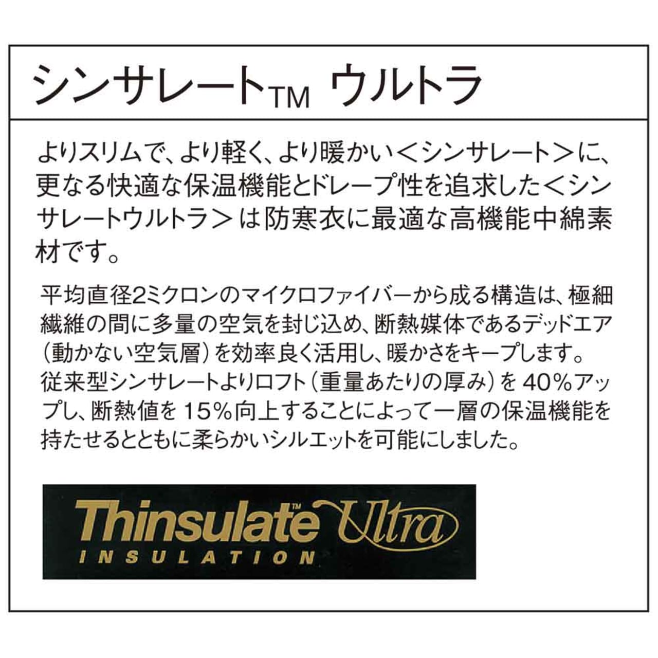 こちらの防水防寒パンツは、シンサレートウルトラという中綿の一種を使っています。シンサレートウルトラは、保温性に優れるだけでなく、軽量化にも成功。防寒服は温かい一方で、分厚い素材で作られているものが多く、動きにくいものも少なくありません。このような従来の問題を改善したのが、この防水防寒パンツです。シンサレートウルトラは、直径平均2ミクロンのマイクロファイバーで作られ、極細の繊維の中に多くの空気を閉じ込めています。デッドエアの効率的な活用で、薄くても温かさをキープ。従来のシンサレートと比較して、断熱値を15%も向上させました。