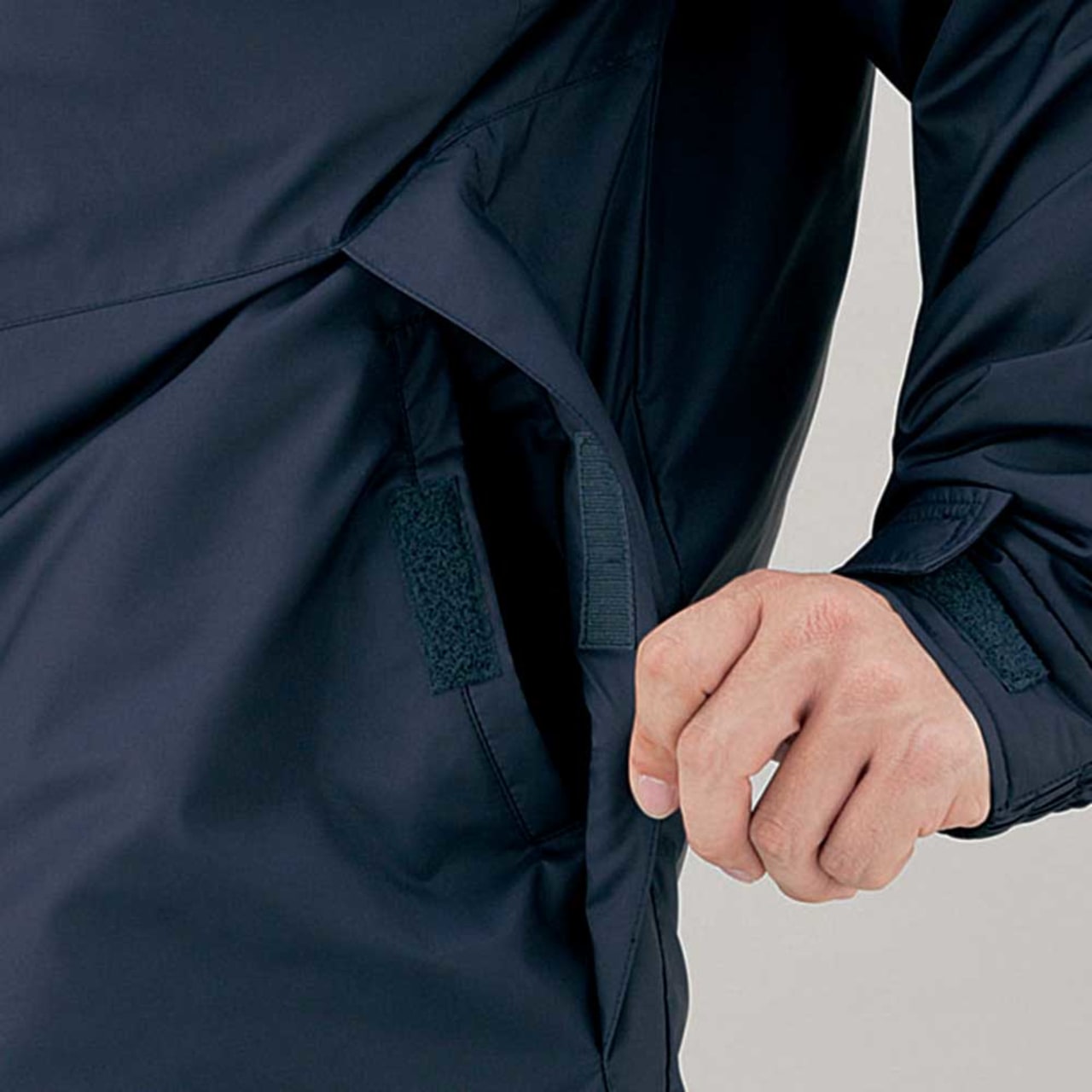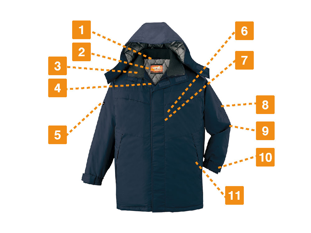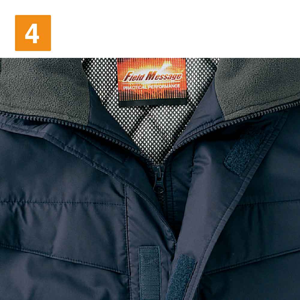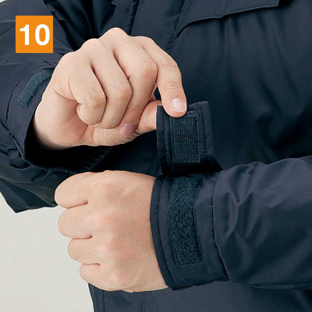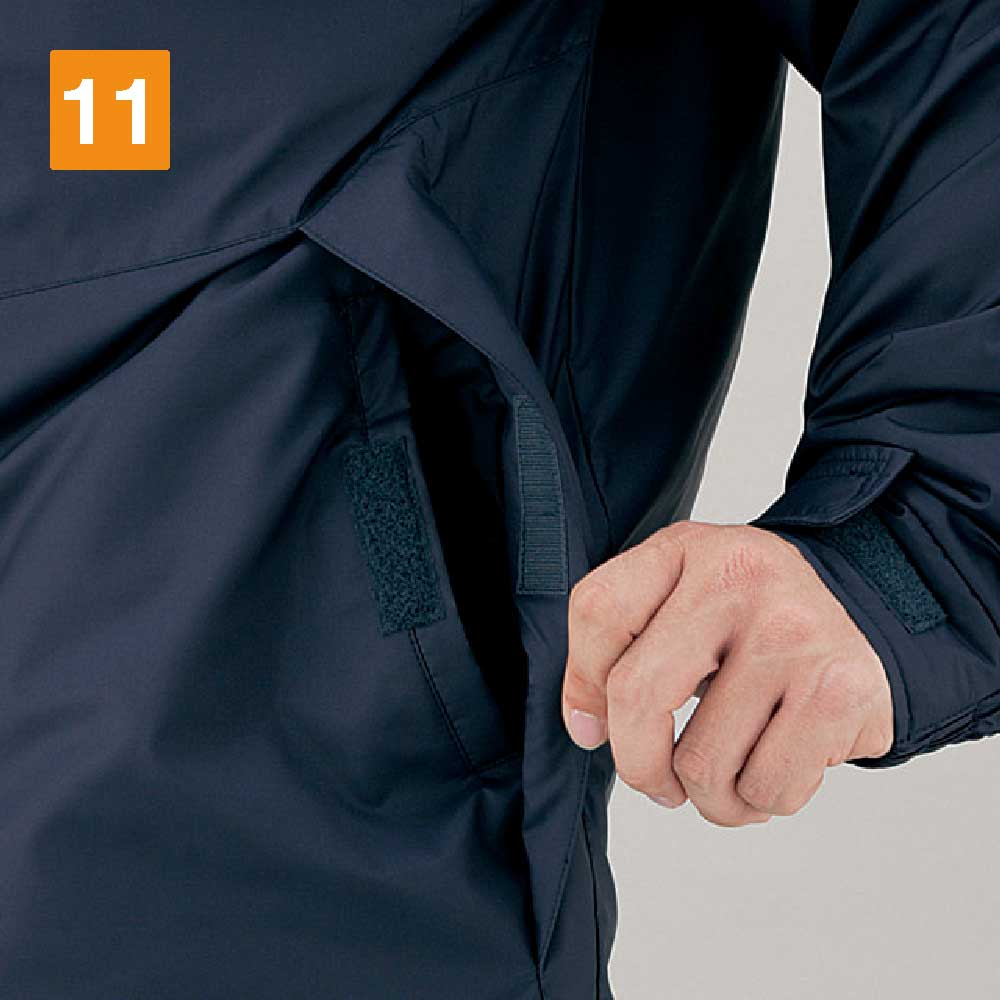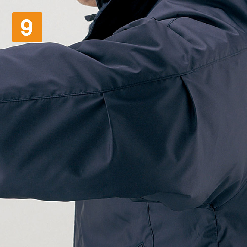保温性の高さと水への強さは、機能面を語るうえで外せないポイントです。寒さの厳しい現場においてワーカーの体温低下を防ぎ、パフォーマンスやモチベーションの低下を防ぐ効果も期待できます。肘タック加工により、腕を可動しやすい設計なのも特徴です。防寒コートにありがちな動きにくさを解消し、アクティブなアクションにも難なく応えてくれます。内ポケットや携帯電話専用のポケット、ペン差しなども備え収納力も抜群です。