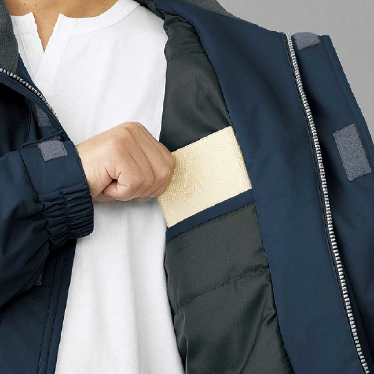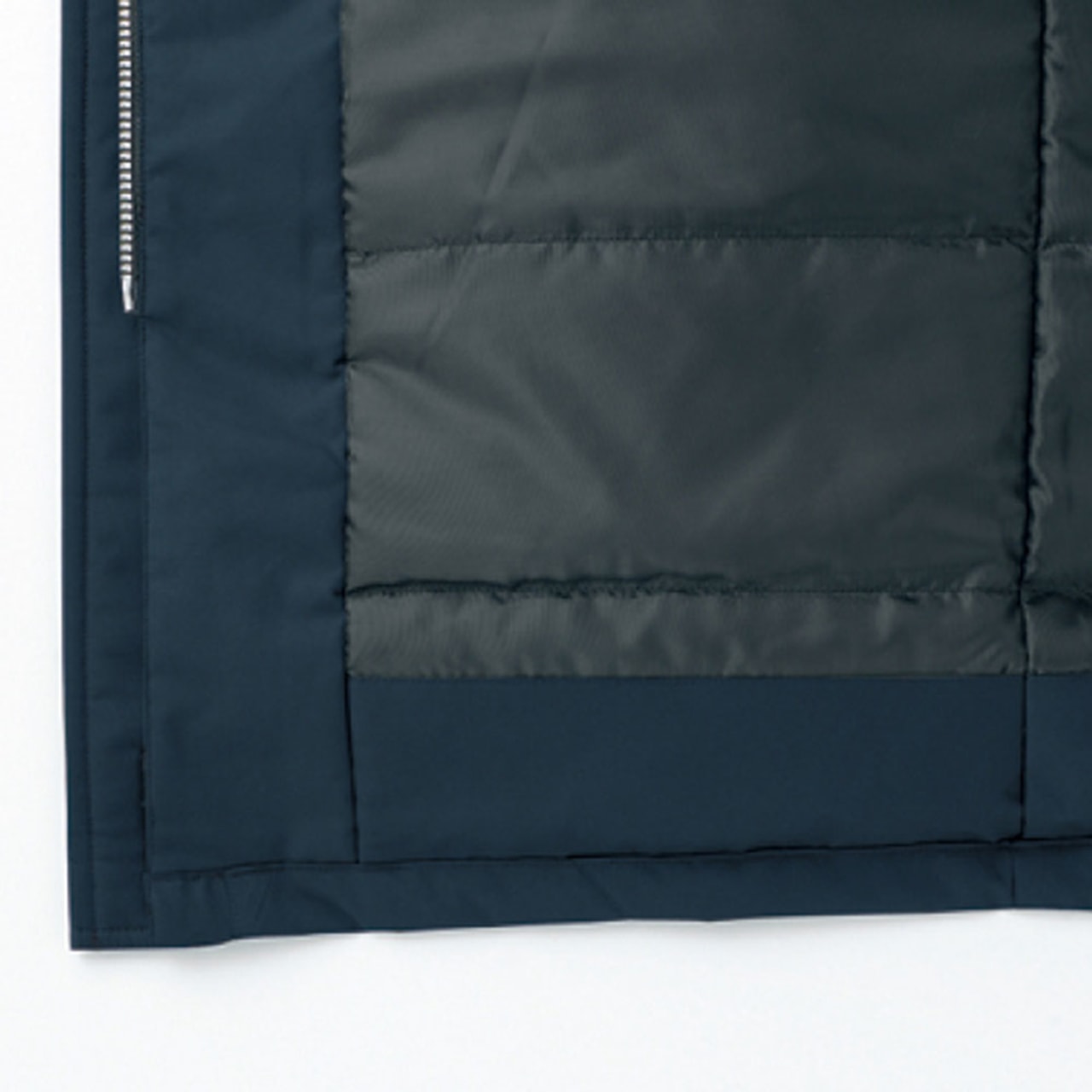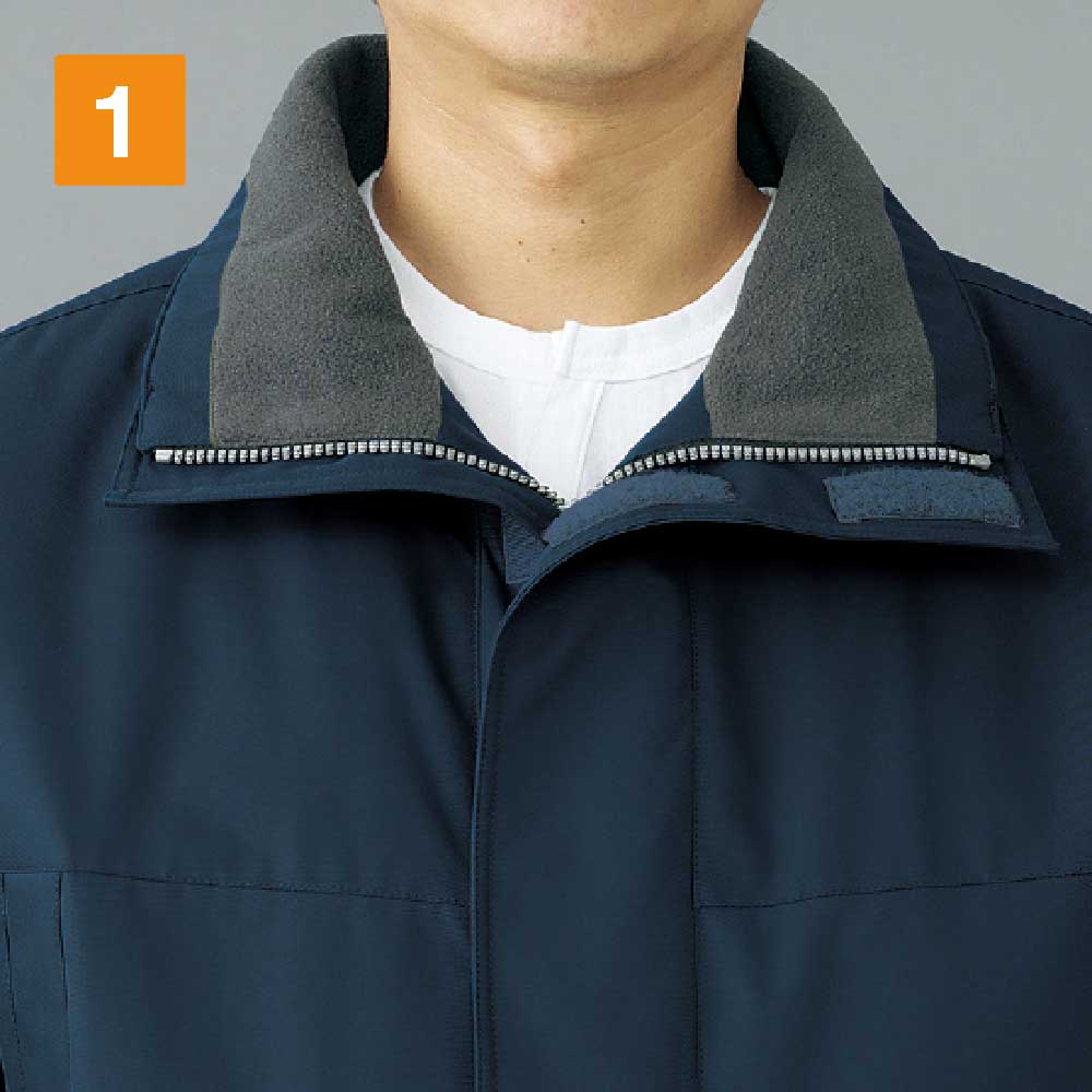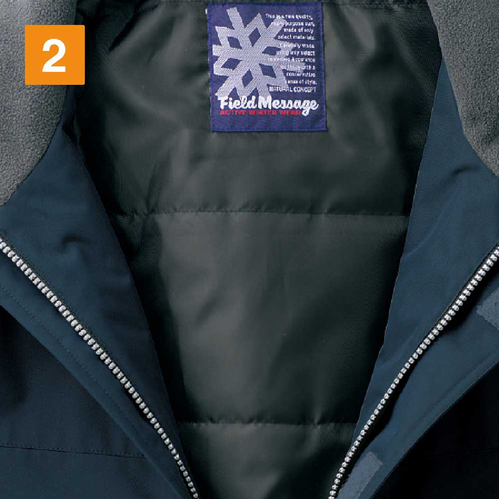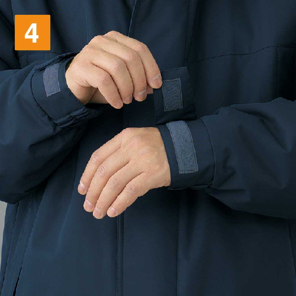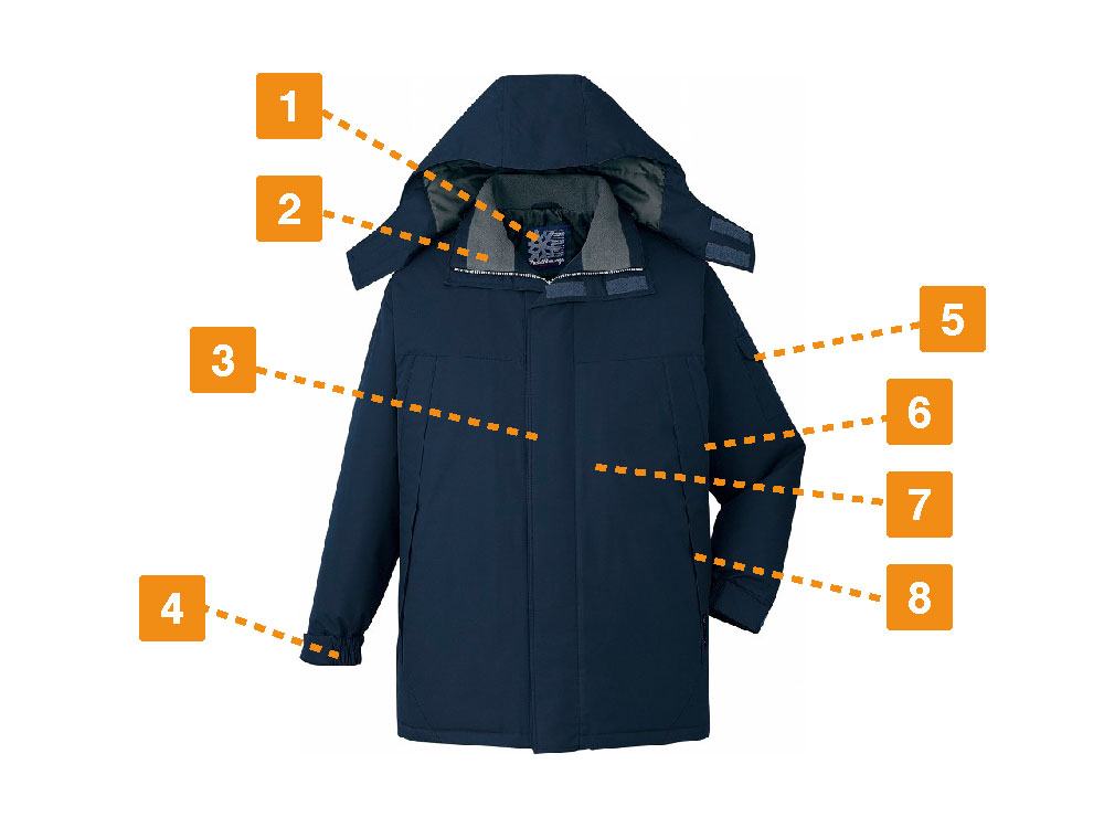 防水性を高めた防寒コートで、耐水圧は2,000mmを誇ります。撥水加工を施した生地は水分をはじき、内部への侵入を許しません。悪天候時に屋外で作業にあたるワーカーの体をしっかりと守り、体温の低下を防いでくれます。裏地にはポリエステルタフタとキルト素材を採用し、防寒性を高めています。生地のあいだに中綿を詰めたキルト素材が、内部の熱を外へ逃がしません。冬場の屋外作業のみならず、大型冷凍庫や暖房設備のない倉庫内での作業など、多彩なシーンで活躍できるポテンシャルを秘めた防寒コートです。