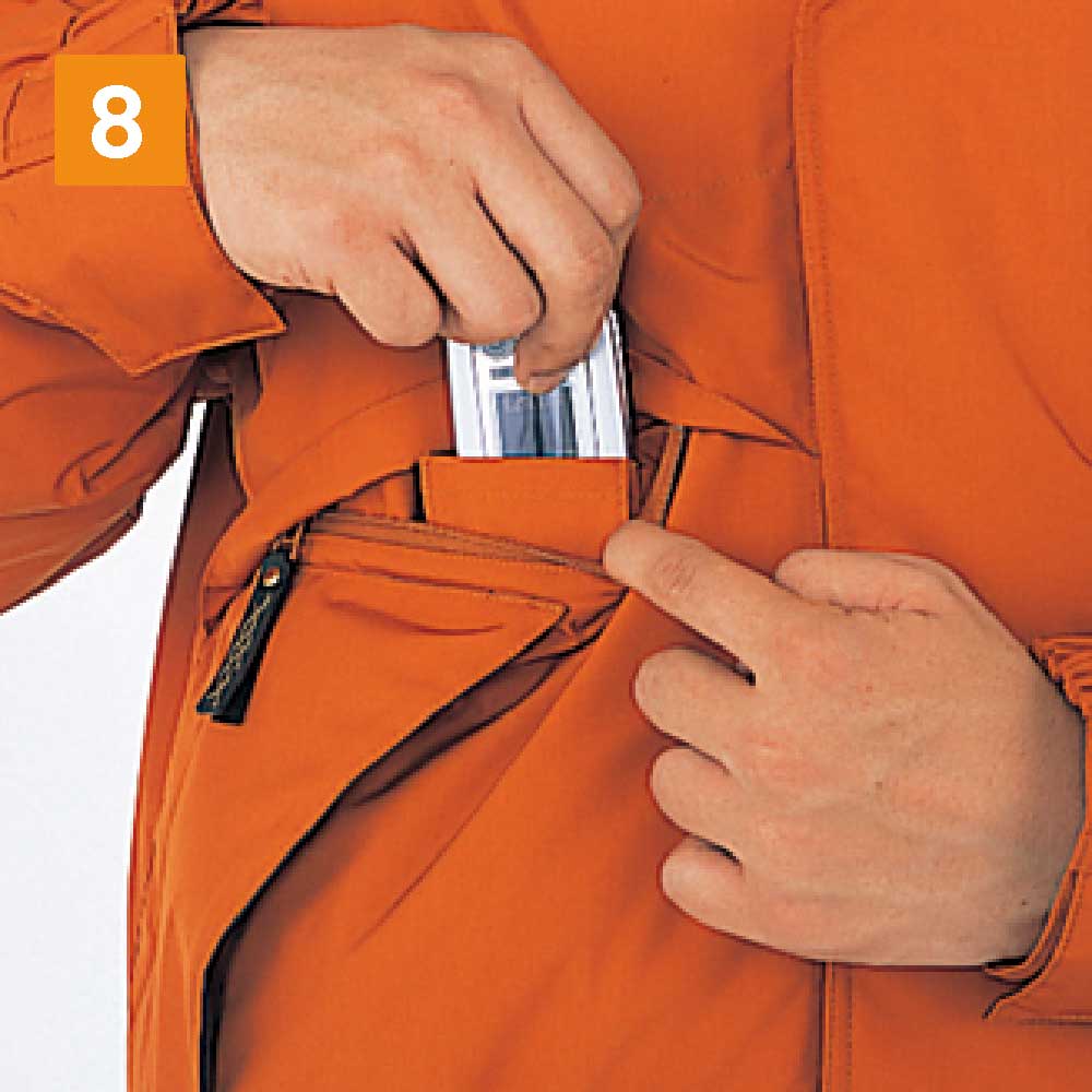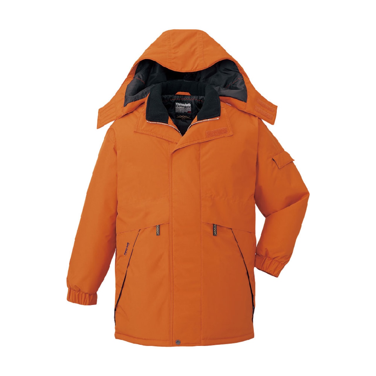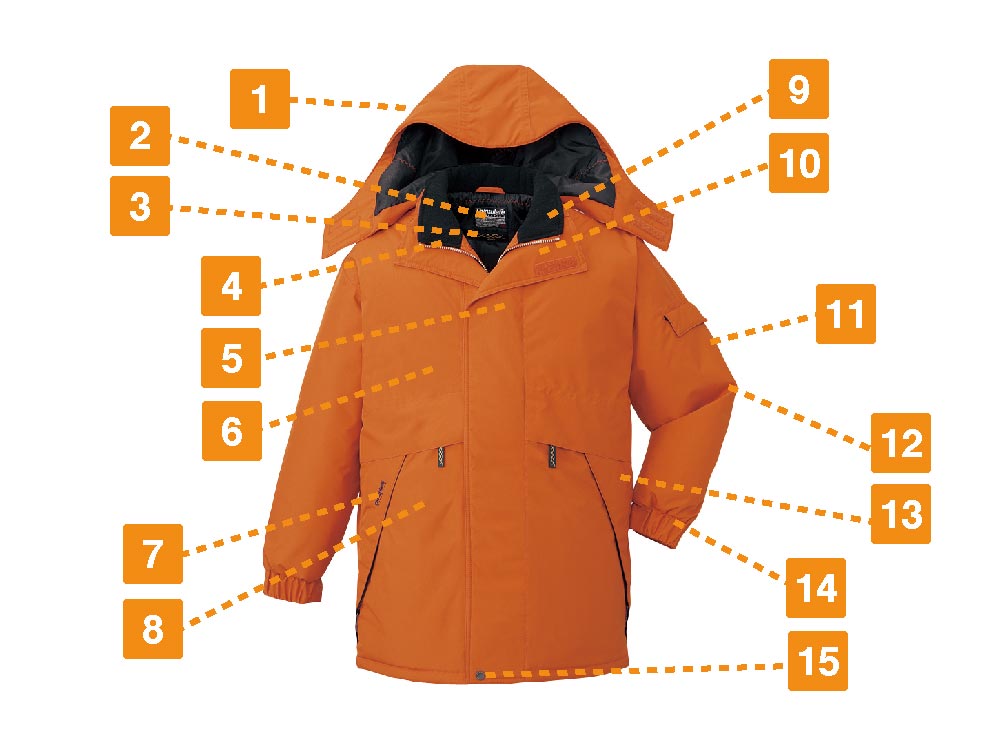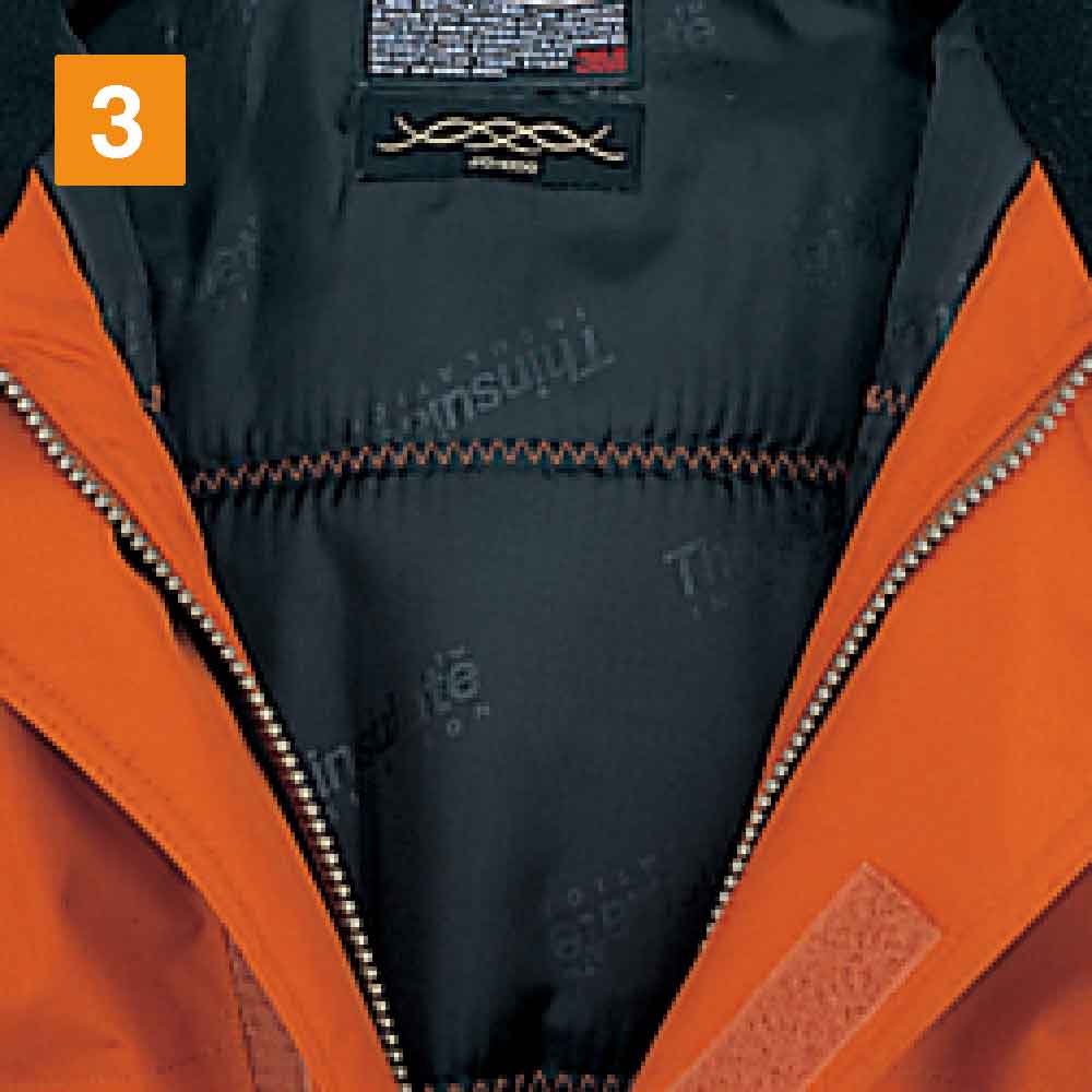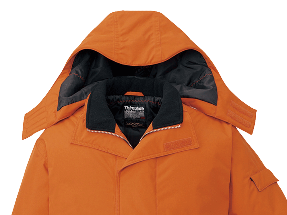 冬場の屋外作業や冷凍庫内で業務を遂行するワーカーに、最適なウェアです。厚手のキルティング素材を採用し、外からの冷気や風をしっかりシャットアウト。それだけに留まらず、中綿にはシンサレートハイロフトを用いて保温性を高めました。シンサレートハイロフトは、抜群の保温力を持つ素材として知られています。それを惜しげもなく中綿に採用し、極寒の環境下でも快適さを維持できる保温力をもたせました。屋外作業時には、フードもかぶれば冷たい風から顔や頭、首元をガードできます。