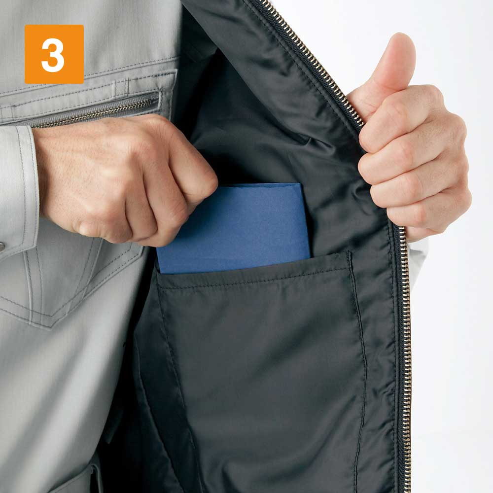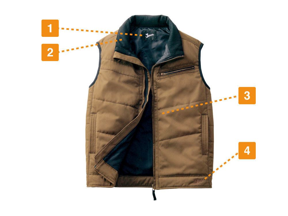 この防寒ベストの特徴は特殊な生地を使用している所です。ベストに使用されている生地はThermolite PLUSといい、まるで魔法瓶のような高い保温性を実現した生地です。作業中に上がった体温をそのまま維持できるので、冬場の厳しい環境でも快適に作業ができます。生地以外の特徴としては、胸ポケット、両脇ポケット、内ポケットと、収納面が大変便利な点が挙げられます。細かなアイテムもすっきり収めることができます。