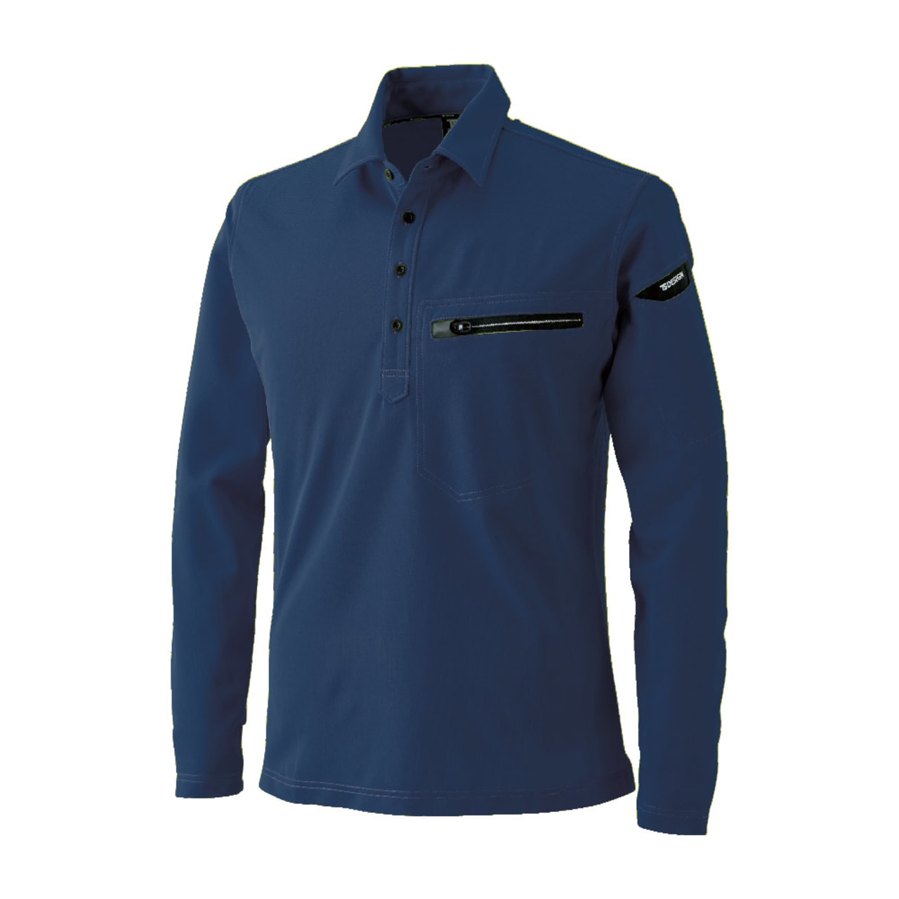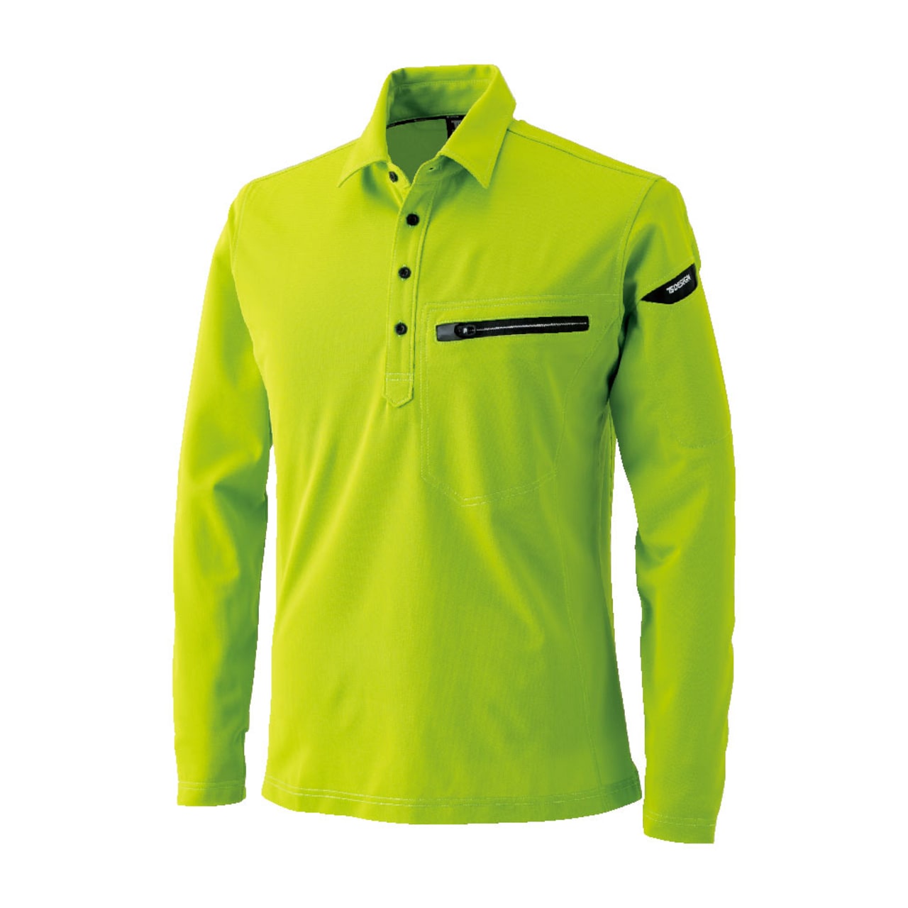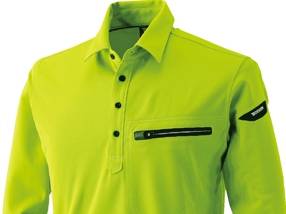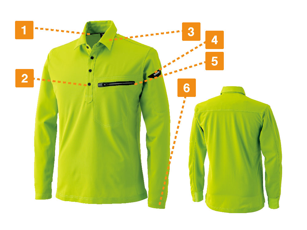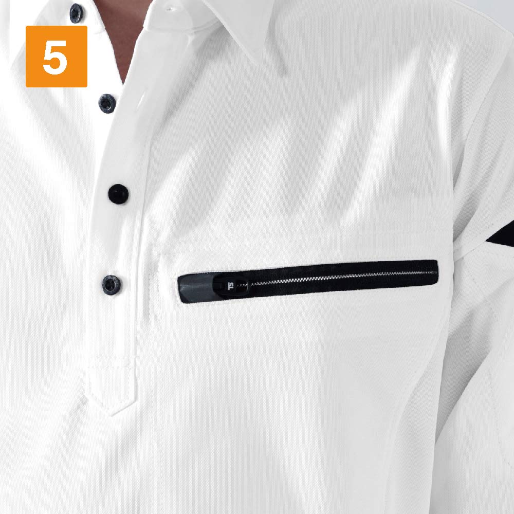 本体に使用されているストレッチエアーリップ生地の持つ機能性が光る一着。生地は製品制電 JIS T-8118に適合した高機能素材です。可燃性ガスを扱う現場など、静電気の発生がクリティカルな危険に繋がる環境でも着用でき、安全性アップに寄与しています。また、生地の持つ形態安定性能によって型崩れしにくいのもポイント。毎日のヘビーユースや洗濯でもへたりにくいので、ユニフォームとしてのコストパフォーマンスも高いウェアです。収納面では、胸ポケット開口部にポロシャツとしては珍しいファスナーを配置。物が落ちにくいので体勢を問わず作業が可能です。