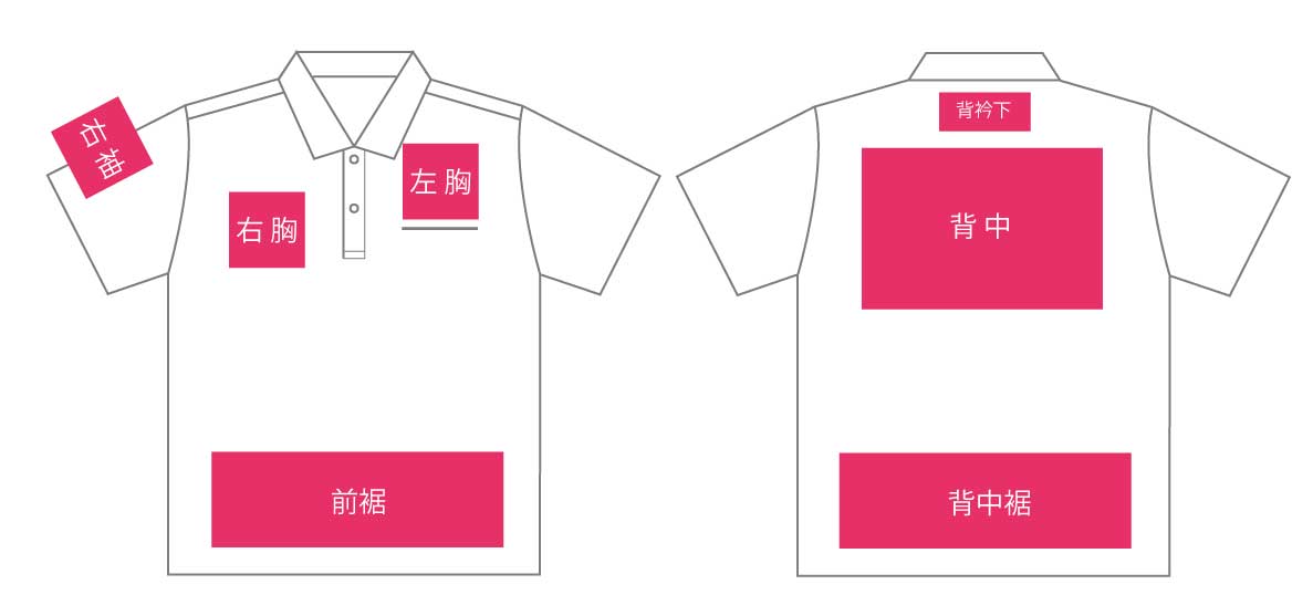 | 加工箇所例 | ポロシャツやシャツの胸・袖・背中衿下によくあるタイプ | 背中刺繍横長タイプ 文字2段等 |
