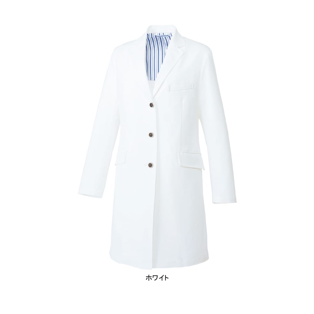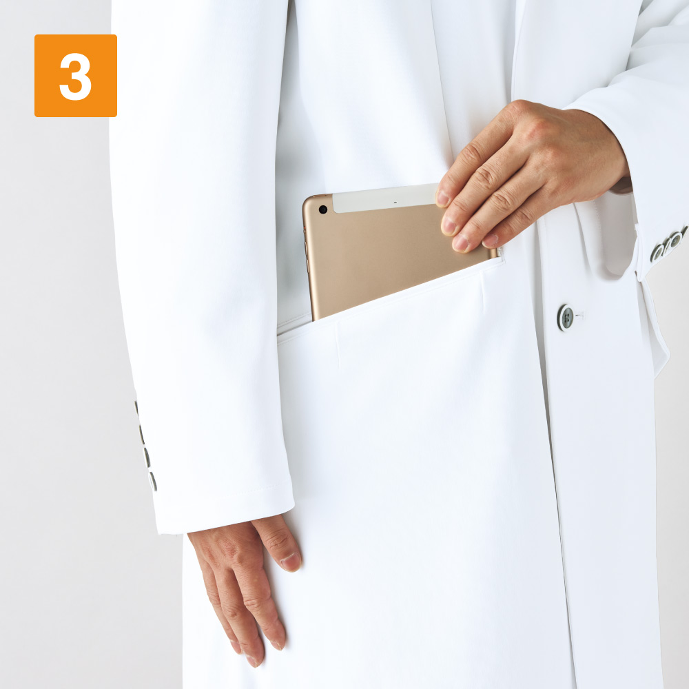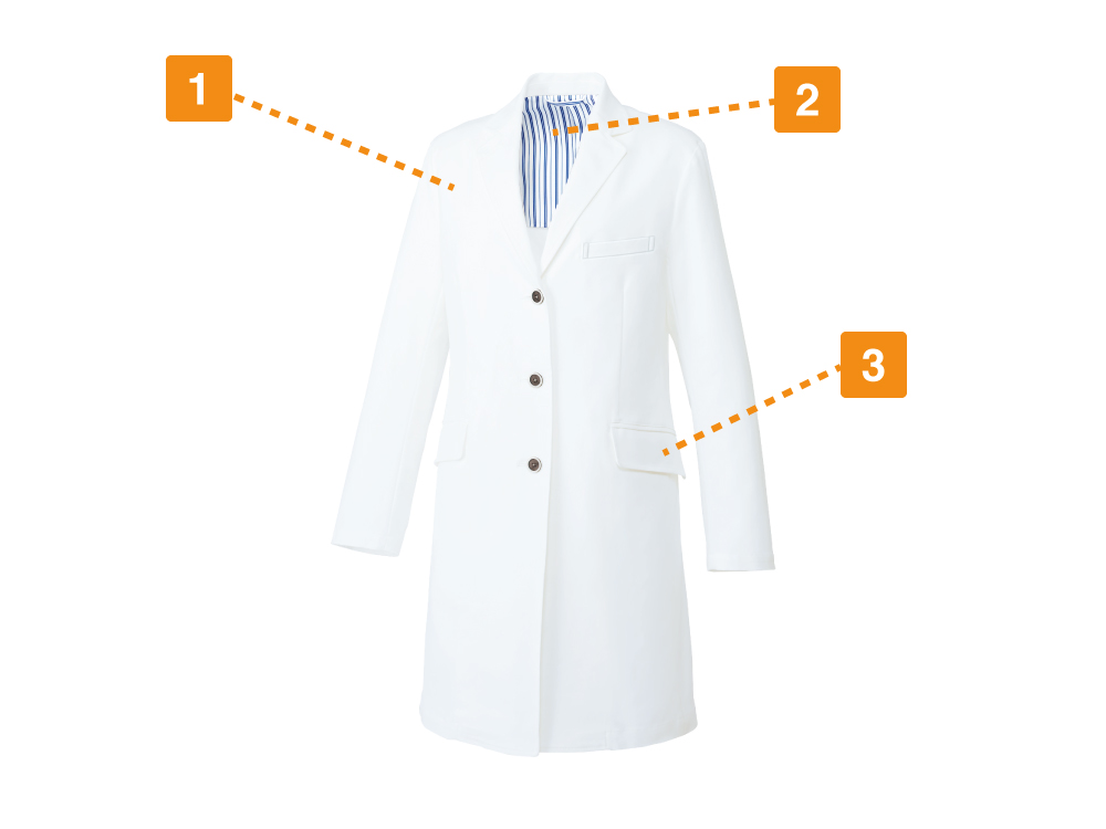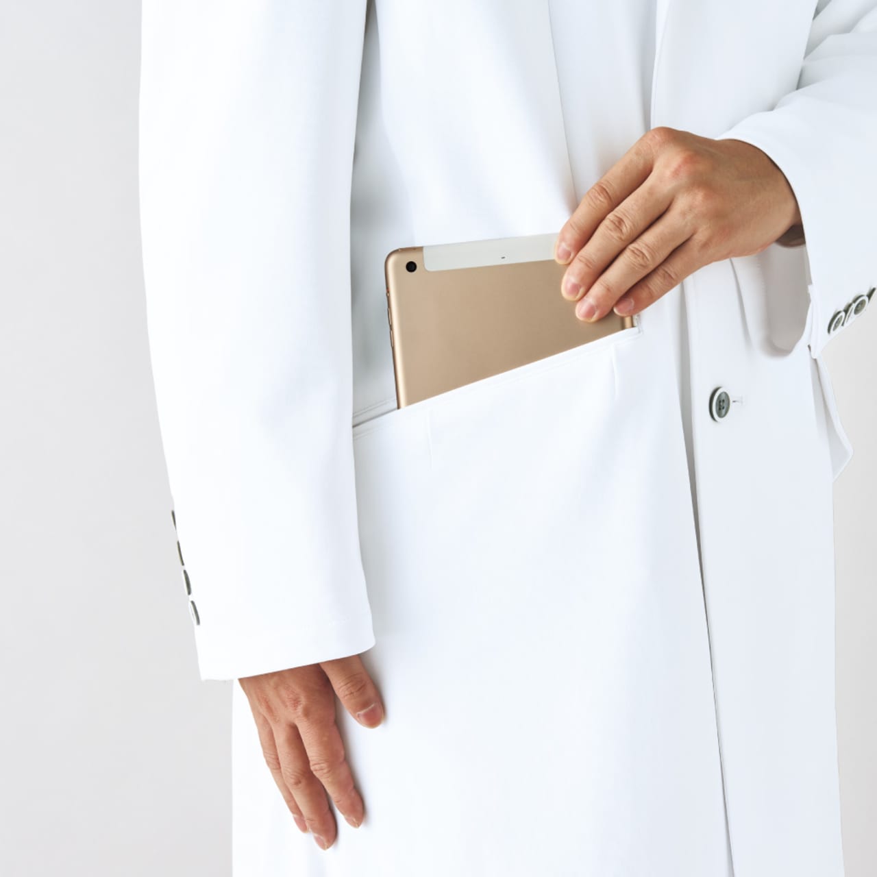 使い勝手をアップする収納やデザインのディテールにも注目の一着です。ポケットは左胸と両脇の3ヵ所に配置されています。持ち物をすっきりと収納でき、作業効率をアップ。また、右脇ポケットに中ポケットが付属しており、小物をごちゃつかせません。さらに、脇ポケットは小型のタブレット端末がすっぽり収納できる大判ポケットになっています。また、背裏には爽やかなブルー×ホワイトのストライプ柄生地があしらわれています。さりげないアクセントとして、清潔感のあるコートを演出します。