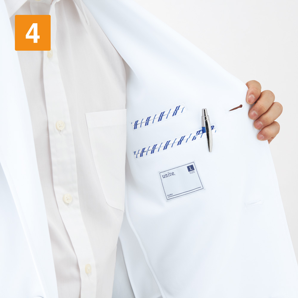 洗練された美しいデザインがスタッフ内でも好評な一着です。また、優れた収納機能もポイント。左胸と両脇のポケットに加え、充実の内ポケットが優れた使い勝手を実現しています。内ポケットは二段ポケットとなっており、小物を仕分けてすっきりと収納可能。爽やかなストライプのふちどりもさりげないアクセントに。さらに左腰内側にはタブレット端末も収納できる大判ポケットも配置されています。見た目はすっきりと、大容量の収納で快適なお仕事をアシストしてくれます。