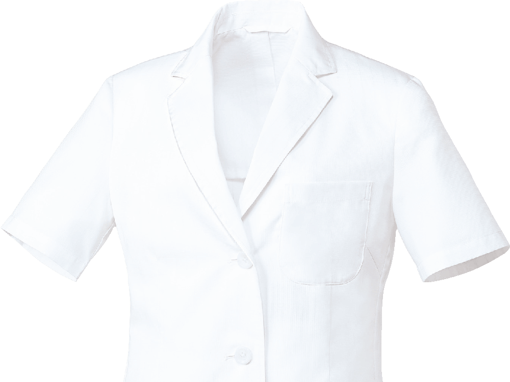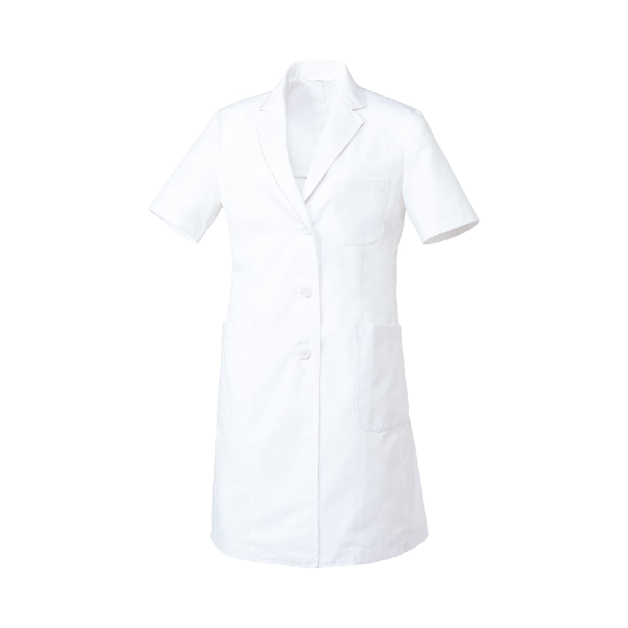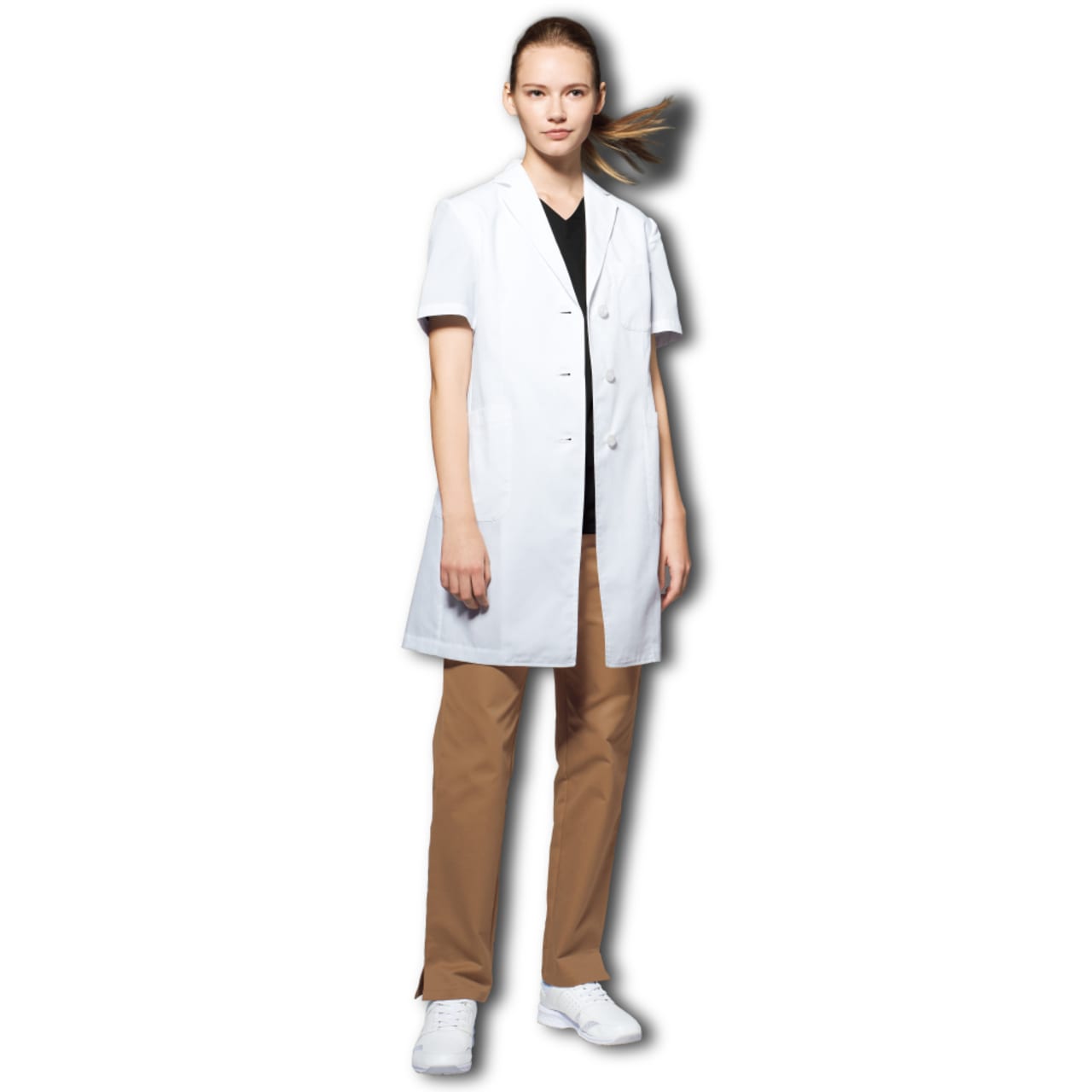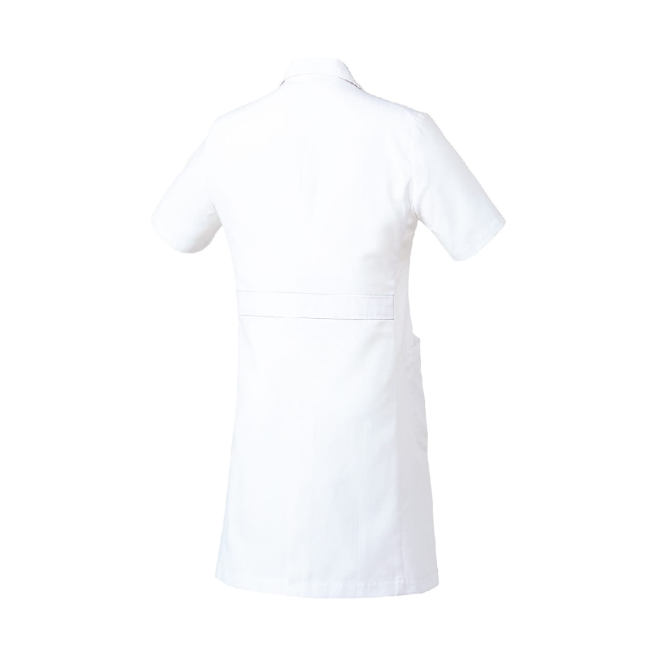 半袖でアクティブな印象が人気のドクターコートです。主張を抑えたシャープな形状の襟が、きちんと感をプラス。すっきりとシンプルなデザインで、爽やかな印象にしてくれます。背面にはベルトがついており、後ろ姿もかっちりとした印象に。360°どこから見ても美しいウェアです。丈は太ももの中間までとした少し短め丈で、足さばきがスムーズに。また、半袖デザインで袖まわりがもたつかないので、腕の上げ下ろしといった動作もストレスを感じさせません。