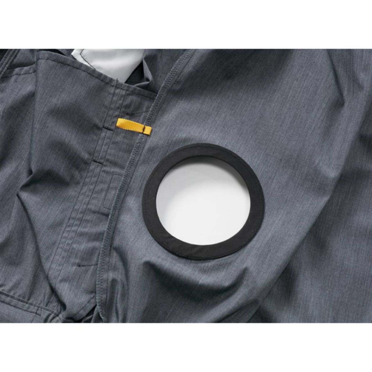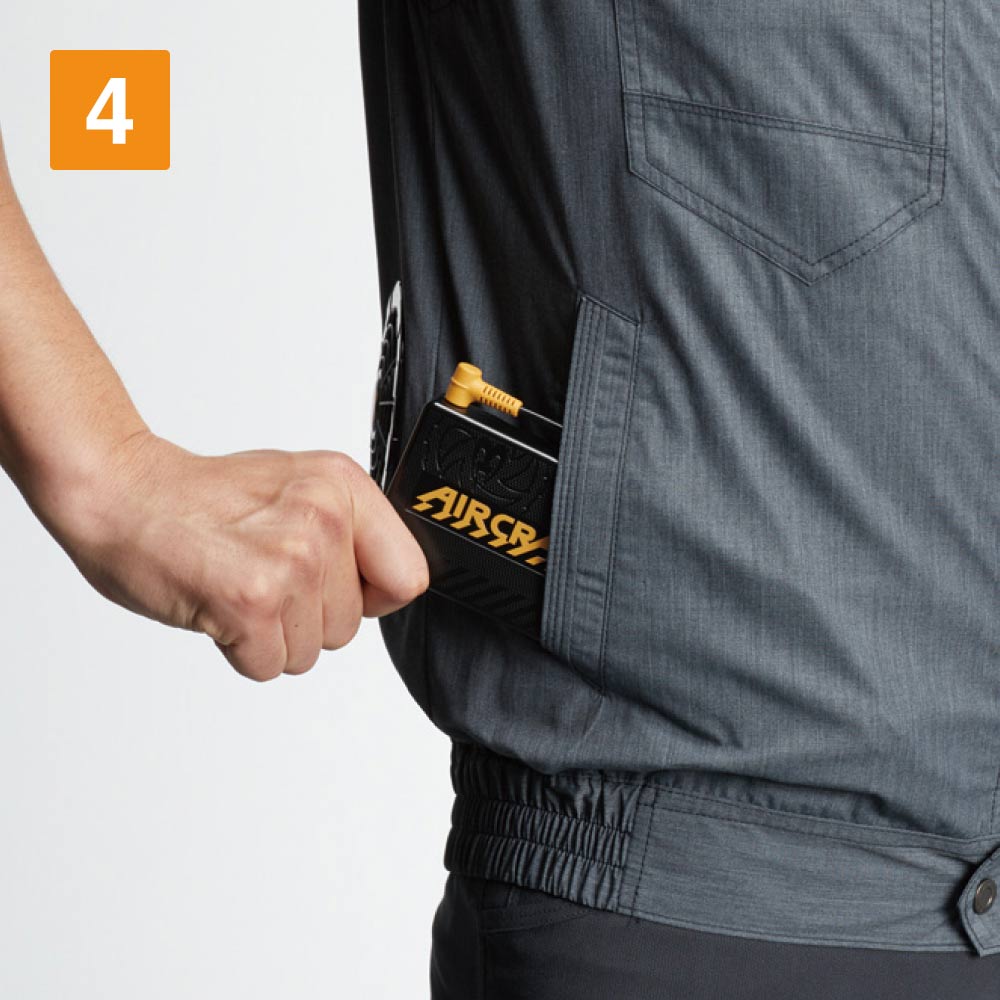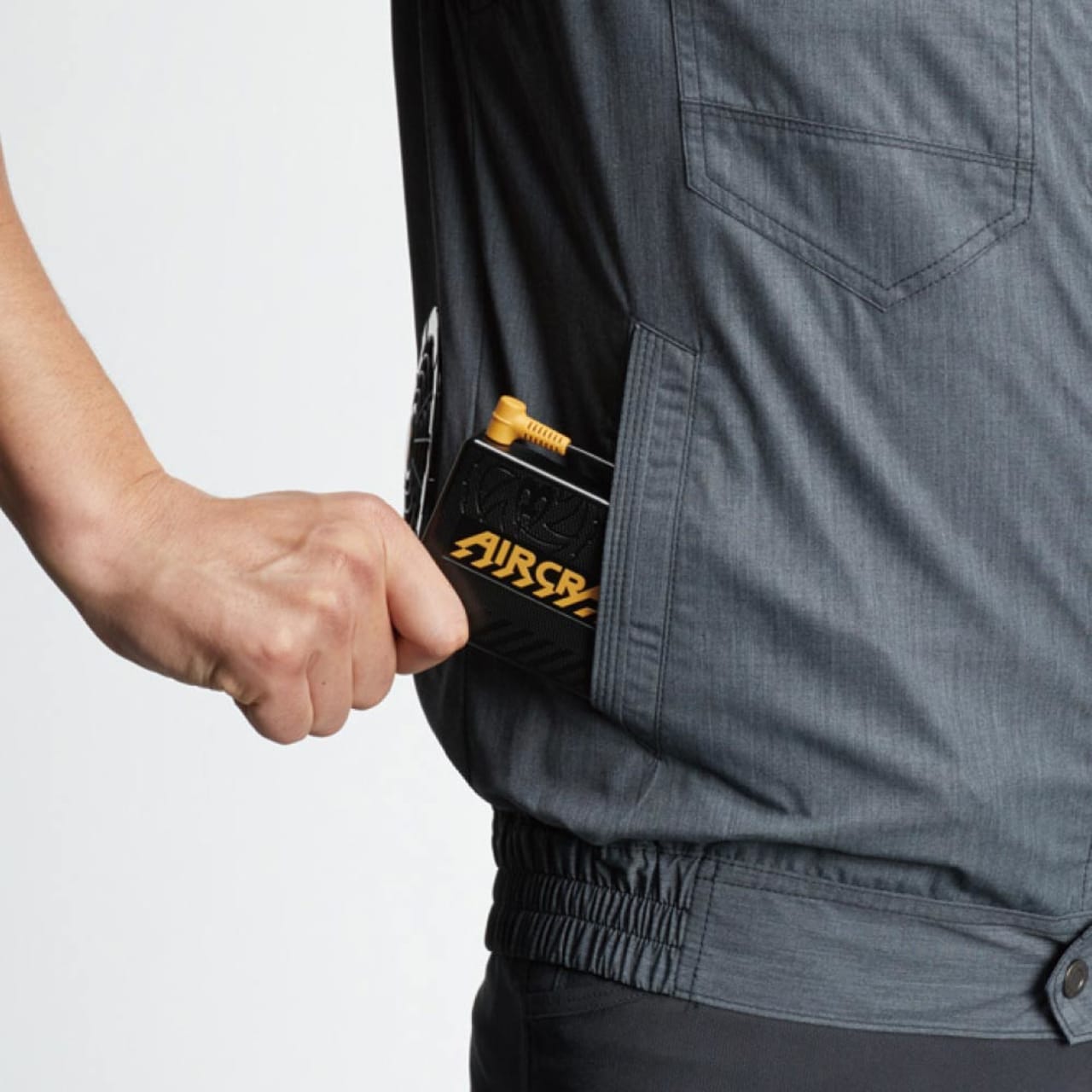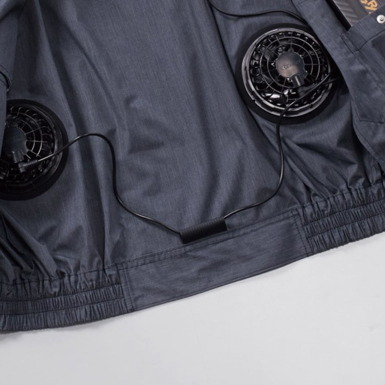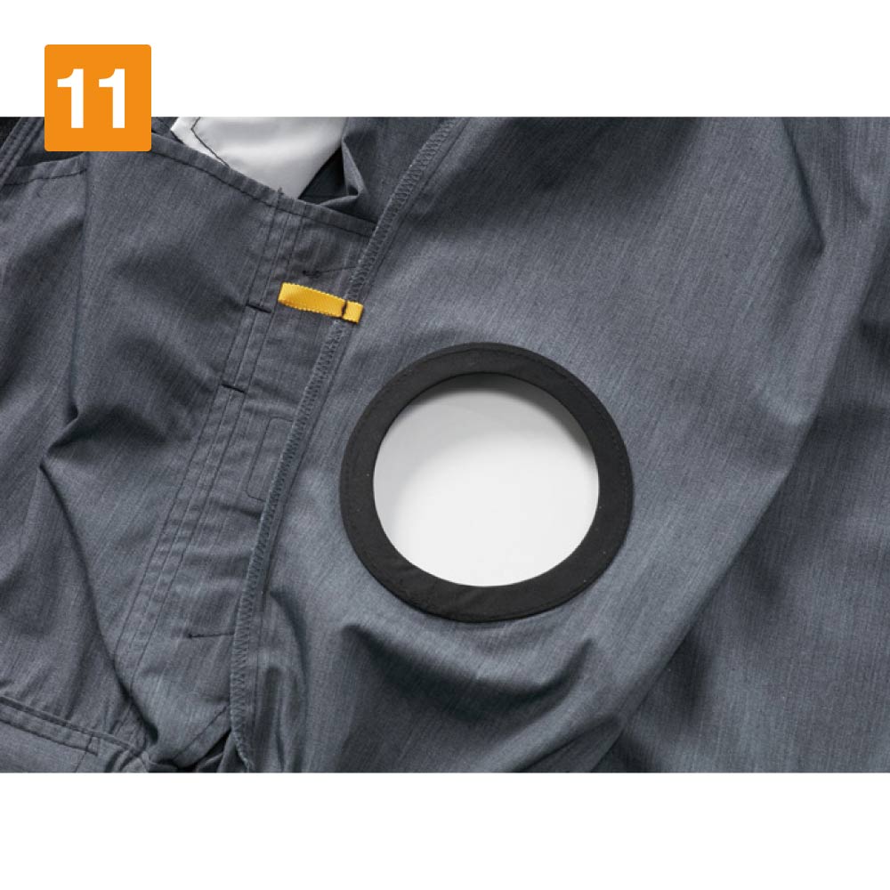 空調機能を支えるディテールの設計も秀逸な空調服です。背中内側に配置されたエアダクトで、通気量の調整が可能に。作業環境やお好みに合わせて、着心地を調整いただけます。また、服内部にはコードを固定するコードストッパーが配置されているので、ひっかかりなどの危険を抑えています。フルハーネス着用にも対応し、背中にはランヤードの取付口が配置されています。スムーズな着用を叶え、デザイン面でのアクセントとしてもおしゃれなディテールとなっています。