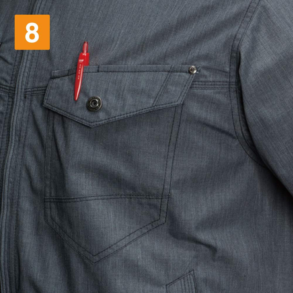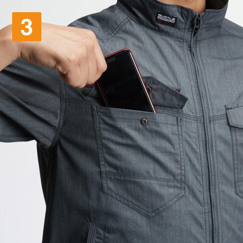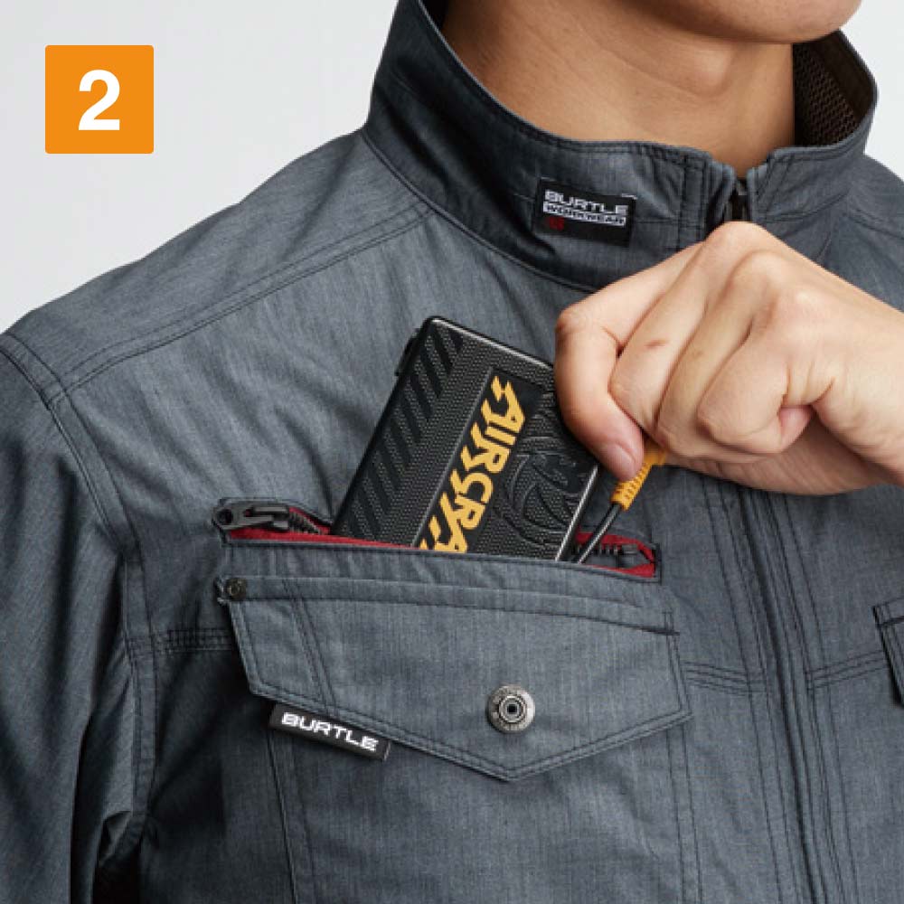 ポケットの少ないイメージがある空調服ですが、収納面でも充実した一着です。レッドファスナーが特徴的な左胸には、バッテリー収納ポケット兼レベルブックも収納可能な大判ポケットが配置されています。さらに左右の胸にはフラップ付きのポケットが。持ち物をすっきりと分けて収納できるので、作業効率もアップします。また、どのポケットも中の物が落下しにくく、高所での作業でも高い安全性をキープします。左胸と左袖には便利なペン差しも。現場での使い勝手にこだわって設計されたウェアです。