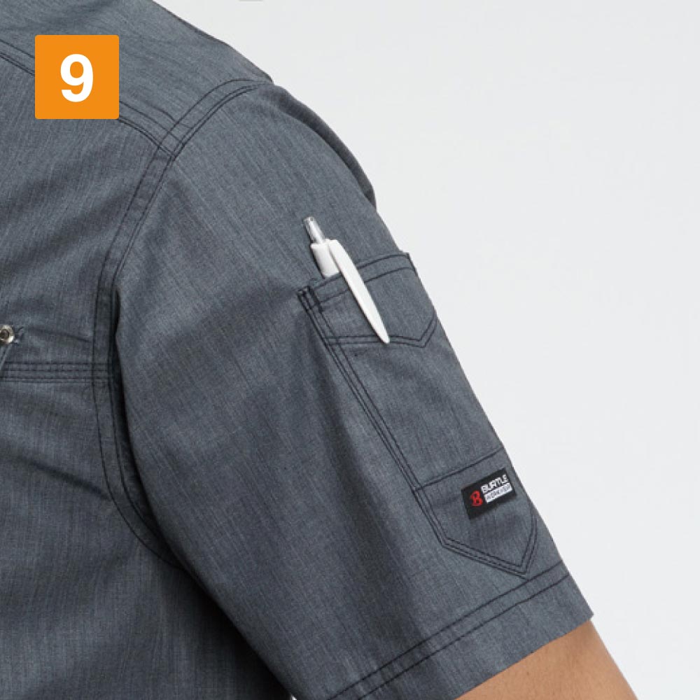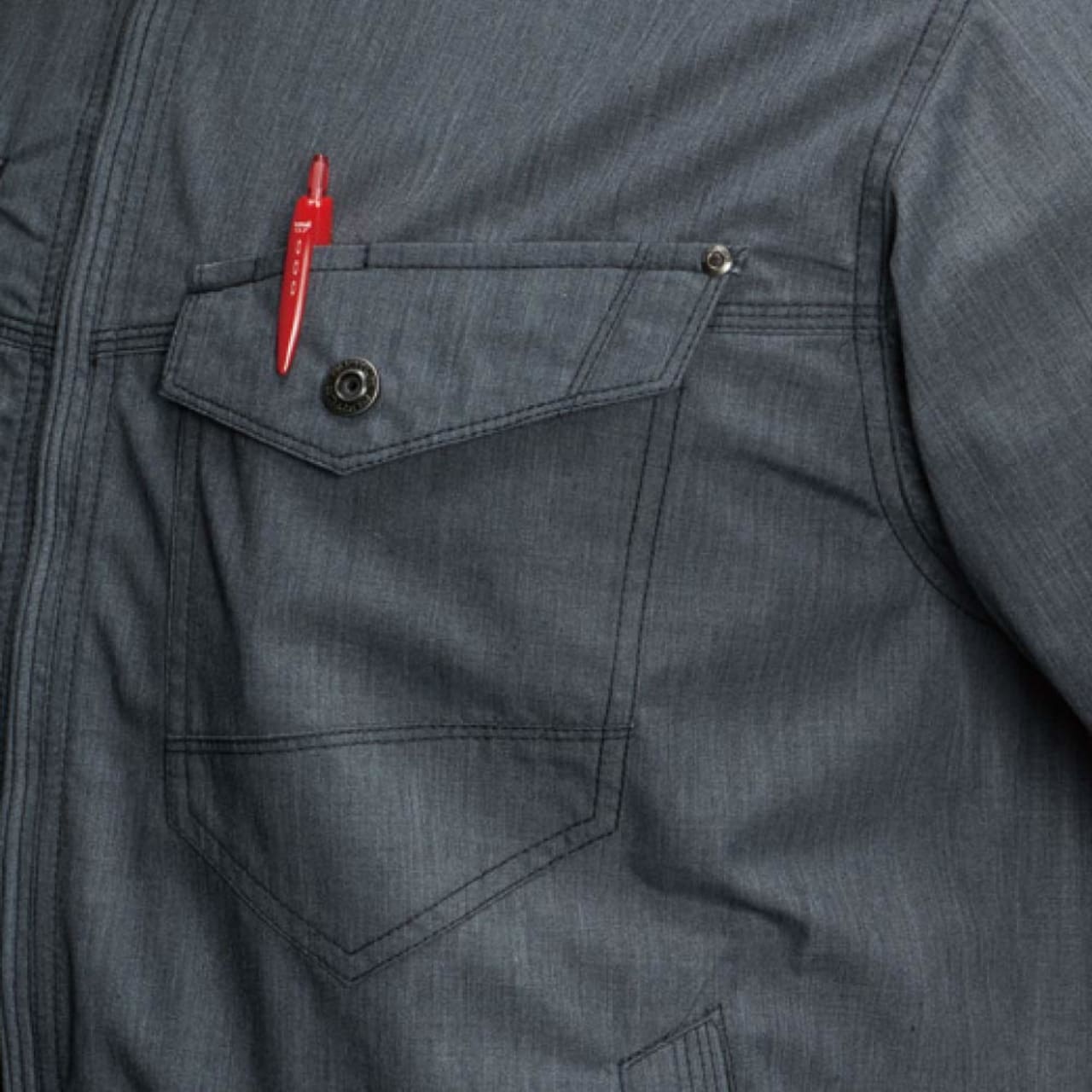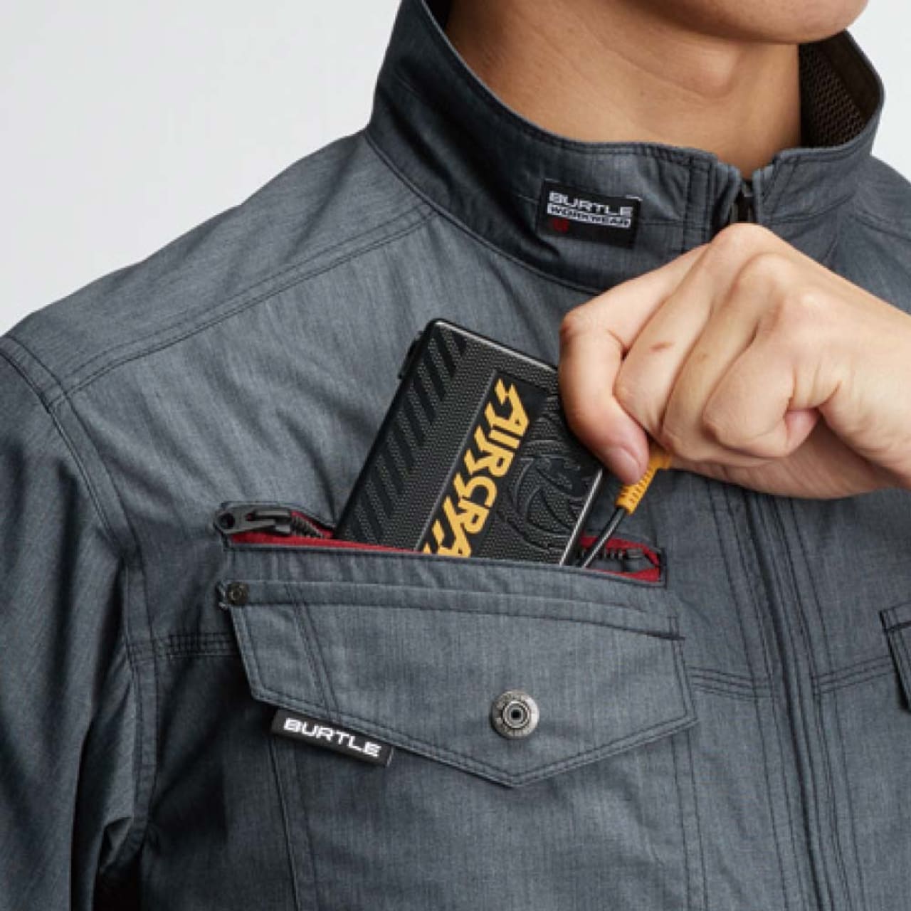 ポケットの少ないイメージがある空調服ですが、収納面でも充実した一着です。レッドファスナーが特徴的な左胸には、バッテリー収納ポケット兼レベルブックも収納可能な大判ポケットが配置されています。さらに左右の胸にはフラップ付きのポケットが。持ち物をすっきりと分けて収納できるので、作業効率もアップします。また、どのポケットも中の物が落下しにくく、高所での作業でも高い安全性をキープします。左胸と左袖には便利なペン差しも。現場での使い勝手にこだわって設計されたウェアです。