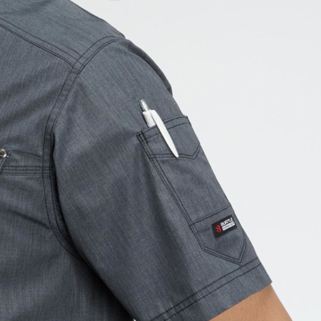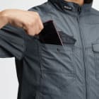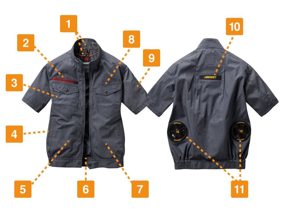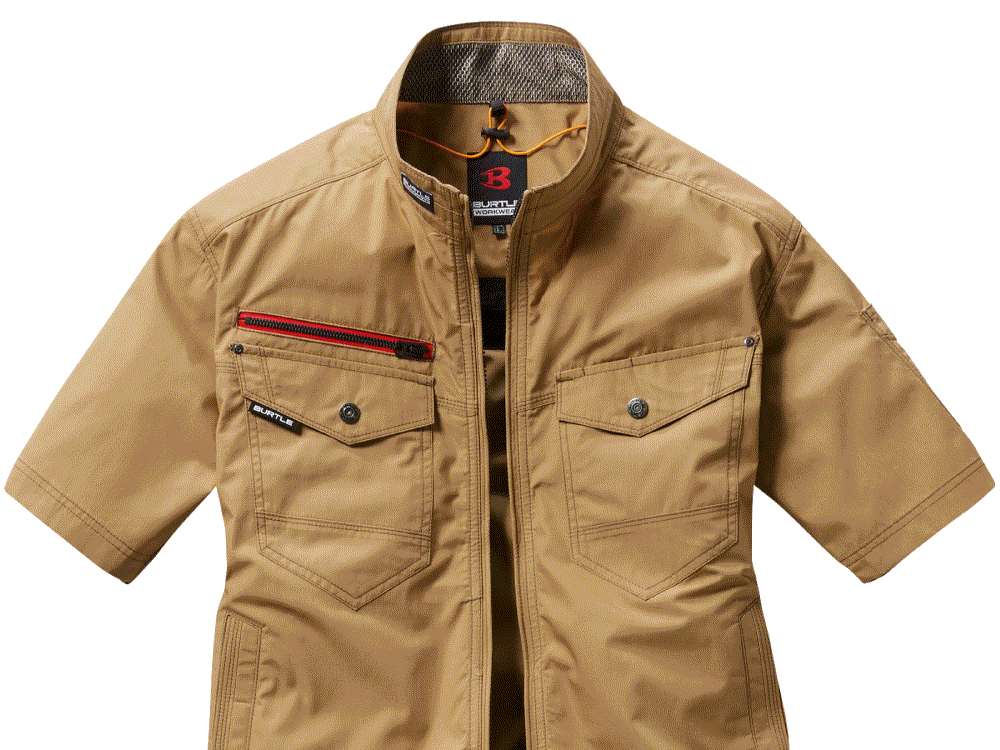 スタイリッシュなデザインと、高機能生地による優れた着心地を両立したウェアです。本体生地に使用されているのは、日本製の高品質T/Cウエザークロス。高密度で空気漏れを防ぎ、高い冷却効果が持ち味です。また、生地にはソフト加工が施され、やわらかな着心地を実現しています。さらに、涼しい着用感を高めるため、汗をかきやすい内側ネック部分には通気性の高いメッシュ生地を採用。汗によって生地が肌にはりつかず、暑さの厳しい環境でも快適な着心地が続きます。