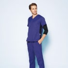 Vネックですっきりとした印象を与える洗練されたスクラブ。スポーツウェアの系譜を汲む、アクティブなお仕事を支える一着です。カラーはそれぞれネイビー・ブラック・プラムを基調とした落ち着いた3色をラインナップ。サイドのラインがアクセントとなり、360°どこから見てもシャープですっきりとした印象を与えます。また、生地の扱いやすさもポイント。本体の素材はポリエステル100%で洗濯にも強く、長く着られるウェアです。