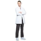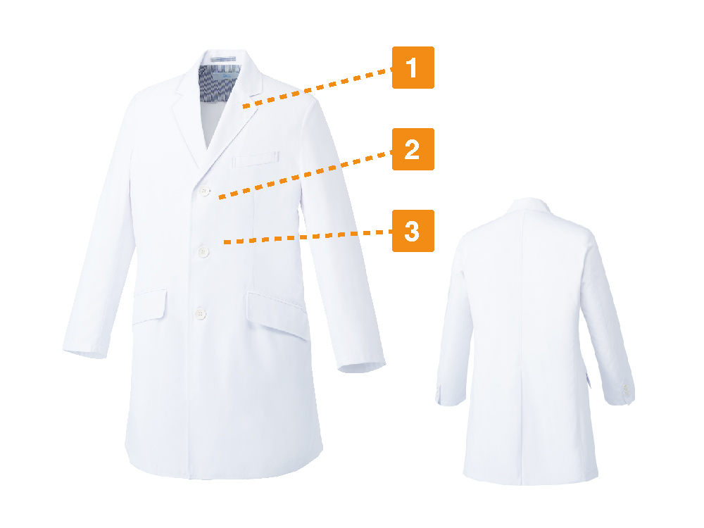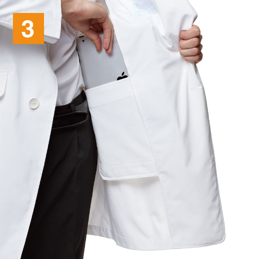 本体の優れた設計だけでなく、メディカルウェアに最適な性能を備えた生地もポイントです。本体生地に使用されているのは、フルダルウエザー。光沢感のないマットな質感が特徴の生地です。光沢感がないことで、生地が透けにくいという特長も。インナーの色を気にせず着ていただけるので、毎日ストレスフリーにお過ごしいただけます。さらに、生地は静電気の発生を低減する制電機能を備え、冬場の不快な服のまとわりつきや、指先からの放電を抑えます。一年中快適に着用いただけるドクターコートです。