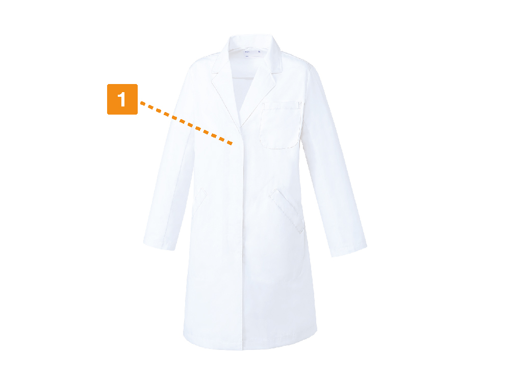 医療の現場に求められるウェアの使い勝手や、衛生面でも配慮の行き届いたドクターコート。収納面では、胸と両腰の3ヵ所にポケットが配置され、持ち物をすっきりと収納可能です。脇ポケットは深めの設計で、物が落ちにくいのもポイント。また、衛星面では業務用の繊維製品を対象とした制菌加工済みのSEKマークの認証を受けています。さらに、生地は防汚加工が施されており、日常的な使用時の汚れがつきにくく、洗濯などでのお手入れもしやすいのが特長です。