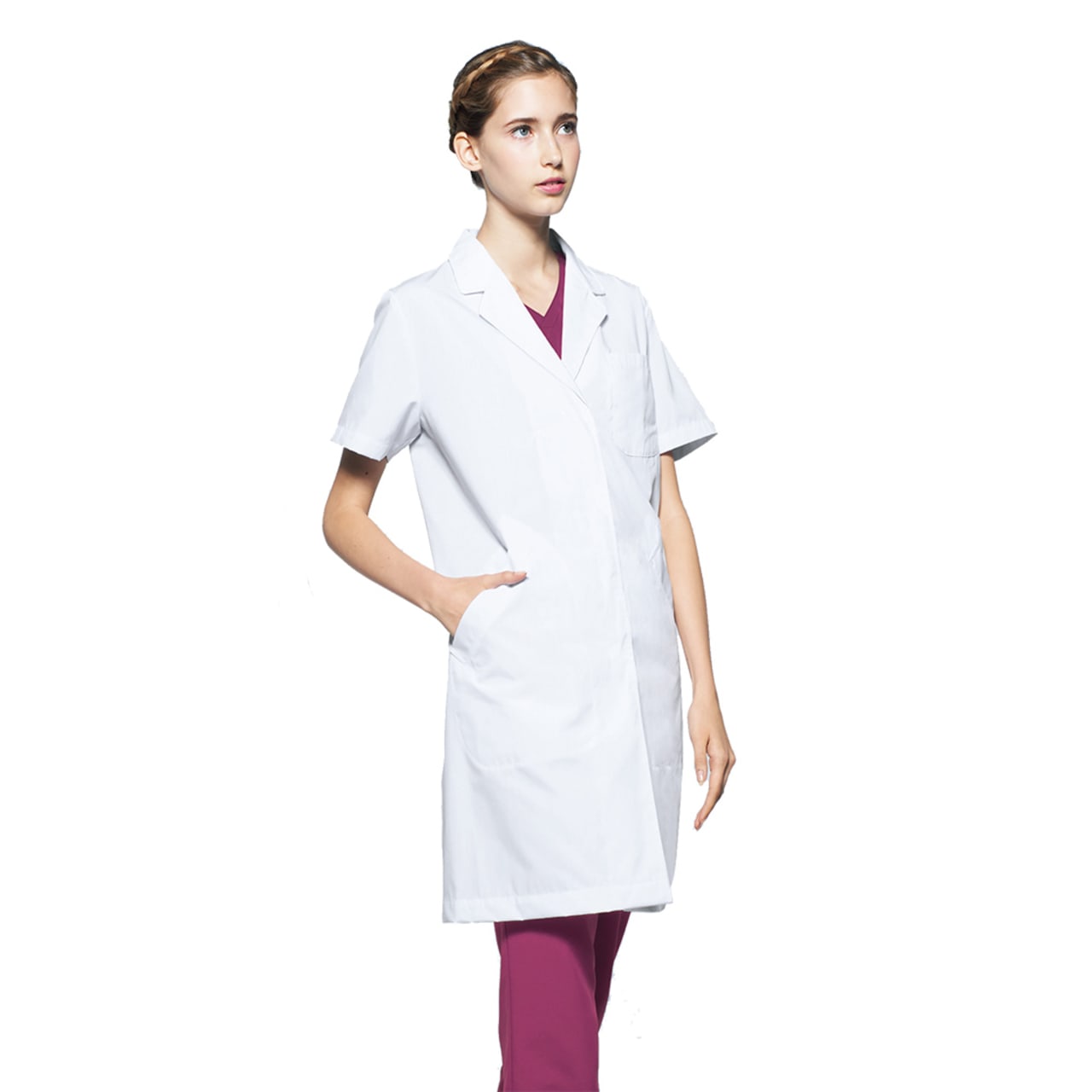 デザイン上の機能に加え、生地の性能も優れたドクターコートです。本体生地に使用されているのは、メディカルウェアへの採用も多いポプリン生地。適度な光沢感と、綿が混紡されていることによるなめらかな肌触りが魅力です。また、生地の大半がポリエステルでできており、洗濯しやすいのも特長。しわになりにくく、毎日のケアもストレスを感じさせません。耐久性も高いので、毎日のヘビーユーズでも長くご愛用いただける一着になっています。