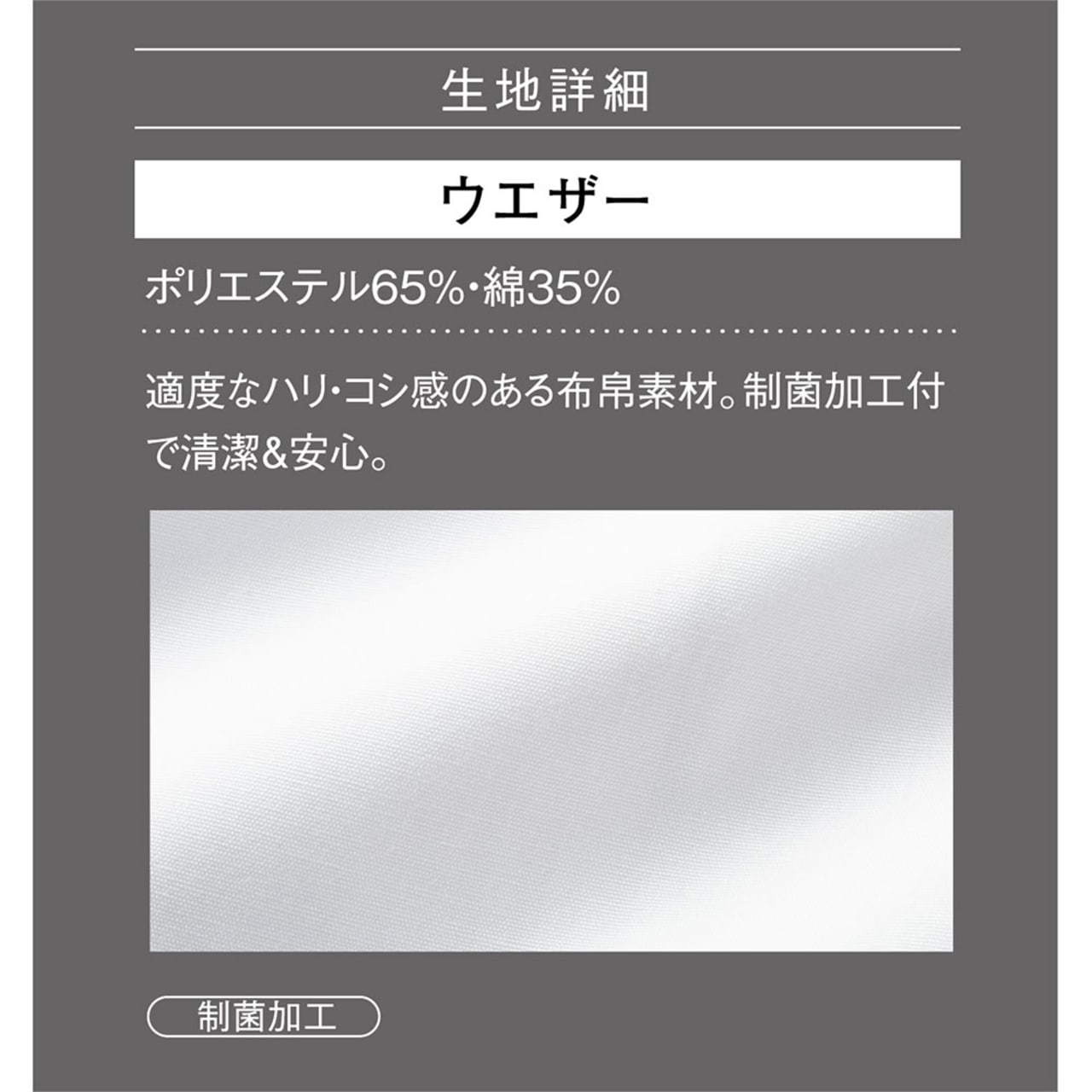 デザイン面での高い機能に加え、生地の持つ性能も優れた一着です。本体生地には適度なハリとコシで高級感を与えてくれる、ウエザー生地が使用されています。へたりにくく、毎日の着用でもくたびれた雰囲気が出にくいのもポイントです。高密度に織り込まれて水にも強い特性を持ち、医療現場にはぴったりの素材。しっかりとした生地感ながら軽量なので、着用による疲労を感じにくいのも魅力のひとつです。また、綿が混紡されていることで、なめらかな肌触りも実現。毎日のお仕事を快適にサポートしてくれるウェアになっています。