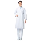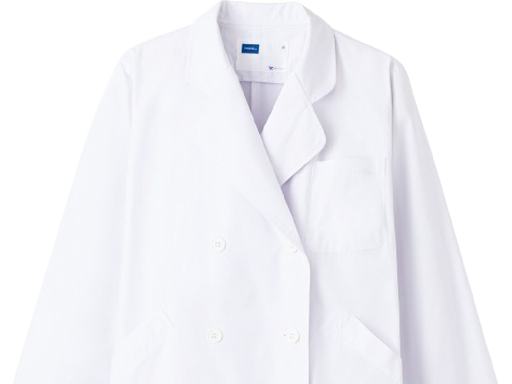 デザイン上の優れた機能に加え、生地の性能も優れた一着です。生地は適度なハリとコシ感のあるウエザー素材。へたりにくくぱりっとした生地感で、ドクターコートに高級感を与えます。高密度に織り込まれた水に強く耐久性の高い生地で、しっかりした生地感ながら軽量なので疲れにくいのもポイント。綿を含んでおり、優しい肌触りで体を包みます。また、SEKマークに認定された高い制菌能力を備え、衛生面にシビアな現場でも安全に着用いただけます。