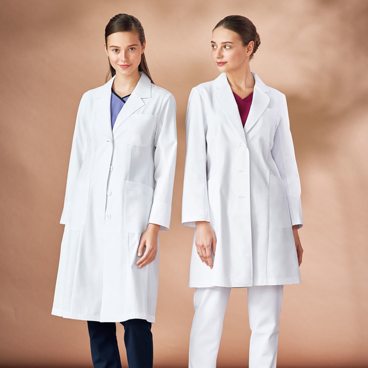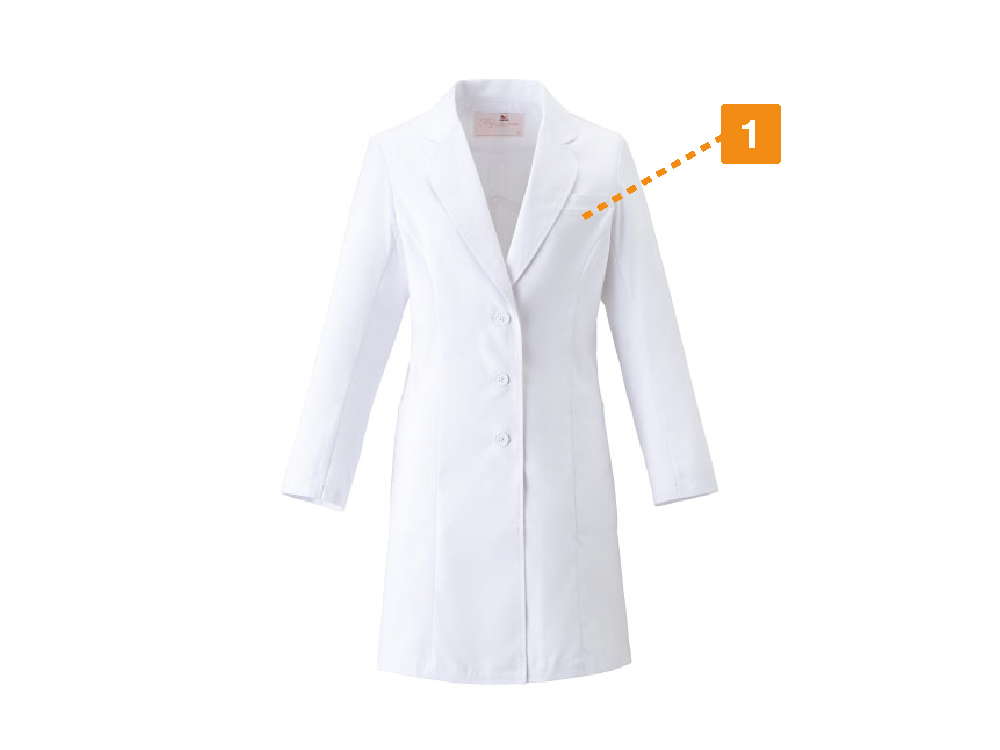 やや短めの太もも丈で、軽快な足さばきを叶えるコートです。白衣にありがちな重たさをなくし、若々しくアクティブな印象をプラス。大きな動作も妨げないので、緊急時にもわずらわしさを感じさせません。また、生地に使用されているのはエスティナストレッチ。ストレッチの名の通り、自然な横方向の伸縮感が、快適な着心地を実現します。ごわっとした固さを感じさせない生地で、適度なハリ感が清潔感をプラス。なめらかな肌触りも人気です。