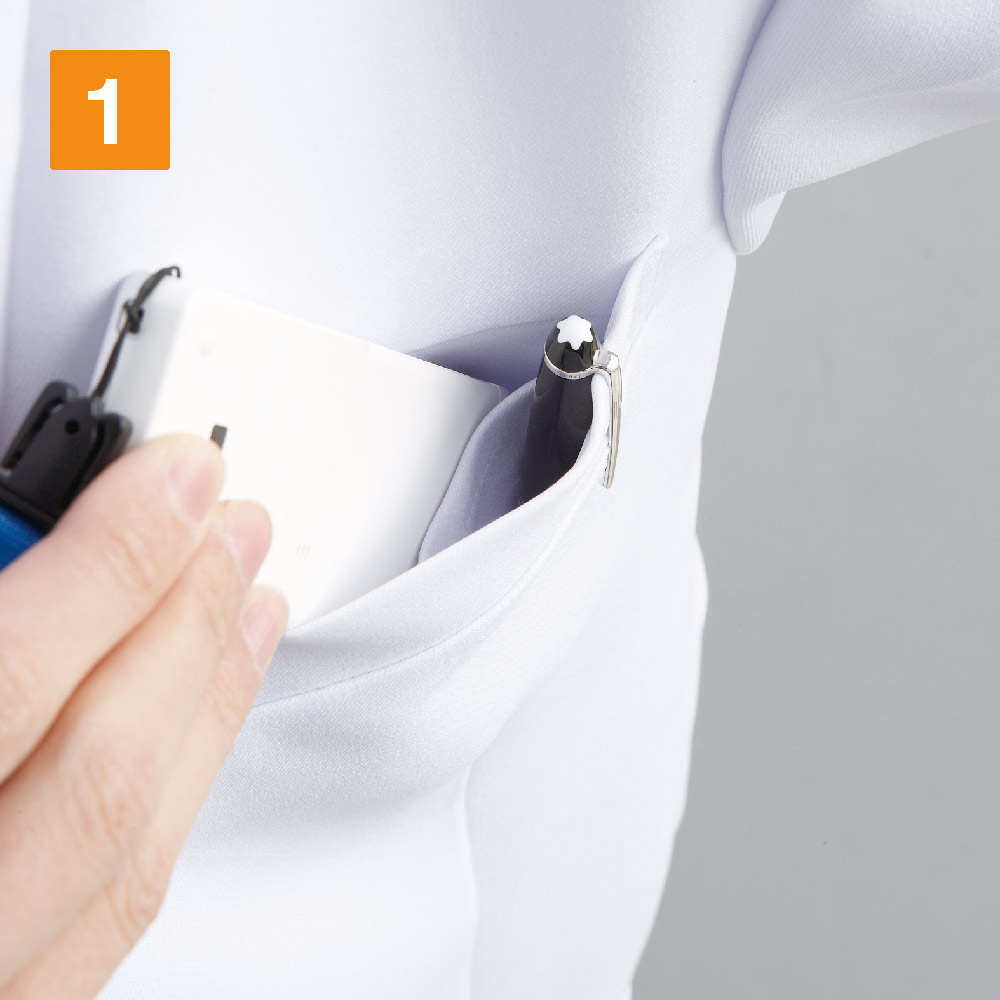 持ち物をすっきり収納できる、高い収納力がスタッフ内でも高評価でした。脇部分の両サイドには、収納力抜群の大判ポケットが配置されています。手帳などもすっぽり入るので、必需品をコートにまとめて持ち運び可能です。また、使用頻度の高い胸ポケットは、中の物を整理しやすい二重ポケット仕様。ペンやスマートフォン、名札などが中でごちゃごちゃにならず、スマートな振る舞いを実現。見た目にもすっきりとした印象のデザインです。