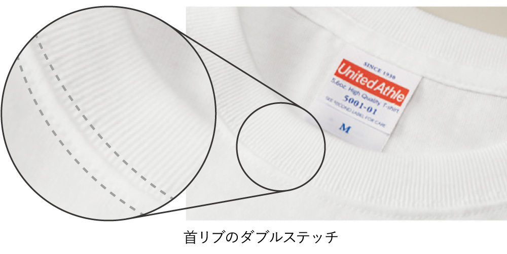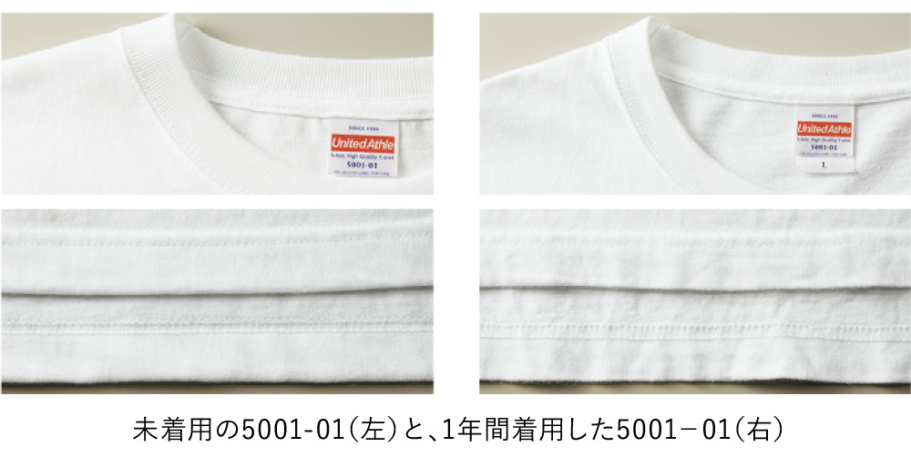 毎日の着用にも自信を持っておすすめできるTシャツです。肌にストレスを感じにくい、やわらかい肌触りがポイント。生地には一般的によく使用されているカード糸ではなく、光沢感となめらかさのあるコーマ糸の性質を持つセミコーマ糸を使用し、上質な肌触りを実現しています。また、首周りのへたりにくさを叶える繊細な工夫も。メインモデルである5001-01モデルおよび02モデルの一部には、首リブに耐久性をアップするダブルステッチが採用されており、長く愛用できる一着に仕上がっています。