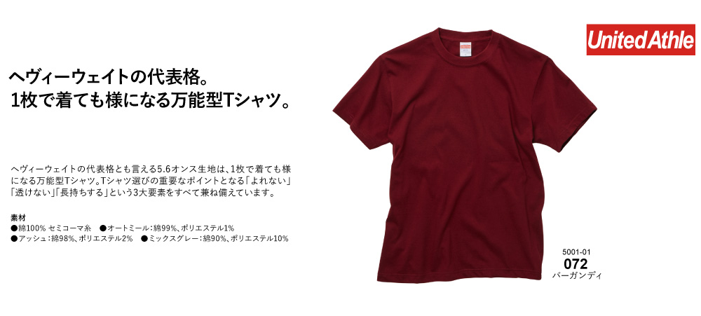 究極のベーシックTシャツ、という印象のアイテムです。Tシャツに強いUnitedAthleが送る上質な生地と緻密なシルエットが、Tシャツながら高級感すら感じる仕上がりになっています。使用されている厚手生地はただ分厚いだけでなく、肌触りもやわらかくなめらか。さらにしっかりした厚みにより透けないのもポイントで、1枚で着るTシャツとして最適な仕上がりになっています。シルエットは、どのデザインも1枚で着てかっこよく決まることに重きをおかれた妥協のない設計。体につかず離れずのゆとり感が、こなれた雰囲気を演出します。