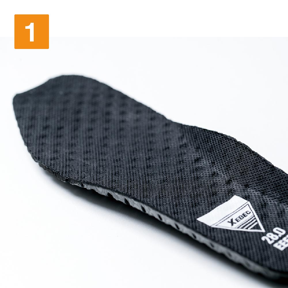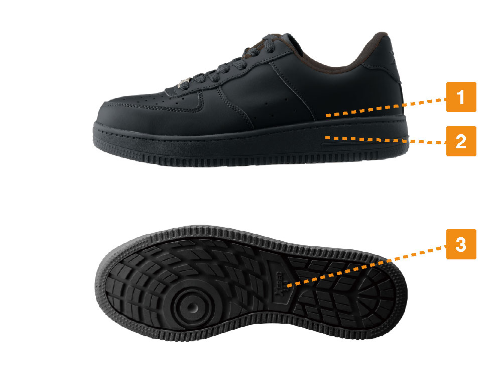 シンプルなルックスながら、優れた機能性を備えた安全靴です。特長はそのアウトソール。計算されたゴムの配合と溝のデザインで、水はもちろん油に対しても滑りにくい特性を備えています。屋外や油分を扱う現場など、多様な環境で活躍いただけるシューズです。また、インソールとミッドソールにはEVA素材が使用されています。軽量かつクッション性に優れ、足の疲労を低減する効果が期待できます。さらに、インソールは穴あき加工が施されているので、汗による蒸れなどを解消。常に心地よい着用感が続きます。