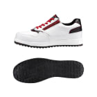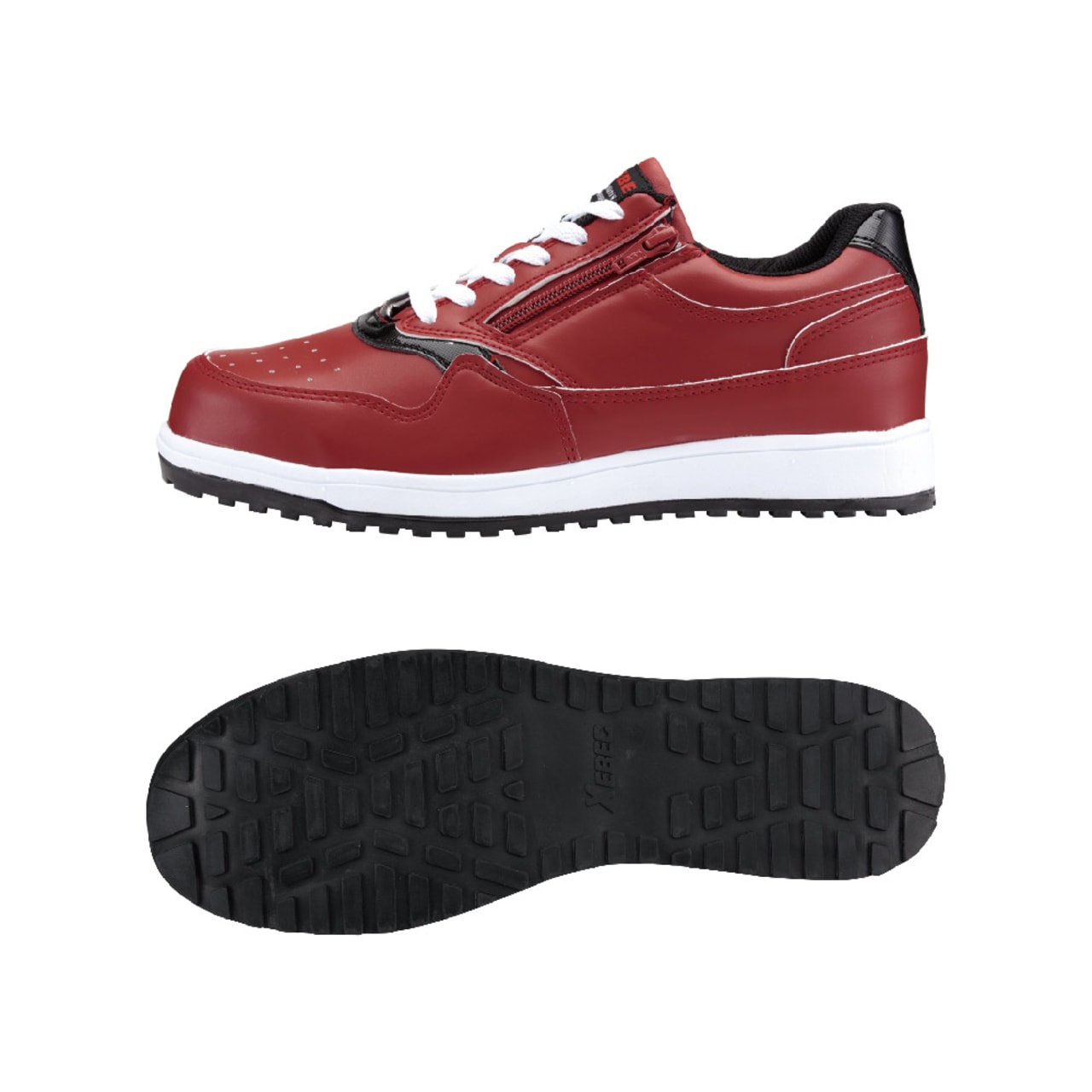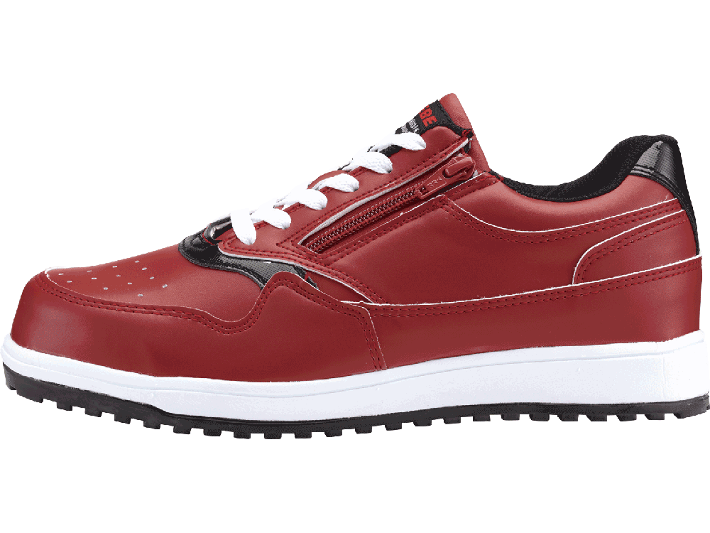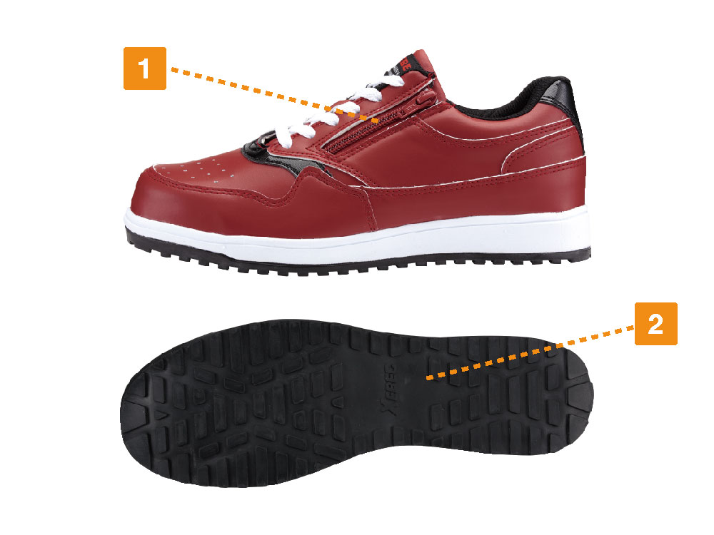 EVAとラバーを使用した、耐滑性の高いシューズです。滑りにくさを追求したゴムの配合比率で、キューブ状の滑り止め形状を採用した底面が、地面をしっかりとキャッチ。水はもちろん油でも滑りにくく、安全な作業性を実現しています。また、動きやすいローカットデザインを採用し、足首周りもすっきりと軽快な動作性を実現。アッパー側面には着脱しやすいサイドファスナーが設けられ、脱ぎ履きの多い現場でも使い勝手のいい一足に仕上がっています。