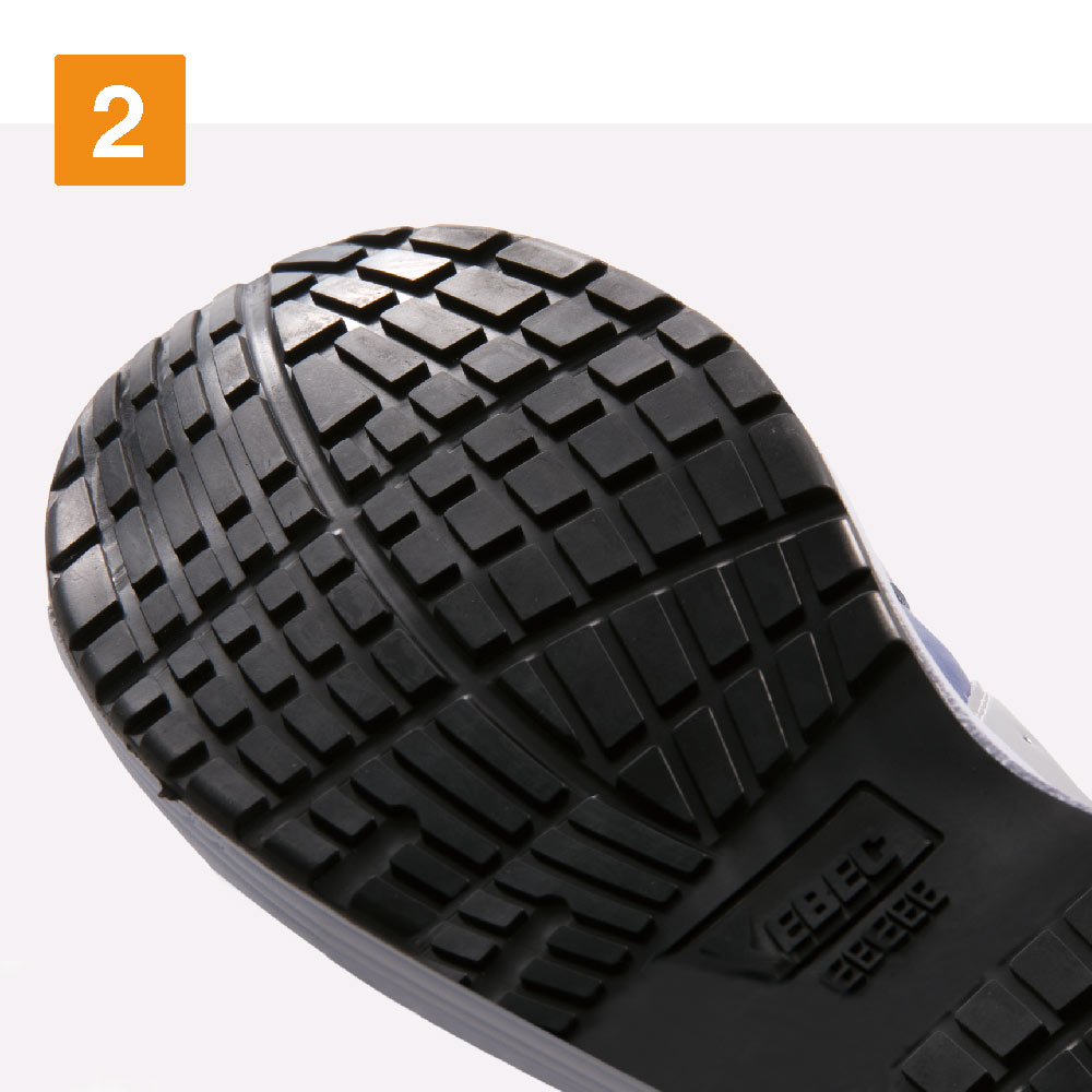 水や油と接触する滑りやすい現場におすすめの、高い耐滑性を備えたシューズです。ポイントはアウトソールの設計。滑りにくさをアップするラバーの配合比率や、溝のデザインが抜群のグリップ力を実現しています。また、EVA素材を使用した軽量ソールがつくる履き心地も魅力的。ミッドソールは衝撃吸収性に優れ、足への負荷を大幅に低減する仕様です。さらにインソールは立体形状になっており、足にしっかりフィットしフットワークをサポートします。
