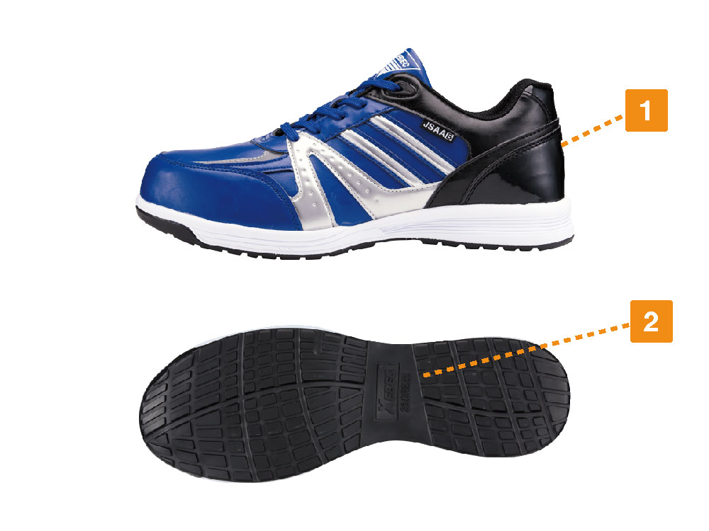 滑りにくさだけでなく、充実の機能面も魅力の安全靴です。つま先には樹脂先芯を使用し、軽量ながら鋼製先芯と変わらない強度で足を保護します。また、ソールの衝撃吸収性に加えJSAA規格 B種に認定されたかかと部の高い衝撃吸収力が、より足へのダメージを軽減。さらに、かかと部分には反射材があしらわれ、夜間や暗所での視認性をアップしています。他にも、結んだ靴ヒモを収納しておける「ひもポケ」や、中底に施された抗菌・防臭加工など、様々な方面で充実の機能を備えたシューズです。
